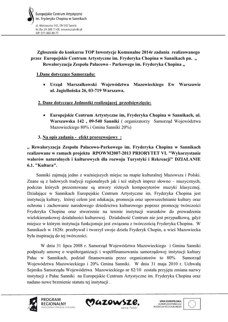 Zgłoszenie do konkursu TOP Inwestycje Komunalne 2014r zadania realizowanego przez Europejskie Centrum Artystyczne im. Fryderyka Chopina w Sannikach pn. ,, Rewaloryzacja Zespołu Pałacowo - Parkowego im. Fryderyka Chopina „ 1.Dane dotyczące Samorządu: Urząd Marszałkowski Województwa Mazowieckiego Ew Warszawie ul. Jagiellońska 26, 03-719 Warszawa. 2. Dane dotyczące Jednostki realizującej przedsięwzięcie: Europejskie Centrum Artystyczne im, Fryderyka Chopina w Sannikach, ul. Warszawska 142 , 09-540 Sanniki ( organizatorzy Samorząd Województwa Mazowieckiego 80% i Gmina Sanniki 20%) 3. Na opis zadania - efekt prorozwojowy : ,, Rewaloryzacja Zespołu Pałacowo-Parkowego im. Fryderyka Chopina w Sannikach realizowane w ramach projektu RPOWM2007-2013 PRIORYTET VI. "Wykorzystanie walorów naturalnych i kulturowych dla rozwoju Turystyki i Rekreacji" DZIAŁANIE 6.1. "Kultura". Sanniki zajmują jedno z ważniejszych miejsc na mapie kulturalnej Mazowsza i Polski. Znane są z ludowych tradycji regionalnych jak i też stałych imprez słowno – muzycznych, podczas których prezentowane są utwory różnych kompozytorów muzyki klasycznej. Działające w Sannikach Europejskie Centrum Artystyczne im. Fryderyka Chopina jest instytucją kultury, której celem jest edukacja, promocja oraz upowszechnianie kultury oraz ochrona i zachowanie narodowego dziedzictwa kulturowego poprzez promocję twórczości Fryderyka Chopina oraz stworzenie na terenie instytucji warunków do prowadzenia wielokierunkowej działalności kulturowej. Działalność Centrum nie jest przypadkową, gdyż miejsce w którym instytucja funkcjonuje jest związana z twórczością Fryderyka Chopina. W Sannikach w 1828r. przebywał i tworzył swoje dzieła Fryderyk Chopin, a wieś Mazowiecka była inspiracją do tej twórczości. W dniu 31 lipca 2008 r. Samorząd Województwa Mazowieckiego i Gmina Sanniki podpisały umowę o współorganizacji i współfinansowaniu samorządowej instytucji kultury Pałac w Sannikach, podział finansowania przez organizatorów to 80% Samorząd Województwa Mazowieckiego i 20% Gmina Sanniki. W dniu 31 maja 2010 r. Uchwałą Sejmiku Samorządu Województwa Mazowieckiego nr 82/10 została przyjęta zmiana nazwy instytucji z Pałac Sanniki na Europejskie Centrum Artystyczne im. Fryderyka Chopina oraz nadano nowe brzmienie statutu tej instytucji . 15 grudnia 2009 r. dyrektor Pałacu Monika Patrowicz podpisała umowę na realizację zadania pn. ,, Rewaloryzacja Zespołu Pałacowo -Parkowego im. Fryderyka Chopina „ zadanie realizowane w ramach projektu RPOWM2007-2013 PRIORYTET VI. "Wykorzystanie walorów naturalnych i kulturowych dla rozwoju Turystyki i Rekreacji" DZIAŁANIE 6.1. "Kultura". Projekt obejmował remont kapitalny oraz modernizację zabytkowego Zespołu PałacowoParkowego z otaczającym go parkiem. Priorytetowym zamysłem projektu było zmodernizowanie i wyposażone pałacowych sal, a w nowo zaaranżowanych pomieszczeniach stworzenie warunków, które będą pełnić funkcje koncertowo-muzyczne, wystawiennicze i edukacyjne. Zasadnicze cele Projektu to: przywrócenie świetności obiektu, stworzenia możliwości pełniących funkcje koncertowe, wystawiennicze i edukacyjne, stworzenie możliwości pełniejszego wykorzystania kulturalnego obiektu o zasięgu krajowym i zagranicznym, dostosowania obiektu dla potrzeb osób niepełnosprawnych, wskrzeszanie i kultywowanie bogactwa kulturowego ziemi sannickiej i regionu Mazowsza, rozwój Turystyki i rekreacji. Z początkiem 2011r w pałacowych wnętrzach rozpoczęły się pierwsze prace remontowe za zgodą i pod nadzorem Konserwatora Zabytków. Prace remontowe objęły: rozebranie istniejących stropów i posadzek oraz wykonanie nowych, wzmocnienie murów, wymianę drewnianej konstrukcji dachu wraz z pokryciem dachu, wymianę stolarki okiennej i drzwiowej, wymianę stropu wieży widokowej, wymianę instalacji wewnętrznych. Została odbudowana oranżeria, na terenie parku poczyniono prace rewitalizacyjne przy zieleni, pobudowano na terenach rekreacyjno- sportowych boiska z nawierzchnią poliuretanową. Wytyczono alejki parkowe i parkingi nałożono nawierzchnię Hanse Grand oraz nowe nasadzenia drzew i krzewów. Utwardzony został płytami kamiennymi teren przed sceną letnią. Wykonano instalację oświetleniową alej parkowych. Stawy na terenie parku zostały poddane bagrowaniu, wyregulowano linię brzegową. W listopadzie 2012 r. zakończono I etap prac remontowych, została wmurowana kapsuła czasu zawierająca akt pamiątkowy oraz inne dokumenty potwierdzające realizację inwestycji. Ukończono prace nad odtwarzaniem historycznych malowideł ściennych w 6 wnętrzach pałacu, a następnie prace w części biurowej i części przeznaczonej na działalność koncertowo - wystawienniczą ( malowanie ścian, układanie glazury, montaż posadzek i parkietów). 7 lipca 2013 r. został oddany dla turystów kompleks parkowy, do pałacu powróciły cykliczne Koncerty chopinowskie. Do sali koncertowej zakupiono nowy fortepian oraz instrumenty muzyczne do Sali warsztatów muzycznych. Zaadaptowano pomieszczenia na Dom Pracy Twórczej dla artystów, w którym będą odbywać się warsztaty prowadzone przez zapraszanych gości. Zmodernizowane zostały pomieszczenia biblioteki muzycznej, dostosowane sprzętem do potrzeb dzisiejszych czasów. Odtworzono oranżerię, miejsca kawiarniano-cukierniczego, które z pewnością uprzyjemni turystom pobyt w Sannikach. W kolejnych etapach inwestycji przebudowano pomieszczenia z przeznaczeniem na część administracyjno - biurową z wyposażeniem ich w sprzęt nierozerwalnie związany z funkcjonowaniem obiektu. Obiekt został dostosowany dla potrzeb osób niepełnosprawnych. W ramach aranżacji parku zostały wykonane nowe nasadzenia drzew i kwiatów. Obecnie Centrum jest w ostatnim etapie inwestycji wyposażenie w meble i sprzęt związany z funkcjonowaniem obiektu. Całkowite zakończenie realizowanego projektu p