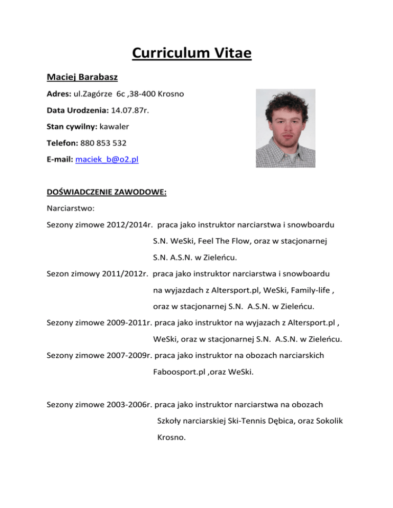 Curriculum Vitae Maciej Barabasz Adres: ul.Zagórze 6c ,38-400 Krosno Data Urodzenia: 14.07.87r. Stan cywilny: kawaler Telefon: 880 853 532 E-mail: [email protected] DOŚWIADCZENIE ZAWODOWE: Narciarstwo: Sezony zimowe 2012/2014r. praca jako instruktor narciarstwa i snowboardu S.N. WeSki, Feel The Flow, oraz w stacjonarnej S.N. A.S.N. w Zieleocu. Sezon zimowy 2011/2012r. praca jako instruktor narciarstwa i snowboardu na wyjazdach z Altersport.pl, WeSki, Family-life , oraz w stacjonarnej S.N. A.S.N. w Zieleocu. Sezony zimowe 2009-2011r. praca jako instruktor na wyjazach z Altersport.pl , WeSki, oraz w stacjonarnej S.N. A.S.N. w Zieleocu. Sezony zimowe 2007-2009r. praca jako instruktor na obozach narciarskich Faboosport.pl ,oraz WeSki. Sezony zimowe 2003-2006r. praca jako instruktor narciarstwa na obozach Szkoły narciarskiej Ski-Tennis Dębica, oraz Sokolik Krosno. Windsurfing: Sezon letni 2010r.-2013r. praca jako instruktor windsurfingu w Szkole ABCsurf, na kempingu Małe Morze-Władysławowo. 1.07.2009r. – 5.09.2009r. praca jako instruktor windsurfingu w Szkole Surf Sport Mistral w Juracie. Sezon letni 2005r.-2008r. praca jako instruktor windsurfingu oraz pomoc w pracach bosmaoskich w Bazie Sportów Wodnych AZS-UR nad Zalewem Solioskim. WYKSZTAŁCENIE: 2011- do dziś Studia Uzupełniające Magisterskie , kierunek Wychowanie Fizyczne, na AWF we Wrocławiu. 2009- 2012 Studia Uzupełniające Magisterskie , kierunek Fizjoterapia, na AWF we Wrocławiu. 2007- 2012 Studia Licencjackie , kierunek Wychowanie Fizyczne, na AWF we Wrocławiu. 2006-2009 Studia Licencjackie, kierunek Fizjoterapia, na AWF we Wrocławiu. 2003-2006 I Liceum Ogólnokształcące im.Mikołaja Kopernika w Krośnie. JĘZYKI OBCE: Język angielski – komunikatywnie (matura podstawowa 96%, rozszerzona 55%) UPRAWNIENIA : 2014r. Międzynarodowy zawodowy instruktor narciarstwa ISIA SITN-PZN. 2013r. Spelnienie limitów z jazdy technicznej oraz jazdy sportowej, do legitymacji ISIA oraz asystenta IW. 2013r. Kurs skiturowy SITN-PZN. 2012r. Kurs lawinowy SITN-PZN. 2010-2011r. Instruktor sportu osób niepelnosprawnych -Koszykówka na wózkach, AWF Wrocław. 2010-2011r. Instruktor Snowboardu MENiS oraz SITS- Specjalizacja instruktorska, AWF Wrocław. 2010r. Instruktor Narciarstwa SITN-PZN. 2008r.-2009r. Instruktor Windsurfingu MENiS- Specjalizacja Instruktorska, AWF Wrocław. 2009r. Kurs Wychowawcy Kolonijnego. 2006r.-2007r. Instruktor Narciarstwa MENiS-Specjalizacja instruktorska, AWF Wrocław. 2006r. Kurs Kwalifikowanej Pierwszej Pomocy Medycznej. 2005r. Prawo jazdy, kategoria B . 2004r. Patent Sternika Motorowodnego. 2003r. Patent Żeglarza Jachtowego. 2003r. Pomocnik Instruktora SITN-PZN w Narciarstwie Alpejskim. Wyrazam zgode na przetwarzanie moich danych osobowych zawartych w mojej ofercie pracy dla potrzeb niezbednych do realizacji rekrutacji zgodnie z Ustawa z dn. 29.08.97 r. o Ochronie Danych Osobowych (Dz. U. nr 133 poz. 883).