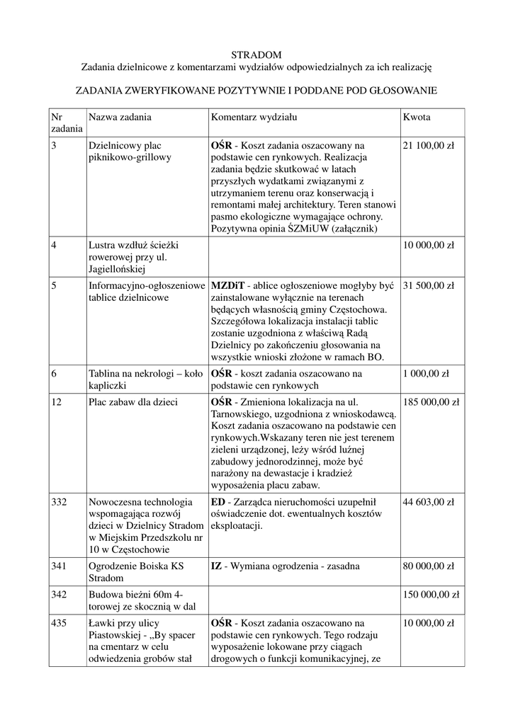 STRADOM Zadania dzielnicowe z komentarzami wydziałów odpowiedzialnych za ich realizację ZADANIA ZWERYFIKOWANE POZYTYWNIE I PODDANE POD GŁOSOWANIE Nr Nazwa zadania zadania Komentarz wydziału Kwota 3 Dzielnicowy plac piknikowo-grillowy 21 100,00 zł OŚR - Koszt zadania oszacowany na podstawie cen rynkowych. Realizacja zadania będzie skutkować w latach przyszłych wydatkami związanymi z utrzymaniem terenu oraz konserwacją i remontami małej architektury. Teren stanowi pasmo ekologiczne wymagające ochrony. Pozytywna opinia ŚZMiUW (załącznik) 4 Lustra wzdłuż ścieżki rowerowej przy ul. Jagiellońskiej 5 Informacyjno-ogłoszeniowe MZDiT - ablice ogłoszeniowe mogłyby być 31 500,00 zł zainstalowane wyłącznie na terenach tablice dzielnicowe będących własnością gminy Częstochowa. Szczegółowa lokalizacja instalacji tablic zostanie uzgodniona z właściwą Radą Dzielnicy po zakończeniu głosowania na wszystkie wnioski złożone w ramach BO. 6 Tablina na nekrologi – koło OŚR - koszt zadania oszacowano na kapliczki podstawie cen rynkowych 12 Plac zabaw dla dzieci 332 Nowoczesna technologia ED - Zarządca nieruchomości uzupełnił wspomagająca rozwój oświadczenie dot. ewentualnych kosztów dzieci w Dzielnicy Stradom eksploatacji. w Miejskim Przedszkolu nr 10 w Częstochowie 341 Ogrodzenie Boiska KS Stradom 342 Budowa bieżni 60m 4torowej ze skocznią w dal 435 Ławki przy ulicy Piastowskiej - „By spacer na cmentarz w celu odwiedzenia grobów stał 10 000,00 zł 1 000,00 zł OŚR - Zmieniona lokalizacja na ul. 185 000,00 zł Tarnowskiego, uzgodniona z wnioskodawcą. Koszt zadania oszacowano na podstawie cen rynkowych.Wskazany teren nie jest terenem zieleni urządzonej, leży wśród luźnej zabudowy jednorodzinnej, może być narażony na dewastacje i kradzież wyposażenia placu zabaw. IZ - Wymiana ogrodzenia - zasadna 44 603,00 zł 80 000,00 zł 150 000,00 zł OŚR - Koszt zadania oszacowano na podstawie cen rynkowych. Tego rodzaju wyposażenie lokowane przy ciągach drogowych o funkcji komunikacyjnej, ze 10 000,00 zł się wygodniejszy dla mieszkańców dzielnicy i Częstochowy” względu na ogromne rozproszenie na terenie miasta, generuje szczególnie duże koszty utrzymania przy stosunkowo małej użyteczności. Usytuowanie ławek musi pociągać za sobą lokalizację koszy na śmieci i konieczność regularnego ich opróżniania oraz dbałość o rozlokowane wyposażenie. 442 Piknik rodzin ze Stradomia 5 000,00 zł 515 Ogólnodostępne PlayStation 4 5 000,00 zł 529 Siłownia „Pod Stradomską chmurką” 556 Lustro przy ul. Poniatowskiego wzdłuż drogi rowerowej na ul. Jagiellońskiej 560 Doposażenie OSP Kawodrza Górna OŚR - brak kosztorysu we wniosku, koszty realizacji zadania sporządzono w oparciu o aktualnie realizowane podobne zadania i doliczono koszty nawierzchni pod urzadzeniami 130 000,00 zł 2 000,00 zł KOSO - Sprzęt pożarniczy dla OSP 65 000,00 zł Kawodrza Górna będzie używany, w szerokim spektrum działań ratowniczogaśniczych. Szczegółowa wykaz asortymentu dla ww. OSP określony został w formularzu. Na koszty przyszłej eksploatacji zaliczyć należy wydatki na: - bieżące naprawy, - zakupy części eksploatacyjnych, obowiązkowe przeglądy i legalizacje. Wydatki te będzie pokrywał Wydział Zarządzania Kryzowego, Ochrony Ludności i Spraw Obronnych Urzędu Miasta Częstochowy w ramach budżetu przeznaczonego na zabezpieczenie gotowości bojowej jednostek OSP. Uwaga. W formularzu nie sprecyzowano ilości sprzętu, nie udało też się skontaktować z wnioskodawcą. Z uwagi na ten fakt jako wartość realizacji zadania przyjęto kwotę zgłoszoną w formularzu. ZADANIA ZWERYFIKOWANE NEGATYWNIE Nr Nazwa zadania zadania Komentarz wydziału 25 MZDiT - Opinia negatywna dla przedmiotowego wniosku. Niezgodność z §8 ust.6. pkt 2 Rozporządzenia Ministra Infrastruktury z dnia 23 września 2003 r. w sprawie szczegółowych warunków zarządzania ruchem na drogach oraz wykonywania nadzoru nad tym zarządzaniem (Dz. U. Sygnalizacja świetlna przy przejściu dla pieszych na ulicy Sabinowskiej Nr 177, poz. 1729 z z dnia 14 października 2003 r.) Budowa sygnalizacji świetlnej na przejściu dla pieszych przez ul. Sabinowską byłaby rozwiązaniem nieefektywnym oraz technicznie i ekonomicznie nieuzasadnionym ze względu na rozpoczynaną w bieżącym roku budowę przedłużenia al. Bohaterów Monte Cassino do ul. Dźbowskiej. Po zakończeniu tej inwestycji ruchu tranzytowy zostanie skierowany na nowe połączenie drogowe o kategorii drogi wojewódzkiej, co znacząco odciąży ul. Sabinowską i ułatwi przekraczanie jezdni ul. Sabinowskiej przez pieszych oraz wyjazd z wlotów podporządkowanych na ul. Sabinowską. 36 Remont odcinka ul. Sabinowskiej za Strażą Pożarną w kierunku Dźbowa. Zarówno ulicy, jak również miejsc wyznaczonych dla pieszych. MN - Brak możliwości realizacji zadania. Część terenu wskazanego we wniosku posiada nieuregulowany stan prawny. 55 Generalny remont oraz poprawa stanu ulicy Łączności (od ulicy Sabinowskiej do ulicy Oficerskiej) MZDiT - Po weryfikacji wniosku złożonego w ramach budżetu obywatelskiego Miejski Zarząd Dróg i Transportu w Częstochowie informuje, że w stanie istniejącym ulica Łączności na odcinku od ulicy Sabinowskiej do ulicy Oficekrskiej posiada pas drogowy o szerokości od ok. 4,5 do 7,8m i długości ok. 430m. Zgodnie z Rozporządzeniem Ministra Transportu i Gospodarki Morskiej z dnia 2 marca 1999r. w sprawie warunków technicznych jakim powinny odpowiadać drogi publiczne i ich usytuowanie szerokość, pasa drogowego drogi klasy „D” (dojazdowa) nie powinna być mniejsza niż 10,0m. Przedmiotowe rozporządzenie dopuszcza przyjęcie mniejszej szerokości pasa drogowego po przeprowadzeniu analizy dotyczącej min. wzajemnego rozmieszczenia jej elementów oraz urządzeń infrastruktury technicznej. W związku z powyższym zadanie wymaga opracowania kompleksowej dokumenta