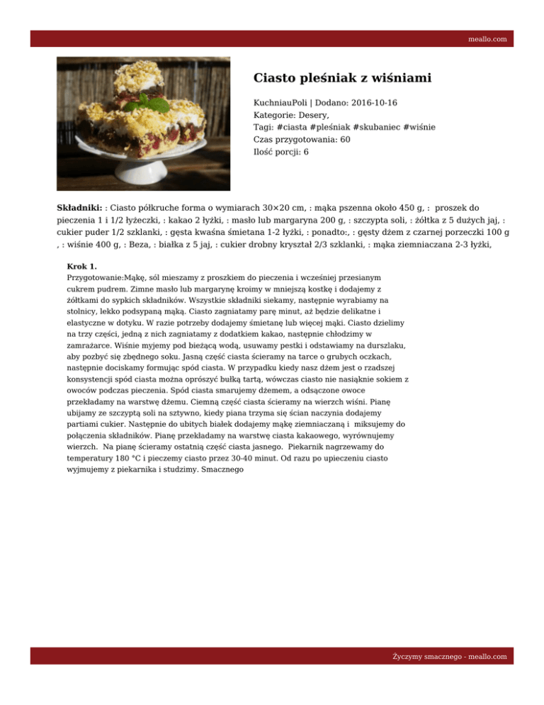 meallo.com Ciasto pleśniak z wiśniami KuchniauPoli | Dodano: 2016-10-16 Kategorie: Desery, Tagi: #ciasta #pleśniak #skubaniec #wiśnie Czas przygotowania: 60 Ilość porcji: 6 Składniki: : Ciasto półkruche forma o wymiarach 30×20 cm, : mąka pszenna około 450 g, : proszek do pieczenia 1 i 1/2 łyżeczki, : kakao 2 łyżki, : masło lub margaryna 200 g, : szczypta soli, : żółtka z 5 dużych jaj, : cukier puder 1/2 szklanki, : gęsta kwaśna śmietana 1-2 łyżki, : ponadto:, : gęsty dżem z czarnej porzeczki 100 g , : wiśnie 400 g, : Beza, : białka z 5 jaj, : cukier drobny kryształ 2/3 szklanki, : mąka ziemniaczana 2-3 łyżki, Krok 1. Przygotowanie:Mąkę, sól mieszamy z proszkiem do pieczenia i wcześniej przesianym cukrem pudrem. Zimne masło lub margarynę kroimy w mniejszą kostkę i dodajemy z żółtkami do sypkich składników. Wszystkie składniki siekamy, następnie wyrabiamy na stolnicy, lekko podsypaną mąką. Ciasto zagniatamy parę minut, aż będzie delikatne i elastyczne w dotyku. W razie potrzeby dodajemy śmietanę lub więcej mąki. Ciasto dzielimy na trzy części, jedną z nich zagniatamy z dodatkiem kakao, następnie chłodzimy w zamrażarce. Wiśnie myjemy pod bieżącą wodą, usuwamy pestki i odstawiamy na durszlaku, aby pozbyć się zbędnego soku. Jasną część ciasta ścieramy na tarce o grubych oczkach, następnie dociskamy formując spód ciasta. W przypadku kiedy nasz dżem jest o rzadszej konsystencji spód ciasta można oprószyć bułką tartą, wówczas ciasto nie nasiąknie sokiem z owoców podczas pieczenia. Spód ciasta smarujemy dżemem, a odsączone owoce przekładamy na warstwę dżemu. Ciemną część ciasta ścieramy na wierzch wiśni. Pianę ubijamy ze szczyptą soli na sztywno, kiedy piana trzyma się ścian naczynia dodajemy partiami cukier. Następnie do ubitych białek dodajemy mąkę ziemniaczaną i miksujemy do połączenia składników. Pianę przekładamy na warstwę ciasta kakaowego, wyrównujemy wierzch. Na pianę ścieramy ostatnią część ciasta jasnego. Piekarnik nagrzewamy do temperatury 180 °C i pieczemy ciasto przez 30-40 minut. Od razu po upieczeniu ciasto wyjmujemy z piekarnika i studzimy. Smacznego Życzymy smacznego - meallo.com