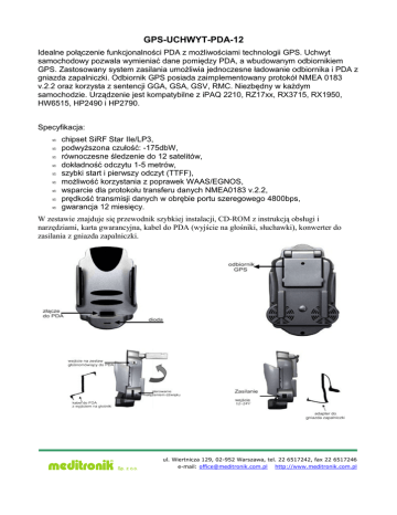 GPS-UCHWYT-PDA-12 Idealne połączenie funkcjonalności PDA z możliwościami technologii GPS. Uchwyt samochodowy pozwala wymieniać dane pomiędzy PDA, a wbudowanym odbiornikiem GPS. Zastosowany system zasilania umożliwia jednoczesne ładowanie odbiornika i PDA z gniazda zapalniczki. Odbiornik GPS posiada zaimplementowany protokół NMEA 0183 v.2.2 oraz korzysta z sentencji GGA, GSA, GSV, RMC. Niezbędny w każdym samochodzie. Urządzenie jest kompatybilne z iPAQ 2210, RZ17xx, RX3715, RX1950, HW6515, HP2490 i HP2790. Specyfikacja: • • • • • • • • • chipset SiRF Star IIe/LP3, podwyższona czułość: -175dbW, równoczesne śledzenie do 12 satelitów, dokładność odczytu 1-5 metrów, szybki start i pierwszy odczyt (TTFF), możliwość korzystania z poprawek WAAS/EGNOS, wsparcie dla protokołu transferu danych NMEA0183 v.2.2, prędkość transmisji danych w obrębie portu szeregowego 4800bps, gwarancja 12 miesięcy. W zestawie znajduje się przewodnik szybkiej instalacji, CD-ROM z instrukcją obsługi i narzędziami, karta gwarancyjna, kabel do PDA (wyjście na głośniki, słuchawki), konwerter do zasilania z gniazda zapalniczki. ul. Wiertnicza 129, 02-952 Warszawa, tel. 22 6517242, fax 22 6517246 e-mail: [email protected] http://www.meditronik.com.pl