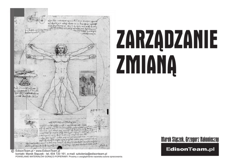ZARZ¥DZANIE ZMIAN¥ Marek St¹czek, Grzegorz Nakonieczny EdisonTeam.pl • www.EdisonTeam.pl kontakt: Marek St¹czek - tel. 604 720 161, e-mail: [email protected] POWIELANIE MATERIA£ÓW GOR¥CO POPIERAMY. Prosimy o uwzglêdnienie nazwiska autora opracowania. EdisonTeam.pl IV. ZMIANA ORGANIZACYJNA Faza oczekiwania na zmiany Analiza sytuacji i okreœlenie potrzeby dokonania zmiany Formu³owanie wizji i budowa koalicji na rzecz zmian Rozpoczêcie procesu zmian Realizacja planu Zakoñczenie wdro¿enia 1. Faza oczekiwania na zmiany Czasy siê zmieniaj¹ i my zmieniamy siê wraz z nimi Lotar I, Król Franków i Cesarz Rzymski INFORMACJE P£YN¥CE ZE ŒWIATA ZEWNÊTRZNEGO, czyli o „nas³uchiwaniu otoczenia” Do osób zarz¹dzaj¹cych firm¹, klientów, akcjonariuszy docieraj¹ sygna³y o zmianach, jakie zachodz¹ w œwiecie, w kraju, w bran¿y, u konkurentów, w gustach i oczekiwaniach klientów. W wyniku nagromadzenia tych sygna³ów wœród czêœci cz³onków organizacji narasta bardziej lub mniej œwiadome przekonanie o potrzebie dokonania zmian w organizacji, nawet, je¿eli maj¹ byæ one trudne i kosztowne. „Nikt nie jest samotn¹ wysp¹.” Jondonne (1624) 28 tel. kom. 604 720 161 Wbudowanie zmiany MAREK ST¥CZEK „Byæ albo nie byæ, oto jest pytanie.” William Shakespeare Przyk³adowe czynniki zewnêtrzne maj¹ce wp³yw na decyzje o przeprowadzeniu zmian w organizacji: sytuacja polityczna, przemiany spo³eczne, koniunktura gospodarcza, nowe technologie, technologie informacyjne, systemy wartoœci, normy kulturowe. ZADANIA: tel. kom. 604 720 161 29 MAREK ST¥CZEK W jaki sposób Firma mo¿e „nas³uchiwaæ otoczenie”? Które dzia³y w organizacji pe³ni¹ w tym wzglêdzie najwa¿niejsz¹ rolê? Jakie czynniki zewnêtrzne maj¹ (lub mog¹ mieæ) decyduj¹cy wp³yw na zmiany w Twojej Firmie? Informacje p³yn¹ce z wnêtrza organizacji NOTATKI: Brak zasobów, wyczerpanie siê zdolnoœci systemów lub technologii, biurokratyczne zblokowanie, konflikty interesów, itp., mog¹ prowadziæ do d³ugotrwa³ego kryzysu wewnêtrznego w organizacji. Wraz z nim pojawiaj¹ siê obawy, niepokoje, a nawet strach. Jednak, nie u wszystkich atmosfera kryzysu powoduje takie napiêcia. Pozytywnym motorem zmian wewn¹trz organizacji s¹ osoby o nastawieniu innowacyjnym, poszukiwacze nowych rozwi¹zañ. Ludzie ci widz¹ luki w funkcjonowaniu firmy i próbuj¹ je wype³niæ. Staj¹ siê Ÿród³em sygna³ów o potrzebach przeprowadzenia zmian. ZnaleŸæ ich mo¿na na wszystkich szczeblach organizacji. Bardzo pozytywnym czynnikiem wywo³uj¹cym zmiany s¹ systemy, w ramach których pracownicy najni¿szego szczebla mog¹ wprowadzaæ ulepszenia. „Nie czekaæ, a¿ staniemy siê zachodz¹cym s³oñcem.” Baltazar Gracian Y Morales (1647) 30 tel. kom. 604 720 161 Podaj przyk³ady informacji z wewn¹trz firmy, które w przesz³oœci doprowadzi³y do zmian? MAREK ST¥CZEK ZADANIE: REAKCJE NA INFORMACJE ODRZUCENIE INFORMACJI „Jesteœmy bezpieczni” - w wielu przypadkach organizacje, które maj¹ stabiln¹ sytuacjê, przede wszystkim du¿e i rozbudowane biurokratycznie, bagatelizuj¹ informacje p³yn¹ce z zewn¹trz. „Odnosimy sukcesy” - firmy, które w ostatnim czasie odnios³y du¿y sukces zanurzaj¹ siê w samozadowoleniu, trac¹ czujnoœæ i krytyczny ogl¹d sytuacji lub po prostu wychodz¹ z za³o¿enia, ¿e skoro obrana strategia przynios³a sukces, to nie nale¿y jej zmieniaæ. „Jesteœmy zapracowani” - w sytuacji firmy, która odnosi sukcesy, ci¹¿¹ na niej zobowi¹zania wzglêdem akcjonariuszy i klientów, st¹d osoby zarz¹dzaj¹ce twierdz¹, ¿e nie maj¹ czasu i zasobów, aby przeanalizowaæ p³yn¹ce z zewn¹trz informacje. Firma jest zaanga¿owana w wiele projektów i wynikaj¹cych z nich zobowi¹zañ i nie chce ich porzuciæ, dopóki nie przynios¹ oczekiwanych rezultatów. „Sprawdzaliœmy to i wszystko jest dobrze” organizacje, gdzie system oceny produktu i us³ug opiera siê w du¿ej czêœci na ocenie wewnêtrznej, a nie np. na opinii klientów. „Trzeba coœ zmieniæ, ale nie fundamentalnie” informacje s¹ ju¿ doœæ wyraŸne, ale Ÿle interpretowane, np.: dyrekcja zarz¹dza redukcjê kosztów zamiast na nowo zdefiniowaæ rolê, jak¹ ma pe³niæ organizacja. „Uwa¿aj, by wieniec laurowy nie przys³oni³ ci pola widzenia” S. Lec Tak by³o... tel. kom. 604 720 161 31 MAREK ST¥CZEK „Lustereczko powiedz przecie” - informacje negatywne s¹ odrzucane, a do zarz¹du, dyrekcji nap³ywaj¹ tylko informacje pozytywne. Firma jest przekszta³cana na wzór dworu, gdzie dyrekcjê otacza t³um pochlebców, a pose³, który przynosi z³e wieœci, jest publicznie skracany o g³owê, doradcy s¹ wybrani wg klucza uleg³oœci i pos³uszeñstwa,