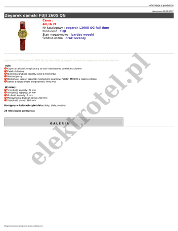 Informacje o produkcie Utworzono 02-03-2017 Zegarek damski FUJI 2605 QG Cena : 40,16 zł Nr katalogowy : zegarek L2605 QG fuji time Producent : FUJI Stan magazynowy : bardzo wysoki Średnia ocena : brak recenzji Wymiary: Szerokość koperty: 24 mm Wysokość koperty: 24 mm Grubość koperty: 8 mm Maksymalna długość paska: 220 mm Szerokość paska: 190 mm 24 miesięczna gwarancja tr o Dostępny w kolorach cyferblatu: złoty, biały, srebrny. el ek GALERIA Wygenerowano w programie www.oscGold.com te Opis: Koperta całkowicie wykonany ze stali nierdzewnej powlekana złotem Pasek skórzany Niewielka grubość koperty tylko 8 milimerów Wodoodporny Doskonałej jakości japoński mechanizm kwarcowy "złota" MIYOTA z rodziny Citizen Dekiel z hologramem oryginalności firmy Fuji l.p l zegarek fuji 2605qg damski 2605 QG fuji-time 2605 qg zegarki damskie fuji eleganckie pozłacany fujitime