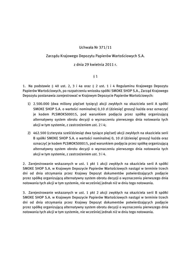 Uchwała Nr 371/11 Zarządu Krajowego Depozytu Papierów Wartościowych S.A. z dnia 29 kwietnia 2011 r. §1 1. Na podstawie § 40 ust. 2, 3 i 4a oraz § 2 ust. 1 i 4 Regulaminu Krajowego Depozytu Papierów Wartościowych, po rozpatrzeniu wniosku spółki SMOKE SHOP S.A., Zarząd Krajowego Depozytu postanawia zarejestrować w Krajowym Depozycie Papierów Wartościowych: 1) 2.500.000 (dwa miliony pięćset tysięcy) akcji zwykłych na okaziciela serii A spółki SMOKE SHOP S.A. o wartości nominalnej 0,10 zł (dziesięć groszy) każda oraz oznaczyć je kodem PLSMOKS00015, pod warunkiem podjęcia przez spółkę organizującą alternatywny system obrotu decyzji o wyznaczeniu pierwszego dnia notowania tych akcji w tym systemie, z zastrzeżeniem ust. 2 i 4; 2) 462.500 (czterysta sześćdziesiąt dwa tysiące pięćset) akcji zwykłych na okaziciela serii B spółki SMOKE SHOP S.A. o wartości nominalnej 0, 10 zł (dziesięć groszy) każda oraz oznaczyć je kodem PLSMOKS00015, pod warunkiem podjęcia przez spółkę organizującą alternatywny system obrotu decyzji o wyznaczeniu pierwszego dnia notowania tych akcji w tym systemie, z zastrzeżeniem ust. 3 i 4. 2. Zarejestrowanie wskazanych w ust. 1 pkt 1 akcji zwykłych na okaziciela serii A spółki SMOKE SHOP S.A. w Krajowym Depozycie Papierów Wartościowych nastąpi w terminie trzech dni od dnia otrzymania przez Krajowy Depozyt dokumentów potwierdzających podjęcie przez spółkę organizującą alternatywny system obrotu decyzji o wyznaczeniu pierwszego dnia notowania tych akcji w tym systemie, nie wcześniej jednak niż w dniu tego notowania. 3. Zarejestrowanie wskazanych w ust. 1 pkt 2 akcji zwykłych na okaziciela serii B spółki SMOKE SHOP S.A. w Krajowym Depozycie Papierów Wartościowych nastąpi w terminie trzech dni od dnia otrzymania przez Krajowy Depozyt dokumentów potwierdzających podjęcie przez spółkę organizującą alternatywny system obrotu decyzji o wyznaczeniu pierwszego dnia notowania tych akcji w tym systemie, nie wcześniej jednak niż w dniu tego notowania. 4. W przypadku, gdy rozpoczęcie notowań w alternatywnym systemie obrotu obejmie nie wszystkie akcje, o których mowa w ust. 1 pkt 1 i 2, zarejestrowanie pod kodem PLSMOKS00015 akcji nie notowanych w tym systemie, nastąpi pod warunkiem podjęcia decyzji o rozpoczęciu ich notowania w tym samym alternatywnym systemie obrotu, przez spółkę prowadzącą ten system, nie wcześniej jednak niż we wskazanym w tej decyzji dniu pierwszego notowania tych akcji w tym systemie. §2 Informacja o zarejestrowaniu akcji serii A i B pod kodem PLSMOKS00015 zostanie przekazana w formie komunikatu Krajowego Depozytu. §3 Uchwała wchodzi w życie z dniem podjęcia. Sławomir Panasiuk Michał Stępniewski Wiceprezes Zarządu Członek Zarządu
