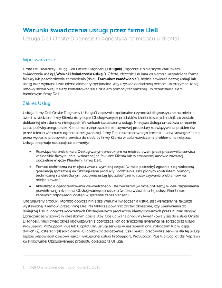 Warunki świadczenia usługi przez firmę Dell Usługa Dell Onsite Diagnosis (diagnostyka na miejscu u klienta) Wprowadzenie Firma Dell świadczy usługę Dell Onsite Diagnosis („Usługa(i)”) zgodnie z niniejszymi Warunkami świadczenia usług („Warunki świadczenia usługi”). Oferta, zlecenie lub inna wzajemnie uzgodniona forma faktury lub potwierdzenia zamówienia (dalej „Formularz zamówienia”), będzie zawierać nazwę usługi lub usług oraz wybrane i zakupione elementy opcjonalne. Aby uzyskać dodatkową pomoc lub otrzymać kopię umowy serwisowej, należy kontaktować się z działem pomocy technicznej lub przedstawicielem handlowym firmy Dell. Zakres Usługi Usługa firmy Dell Onsite Diagnosis („Usługa”) zapewnia opcjonalne czynności diagnostyczne na miejscu awarii w siedzibie firmy Klienta dotyczące Obsługiwanych produktów (zdefiniowanych niżej), co zostało dokładniej określone w niniejszych Warunkach świadczenia usługi. Niniejsza Usługa umożliwia skrócenie czasu poświęcanego przez Klienta na przeprowadzenie rutynowej procedury rozwiązywania problemów przez telefon w ramach ograniczonej gwarancji firmy Dell oraz stosownego kontraktu serwisowego Klienta przez wysłanie pracownika serwisu do siedziby firmy Klienta w celu rozwiązania problemu na miejscu. Usługa obejmuje następujące elementy: Rozwiązanie problemu z Obsługiwanym produktem na miejscu awarii przez pracownika serwisu w siedzibie firmy Klienta (wskazanej na fakturze Klienta lub w stosownej umowie zawartej oddzielnie między Klientem i firmą Dell). Pomoc techniczna na miejscu wraz z wymianą części (w razie potrzeby) zgodnie z ograniczoną gwarancją sprzętową na Obsługiwane produkty i oddzielnie zakupionym kontraktem pomocy technicznej na określonym poziomie usług (po zakończeniu rozwiązywania problemów na miejscu awarii). Aktualizacje oprogramowania wewnętrznego i sterowników (w razie potrzeby) w celu zapewnienia prawidłowego działania Obsługiwanego produktu (w celu wykonania tej usługi Klient musi zapewnić odpowiedni dostęp w systemie zabezpieczeń). Obsługiwany produkt, którego dotyczą niniejsze Warunki świadczenia usług, jest wskazany na fakturze wystawionej Klientowi przez firmę Dell. Na fakturze powinno zostać określone, czy uprawnienia do niniejszej Usługi dotyczą konkretnych Obsługiwanych produktów identyfikowanych przez numer seryjny („znacznik serwisowy”) w określonym czasie. Aby Obsługiwane produkty kwalifikowały się do usługi Onsite Diagnosis, musi trwać okres obowiązywania dotyczącej ich ograniczonej gwarancji na sprzęt oraz usługi ProSupport, ProSupport Plus lub Copilot (np. usługi serwisu w następnym dniu roboczym lub w ciągu dwóch (2), czterech (4) albo ośmiu (8) godzin od zgłoszenia). Czas reakcji pracownika serwisu dla tej usługi będzie odpowiadał czasowi reakcji wykupionej usługi ProSupport, ProSupport Plus lub Copilot dla Naprawy kwalifikowanej Obsługiwanego produktu objętego tą Usługą. 1 Dell Onsite Diagnosis | v2.0 | June 15, 2016 Wskaźnik awarii podzespołów jest nieustannie monitorowany, a firma Dell zastrzega sobie prawo do odmowy świadczenia usługi, jeśli ma uzasadnione powody, aby przypuszczać, że Klient nadużywa usługi Onsite Diagnosis Service (np. w sytuacji, gdy liczba próśb Klienta o wykonanie diagnostyki na miejscu istotnie przekracza standardowy wskaźnik awarii danego podzespołu i systemu). W przypadku, gdy firma Dell ustali (według własnego uznania), że Klient nadużywa Usługi, firma Dell zastrzega sobie prawo do anulowania Usługi zgodnie z poniższymi warunkami Anulowania. Wyłączenia W celu uniknięcia wątpliwości, niniejsze Warunki świadczenia usługi nie obejmują poniższych czynności i elementów: Deinstalacji, ponownej instalacji lub konfiguracji produktów, oprogramowania lub aplikacji, o ile nie zostało to określone inaczej w niniejszym Opisie usługi; Usunięcia odinstalowanego Obsługiwanego produktu z siedziby Klienta; Rozwiązywania problemów z serwerem/pamięcią masową/urządzeniem sieciowym wykraczającego poza przywrócenie Obsługiwanego produktu (serwera, pamięci masowej lub urządzenia sieciowego) do stanu pracy (np. dopasowywania wydajności, konfiguracji, przygotowania skryptów lub przeprowadzania testów wydajności); Rozwiązywania problemów z oprogramowaniem; Usługi Dell Copilot Optimize Service i Dell Compellent Copilot SAN Health Check Services oraz ich elementów dostarczanych; Dostosowania serwera lub urządzenia pamięci masowej Klienta z wyjątkiem przypadków wyraźnie określonych w niniejszym Opisie usługi; Jakiegokolwiek odzyskiwania lub przenoszenia danych lub aplikacji; Obsługi gwarancyjnej lub pomocy technicznej dla komputerów, oprogramowania lub komponentów wyprodukowanych przez firmę inną niż Dell; Instalacji drukarki sieciowej lub odwzorowania sieciowego udostępniania plików; Jakiejkolwiek konfiguracji serwera, sieci lub routera; Usług sieciowych, w tym podłączania systemu do sieci (innej niż sieć Ethernet LAN); Wymiany części (wymiana części następuje zgodnie z oddzielnie zakupionym kontraktem dotyczącym serwisowania na miejscu awarii dla Obsługiwanych produktów — takim jak reakcja w następnym dniu roboczym lub po 2, 4 czy 8 godzinach); Jakichkolwiek czynności niewymienionych wyraźnie w niniejszych Warunkach świadczenia usług. Niniejsze Warunki świadczenia usługi nie powodują przyznania Klientowi jakichkolwiek gwarancji uzupełniających gwarancje dostępne na podstawie warunków głównej umowy o świadczeniu usług lub Umowy, zależnie od sposobu obowiązywania. 2 Dell Onsite Diagnosis | v2.0 | June 15, 2016 Obowiązki Klienta związane z ofertą Procedury wsparcia usługi Onsite Diagnosis w ramach usług ProSupport i ProSupport Plus Kontaktowanie się z firmą Dell w celu wykonania usługi Onsite Diagnosis: 1. Informacje, które należy zebrać przed skontaktowaniem się z firmą Del