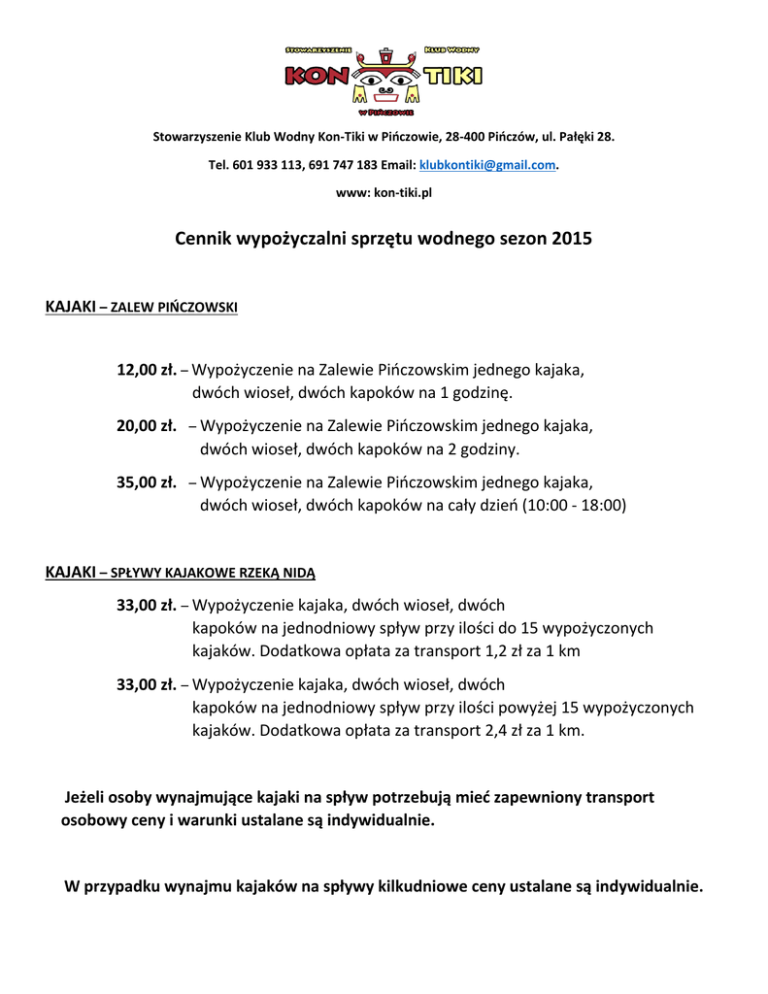 Stowarzyszenie Klub Wodny Kon-Tiki w Pińczowie, 28-400 Pińczów, ul. Pałęki 28. Tel. 601 933 113, 691 747 183 Email: [email protected]. www: kon-tiki.pl Cennik wypożyczalni sprzętu wodnego sezon 2015 KAJAKI – ZALEW PIŃCZOWSKI 12,00 zł. – Wypożyczenie na Zalewie Pińczowskim jednego kajaka, dwóch wioseł, dwóch kapoków na 1 godzinę. 20,00 zł. – Wypożyczenie na Zalewie Pińczowskim jednego kajaka, dwóch wioseł, dwóch kapoków na 2 godziny. 35,00 zł. – Wypożyczenie na Zalewie Pińczowskim jednego kajaka, dwóch wioseł, dwóch kapoków na cały dzień (10:00 - 18:00) KAJAKI – SPŁYWY KAJAKOWE RZEKĄ NIDĄ 33,00 zł. – Wypożyczenie kajaka, dwóch wioseł, dwóch kapoków na jednodniowy spływ przy ilości do 15 wypożyczonych kajaków. Dodatkowa opłata za transport 1,2 zł za 1 km 33,00 zł. – Wypożyczenie kajaka, dwóch wioseł, dwóch kapoków na jednodniowy spływ przy ilości powyżej 15 wypożyczonych kajaków. Dodatkowa opłata za transport 2,4 zł za 1 km. Jeżeli osoby wynajmujące kajaki na spływ potrzebują mieć zapewniony transport osobowy ceny i warunki ustalane są indywidualnie. W przypadku wynajmu kajaków na spływy kilkudniowe ceny ustalane są indywidualnie. Stowarzyszenie Klub Wodny Kon-Tiki w Pińczowie, 28-400 Pińczów, ul. Pałęki 28. Tel. 601 933 113, 691 747 183 Email: [email protected]. www: kon-tiki.pl ŁÓDŹ SPACEROWA 10 osób – ZALEW PIŃCZOWSKI 5,00 zł – Od osoby w ramach rejsów grupowych. 70,00 zł – 1 godzina wynajęcia łodzi spacerowej z obsługą 100,00 zł – 1 godzina wyczarterowania łodzi spacerowej bez obsługi (patent nie wymagany) 300,00 zł – całodniowy czarter bez obsługi łodzi spacerowej (patent nie wymagany) 500,00 zł – całodniowy czarter łodzi spacerowej z obsługą sternika Dodatkowo możliwość wynajęcia: 10,00 zł – grill 5,00 zł – krzesełko turystyczne 15,00 zł – parasol przeciwsłoneczny ŁÓDŹ MOTOROWA Fletcher, 60 KM: 3 osoby – ZALEW PIŃCZOWSKI 25,00 zł – przejażdżka łodzią motorową w koło Zalewu Pińczowskiego. 55,00 zł – 15 minutowa przejażdżka łodzią motorową po Zalewie Pińczowskim. 100,00 zł – 15 minutowe wyczarterowanie łodzi motorowej (wymagany patent sternika motorowodnego) 380,00 zł – 1 godzina wyczarterowania łodzi motorowej (wymagany patent sternika motorowodnego) 780,00 zł – całodniowe wyczarterowanie łodzi motorowej (wymagany patent sternika motorowodnego) Stowarzyszenie Klub Wodny Kon-Tiki w Pińczowie, 28-400 Pińczów, ul. Pałęki 28. Tel. 601 933 113, 691 747 183 Email: [email protected]. www: kon-tiki.pl ŁÓDŹ MOTOROWA Fletcher, 60 KM: 3 osoby – ZALEW PIŃCZOWSKI Dodatkowo możliwość wynajęcia z czarterowaną łodzią motorową: 30,00 zł – narty wodne z orczykiem na 1 godzinę 90,00 zł – narty wodne z orczykiem na cały dzień 25,00 zł – koło do holowania 1 osobowe na 1 godzinę 75,00 zł – koło do holowania 1 osobowe na cały dzień 75,00 zł – krokodyl do holowania 4 osób na 1 godzinę 250,00 zł – krokodyl do holowania 4 osób na cały dzień ŁÓDŹ ŻAGLOWA MERLIN 3 OSOBOWA - ZALEW PIŃCZOWSKI 30,00 zł – za 1 godzinę 50,00 zł – za 2 godziny 90,00 zł – za cały dzień ŁÓDŹ ŻAGLOWA DELTA 2 OSOBOWA - ZALEW PIŃCZOWSKI 20,00 zł – za 1 godzinę 30,00 zł – za 2 godziny 60,00 zł – za cały dzień ŁÓDŹ MOTOROWA FLORYDA 4 OSOBOWA Z SILNIKEM 8 KM - ZALEW PIŃCZOWSKI 45,00 zł – wynajem na 1 godzinę (patent sternika nie wymagany) 75,00 zł – wynajem na 2 godziny (patent sternika nie wymagany) 180,00 zł – wynajem na cały dzień (patent sternika nie wymagany) Stowarzyszenie Klub Wodny Kon-Tiki w Pińczowie, 28-400 Pińczów, ul. Pałęki 28. Tel. 601 933 113, 691 747 183 Email: [email protected]. www: kon-tiki.pl HOLOWANIE NA NARTACH WODNYCH 35,00 zł – holowanie na Nartach Wodnych 1 koło wokół Zalewu Pińczowskiego 55,00 zł – 15 minutowe holowanie na Nartach Wodnych po Zalewie Pińczowskim 195,00 zł – 60 minutowe holowanie na Nartach Wodnych po Zalewie Pińczowskim HOLOWANIE NA WAKEBORDZIE 35,00 zł – holowanie na Wakebordzie 1 koło wokół Zalewu Pińczowskiego 55,00 zł – 15 minutowe holowanie na Wakebordzie po Zalewie Pińczowskim 195,00 zł – 60 minutowe holowanie na Wakebordzie po Zalewie Pińczowskim HOLOWANIE NA KOLE – 1 OSOBOWE 35,00 zł – holowanie na Kole 1 okrążenie wokół Zalewu Pińczowskiego 55,00 zł – 15 minutowe holowanie na Kole po Zalewie Pińczowskim 195,00 zł – 60 minutowe holowanie na Kole po Zalewie Pińczowskim HOLOWANIE NA KOLE „WOW” – 3 OSOBOWE 45,00 zł – holowanie na Kole 1 okrążenie wokół Zalewu Pińczowskiego 75,00 zł – 15 minutowe holowanie na Kole po Zalewie Pińczowskim 210,00 zł – 60 minutowe holowanie na Kole po Zalewie Pińczowskim Stowarzyszenie Klub Wodny Kon-Tiki w Pińczowie, 28-400 Pińczów, ul. Pałęki 28. Tel. 601 933 113, 691 747 183 Email: [email protected]. www: kon-tiki.pl HOLOWANIE NA KROKODYLU – DO 4 OSÓB 45,00 zł – holowanie na Krokodylu 1 okrążenie wokół Zalewu Pińczowskiego 75,00 zł – 15 minutowe holowanie na Krokodylu po Zalewie Pińczowskim 210,00 zł – 60 minutowe holowanie na Krokodylu po Zalewie Pińczowskim SLIPOWANIE ŁODZI LUB SKUTERA WODNEGO – DOTYCZY OSÓB NIEBĘDĄCYCH CZŁONKAMI KLUBU 15,00 zł – jednorazowe slipowanie łodzi lub skutera wodnego 100,00 zł – całosezonowy abonament na slipowanie łodzi lub skutera ROWERKI WODNE – DO 4 OSÓB 15,00 zł – za 1 godzinę 25,00 zł – za 2 godziny 50,00 zł – za cały dzień Stowarzyszenie Klub Wodny Kon-Tiki w Pińczowie, 28-400 Pińczów, ul. Pałęki 28. Tel. 601 933 113, 691 747 183 Email: [email protected]. www: kon-tiki.pl WYPOŻYCZALNIA SPRZĘTU WODNEGO KON-TIKI CZYNNA JEST OD 1 MAJA 2015 DO 15 WRZEŚNIA 2015 W GODZINACH: 10:00-20:00 SOBOTA-NIEDZIELA PONIEDZIAŁEK-PIĄTEK: PO WCZEŚNIEJSZYM UMÓWIENIU TEL: 691 747 183, 601 933 113