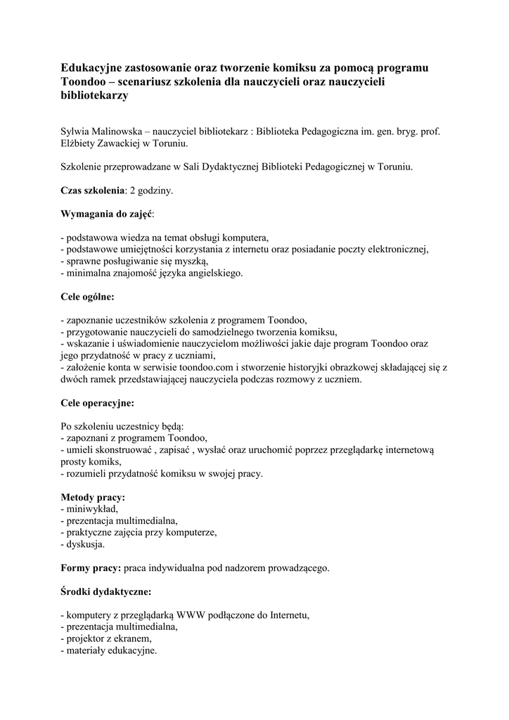 Edukacyjne zastosowanie oraz tworzenie komiksu za pomocą programu Toondoo – scenariusz szkolenia dla nauczycieli oraz nauczycieli bibliotekarzy Sylwia Malinowska – nauczyciel bibliotekarz : Biblioteka Pedagogiczna im. gen. bryg. prof. Elżbiety Zawackiej w Toruniu. Szkolenie przeprowadzane w Sali Dydaktycznej Biblioteki Pedagogicznej w Toruniu. Czas szkolenia: 2 godziny. Wymagania do zajęć: - podstawowa wiedza na temat obsługi komputera, - podstawowe umiejętności korzystania z internetu oraz posiadanie poczty elektronicznej, - sprawne posługiwanie się myszką, - minimalna znajomość języka angielskiego. Cele ogólne: - zapoznanie uczestników szkolenia z programem Toondoo, - przygotowanie nauczycieli do samodzielnego tworzenia komiksu, - wskazanie i uświadomienie nauczycielom możliwości jakie daje program Toondoo oraz jego przydatność w pracy z uczniami, - założenie konta w serwisie toondoo.com i stworzenie historyjki obrazkowej składającej się z dwóch ramek przedstawiającej nauczyciela podczas rozmowy z uczniem. Cele operacyjne: Po szkoleniu uczestnicy będą: - zapoznani z programem Toondoo, - umieli skonstruować , zapisać , wysłać oraz uruchomić poprzez przeglądarkę internetową prosty komiks, - rozumieli przydatność komiksu w swojej pracy. Metody pracy: - miniwykład, - prezentacja multimedialna, - praktyczne zajęcia przy komputerze, - dyskusja. Formy pracy: praca indywidualna pod nadzorem prowadzącego. Środki dydaktyczne: - komputery z przeglądarką WWW podłączone do Internetu, - prezentacja multimedialna, - projektor z ekranem, - materiały edukacyjne. Przebieg szkolenia: 1. 2. 3. 4. 5. 6. Przywitanie uczestników i przedstawienie celów szkolenia, Wskazanie zalet edukacyjnego zastosowania komiksu Przedstawienie uczestnikom przydatności komiksu w pracy dydaktycznej, Wykorzystanie prezentacji multimedialnej w celu zapoznania z programem Toondoo, Omówienie wymagań technicznych programu, Wykonywanie poszczególnych kroków programu mających na celu stworzenie komiksu, 7. Sprawdzenie poprawności wykonania komiksu zapisanego w przeglądarce www, 8. Polecenie wysłania komiksu pocztą elektroniczną, 9. Rozdanie uczestnikom materiałów pomocniczych dotyczących programu Toondoo, 10. Zakończenie szkolenia ze wskazaniem możliwości konsultacji indywidualnych w przypadku ewentualnych problemów w tworzeniu komiksu.