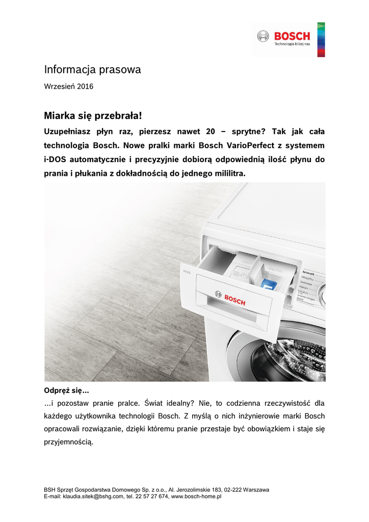 Informacja prasowa Wrzesień 2016 Miarka się przebrała! Uzupełniasz płyn raz, pierzesz nawet 20 – sprytne? Tak jak cała technologia Bosch. Nowe pralki marki Bosch VarioPerfect z systemem i-DOS automatycznie i precyzyjnie dobiorą odpowiednią ilość płynu do prania i płukania z dokładnością do jednego mililitra. Odpręż się… …i pozostaw pranie pralce. Świat idealny? Nie, to codzienna rzeczywistość dla każdego użytkownika technologii Bosch. Z myślą o nich inżynierowie marki Bosch opracowali rozwiązanie, dzięki któremu pranie przestaje być obowiązkiem i staje się przyjemnością. BSH Sprzęt Gospodarstwa Domowego Sp. z o.o., Al. Jerozolimskie 183, 02-222 Warszawa E-mail: [email protected], tel. 22 57 27 674, www.bosch-home.pl Efekt i-DOS: pożegnaj dozowanie System i-DOS w nowych pralkach Bosch VarioPerfect automatycznie dozuje płyny do prania i płukania. Jak to działa? Pojemnik na płynny detergent o pojemności 1,3 litra uzupełniasz raz – do pełna, a później zapominasz o tym nawet przez 20 cykli prania. Technologia i-DOS działa w oparciu o czujniki, które za każdym razem automatycznie sprawdzają: rodzaj tkaniny, stopień jej zabrudzenia, twardość wody, wagę załadunku. Na podstawie zebranych informacji pralka sama i z dokładnością do jednego mililitra dobiera odpowiednią ilość płynu do prania, dzięki czemu zyskujemy gwarancję zawsze idealnie czystych ubrań. Automatyczny system dozowania i-DOS pozwala nam również zaoszczędzić 7062 litrów wody, zużyć nawet o 30% mniej detergentu i raz na zawsze rozprawić się z problemem przedozowania środka piorącego. Pralka automatyczna? Od dziś nabrała zupełnie nowego znaczenia. Żegnaj, miarko! Głuchy telefon? Dekoracyjny wazon na stół, a może nos klauna? Drugie życie miarki? Poznaj na nie sposoby tutaj. Więcej informacji znajdziesz na stronie: www.varioperfect.pl BSH Sprzęt Gospodarstwa Domowego Sp. z o.o., Al. Jerozolimskie 183, 02-222 Warszawa E-mail: [email protected], tel. 22 57 27 674, www.bosch-home.pl Bosch VarioPerfect z systemem i-DOS Model: WAT28640PL i-DOS™: w pełni automatyczne i precyzyjne dozowanie płynnego detergentu dla perfekcyjnych efektów Klasa efektywności energetycznej A+++-30% Załadunek: 9 kg, 1400 obr./min Bezszczotkowy silnik EcoSilence Drive™: wyjątkowo cichy i wydajny – teraz z 10 letnią gwarancją Niski poziom hałasu (pranie/wirowanie) 48dB / 73dB Cena: 3939 PLN [Liczba znaków ze spacjami: 2130] BSH Sprzęt Gospodarstwa Domowego Sp. z o.o., Al. Jerozolimskie 183, 02-222 Warszawa E-mail: [email protected], tel. 22 57 27 674, www.bosch-home.pl