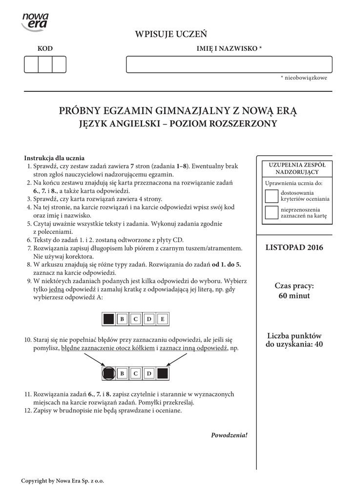 WPISUJE UCZEŃ KOD IMIĘ i NAZWISKO * * nieobowiązkowe PRÓBNY EGZAMIN GIMNAZJALNY Z NOWĄ ERĄ JĘZYK Angielski – POZIOM ROZSZERZONY Instrukcja dla ucznia 1.Sprawdź, czy zestaw zadań zawiera 7 stron (zadania 1–8). Ewentualny brak stron zgłoś nauczycielowi nadzorującemu egzamin. 2.Na końcu zestawu znajdują się karta przeznaczona na rozwiązanie zadań 6., 7. i 8., a także karta odpowiedzi. 3.Sprawdź, czy karta rozwiązań zawiera 4 strony. 4.Na tej stronie, na karcie rozwiązań i na karcie odpowiedzi wpisz swój kod oraz imię i nazwisko. 5.Czytaj uważnie wszystkie teksty i zadania. Wykonuj zadania zgodnie z poleceniami. 6.Teksty do zadań 1. i 2. zostaną odtworzone z płyty CD. 7.Rozwiązania zapisuj długopisem lub piórem z czarnym tuszem/atramentem. Nie używaj korektora. 8.W arkuszu znajdują się różne typy zadań. Rozwiązania do zadań od 1. do 5. zaznacz na karcie odpowiedzi. 9.W niektórych zadaniach podanych jest kilka odpowiedzi do wyboru. Wybierz tylko jedną odpowiedź i zamaluj kratkę z odpowiadającą jej literą, np. gdy wybierzesz odpowiedź A: B C D C D 11. Rozwiązania zadań 6., 7. i 8. zapisz czytelnie i starannie w wyznaczonych miejscach na karcie rozwiązań zadań. Pomyłki przekreślaj. 12.Zapisy w brudnopisie nie będą sprawdzane i oceniane. Powodzenia! Copyright by Nowa Era Sp. z o.o. Uprawnienia ucznia do: dostosowania kryteriów oceniania nieprzenoszenia zaznaczeń na kartę LISTOPAD 2016 Czas pracy: 60 minut E 10.Staraj się nie popełniać błędów przy zaznaczaniu odpowiedzi, ale jeśli się pomylisz, błędne zaznaczenie otocz kółkiem i zaznacz inną odpowiedź, np. B UZUPEŁNIA ZESPÓŁ NADZORUJĄCY Liczba punktów do uzyskania: 40 Próbny egzamin gimnazjalny z Nową Erą Język angielski – poziom rozszerzony Zadanie 1. (0−6) Usłyszysz dwukrotnie dwa teksty. Na podstawie informacji zawartych w nagraniu w zadaniach 1.1.–1.6. z podanych odpowiedzi wybierz właściwą. Zakreśl literę A, B albo C. Zadania 1.1.–1.3. odnoszą się do pierwszego tekstu, a zadania 1.4.–1.6. do drugiego. Tekst 1. Usłyszysz rozmowę przyjaciół. 1.1. Which is true about Monica? A. She is fond of extreme sports. B. She is not a risk-taker. C. She has already tried bungee jumping. 1.2. Tom wants his friend to A. keep playing volleyball and tennis. B. call the camp organizers. C. join him at the camp. 1.3. Where are the two friends talking? A. in an Internet café B. at Tom’s place C. in a sports shop Tekst 2. Usłyszysz wypowiedź dotyczącą nauki języków obcych. 1.4. Mrs Barbara Jones thinks that A. students don’t have problems remembering new words. B. students face problems while learning a language. C. her ideas are complicated but worth trying. 1.5. When students use mind maps they A. learn 365 new words a month. B. receive a ready-made mind map in their mailboxes. C. present information in the form of an image. 1.6. The main idea of the text is A. to show how technology can be helpful while learning. B. to encourage students to spend more time searching the Internet. C. to show how you learn a language more quickly by talking to people than by using a computer. 2z7 Próbny egzamin gimnazjalny z Nową Erą Język angielski – poziom rozszerzony Zadanie 2. (0−4) Usłyszysz dwukrotnie cztery osoby, które opowiadają o swojej pierwszej pracy wakacyjnej. Na podstawie informacji zawartych w nagraniu dopasuj do każdej wypowiedzi (2.1.–2.4.) odpowiadające jej zdanie (A–E). Wpisz rozwiązania do tabeli. Uwaga! Jedno zdanie zostało podane dodatkowo i nie pasuje do żadnej wypowiedzi. A. I took this job to earn money and help my relative. B. In this job I met people from different countries. C. This job made me more self-confident. D. My job was tiring but rewarding. E. I got a job thanks to a member of my family. 2.1. 2.2. 2.3. 2.4. Przenieś rozwiązania zadań 1. oraz 2. na kartę odpowiedzi! 3z7 Próbny egzamin gimnazjalny z Nową Erą Język angielski – poziom rozszerzony Zadanie 3. (0−3) Przeczytaj tekst. Do każdego akapitu (3.1.–3.3.) dopasuj właściwy nagłówek (A–E). Wpisz odpowiednią literę obok numeru każdego akapitu. Uwaga! Dwa nagłówki zostały podane dodatkowo i nie pasują do żadnego akapitu. A. Less but more often B. For taste and health C. Eat more slowly D. Drink when you are thirsty E. For health and good relationships 3.1. _______ Opponents of junk food decided to say ‘stop’ to unhealthy eating habits. They came up with the idea of the Slow Food Movement. This idea is about paying more attention to preparing food and using ingredients that are fresh and not processed. Slow Food is also about spending more time with family and friends at the table and appreciating time spent together. This helps build stronger bonds between people. 3.2. _______ Can you imagine not adding a pinch of salt to your dinner? Try to avoid salt and replace it with herbs and natural spices. Soon you will get used to new tastes and you will be able to fully appreciate the original flavour of your food. What is more, it will reduce your risk of getting high blood pressure and heart disease. 3.3. _______ Many people think that if they eat twice a day they will consume fewer calories and therefore lose weight. They are wrong. The key to a healthy diet and weight loss is to eat regularly. It is suggested that you should eat five small meals a day, every three hours. Between meals grab a bottle of water and drink, as this gives you more energy and reduces stress. Drinking water is not just to reduce your thirst. Przenieś rozwiązania na kartę odpowiedzi! 4z7 Próbny egzamin gimnazjalny z Nową Erą Język angielski – poziom rozszerzony Zadanie 4. (0−4) Przeczytaj tekst, z którego usunięto cztery zdania. Wpisz w luki (4.1.–4.4.) litery, którymi oznaczono brakujące zdania (A–E), tak aby otrzymać spójny i logiczny tekst. Uwaga! Jedno zdanie zostało podane dodatkowo i nie pasuje do żadnej luki. DECLARATION O