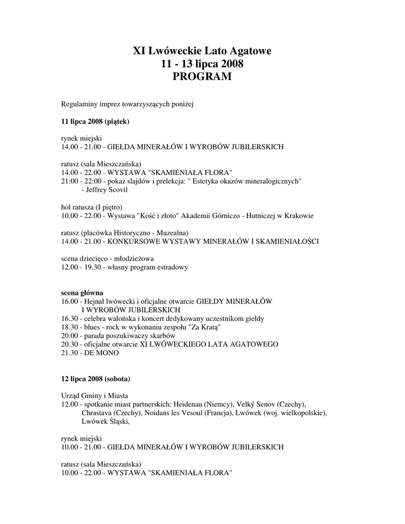 XI Lwóweckie Lato Agatowe 11 - 13 lipca 2008 PROGRAM Regulaminy imprez towarzyszących poniżej 11 lipca 2008 (piątek) rynek miejski 14.00 - 21.00 - GIEŁDA MINERAŁÓW I WYROBÓW JUBILERSKICH ratusz (sala Mieszczańska) 14.00 - 22.00 - WYSTAWA "SKAMIENIAŁA FLORA" 21:00 - 22:00 - pokaz slajdów i prelekcja: " Estetyka okazów mineralogicznych" - Jeffrey Scovil hol ratusza (I piętro) 10.00 - 22.00 - Wystawa "Kość i złoto" Akademii Górniczo - Hutniczej w Krakowie ratusz (placówka Historyczno - Muzealna) 14.00 - 21.00 - KONKURSOWE WYSTAWY MINERAŁÓW I SKAMIENIAŁOŚCI scena dziecięco - młodzieżowa 12.00 - 19.30 - własny program estradowy scena główna 16.00 - Hejnał lwówecki i oficjalne otwarcie GIEŁDY MINERAŁÓW I WYROBÓW JUBILERSKICH 16.30 - celebra walońska i koncert dedykowany uczestnikom giełdy 18.30 - blues - rock w wykonaniu zespołu "Za Kratą" 20.00 - parada poszukiwaczy skarbów 20.30 - oficjalne otwarcie XI LWÓWECKIEGO LATA AGATOWEGO 21.30 - DE MONO 12 lipca 2008 (sobota) Urząd Gminy i Miasta 12.00 - spotkanie miast partnerskich: Heidenau (Niemcy), Velký Senov (Czechy), Chrastava (Czechy), Noidans les Vesoul (Francja), Lwówek (woj. wielkopolskie), Lwówek Śląski, rynek miejski 10.00 - 21.00 - GIEŁDA MINERAŁÓW I WYROBÓW JUBILERSKICH ratusz (sala Mieszczańska) 10.00 - 22.00 - WYSTAWA "SKAMIENIAŁA FLORA" hol ratusza (I piętro) 10.00 - 22.00 - Wystawa "Kość i złoto" Akademii Górniczo - Hutniczej w Krakowie ratusz (placówka Historyczno - Muzealna) 10.00 - 21.00 - KONKURSOWE WYSTAWY MINERAŁÓW I SKAMIENIAŁOŚCI scena dziecięco - młodzieżowa 12.00 - 20.00 - własny program estradowy scena główna (prowadzenie - Mariusz Wolski) 14.00 - eliminacje, ćwierćfinały i półfinały Turnieju o tytuł Mocarza XI LLA 16.00 - obrzędowy zespół LLAValon (w przerwie ogłoszenie wyników i wręczenie nagród zwycięzcom konkursu na najciekawszą kolekcję minerałów) 17.30 - Agatowy Turniej Miast: Heidenau, Velký Senov, Chrastava, Lwówek (woj. wielkopolskie), Noidans les Vesoul, Lwówek Śląski 19.00 - występ zespołu Duo Blues 20.30 - GRUPA OPERACYJNA 22.00 - BONEY M 23.30 - WĘDROWNE GITARY - biesiada pod gwiazdami 13 lipca 2008 (niedziela) rynek miejski 10.00 - 21.00 - GIEŁDA MINERAŁÓW I WYROBÓW JUBILERSKICH ratusz (sala Mieszczańska) 10.00 - 22.00 - WYSTAWA "SKAMIENIAŁA FLORA" hol ratusza (I piętro) 10.00 - 22.00 - Wystawa "Kość i złoto" Akademii Górniczo - Hutniczej w Krakowie ratusz (placówka Historyczno - Muzealna) 10.00 - 21.00 - KONKURSOWE WYSTAWY MINERAŁÓW I SKAMIENIAŁOŚCI scena dziecięco - młodzieżowa 12.00 - 20.00 - własny program estradowy Scena główna (prowadzenie - Mariusz Wolski) 15.00 - prezentacje artystyczne miast partnerskich 16.30 - występ zespołu "13poziomo" 17.30 - finał turnieju o tytuł Mocarza XI LLA 18.15 - 59-700 Quintet - koncert dla sponsorów 19.30 - kabaret Made in China 20.45 - "Zapraszamy do przyjaciół zza miedzy" czyli spotkanie z Ogólnopolskim Festiwalem Filmów Komediowych, Świętem Ceramiki i Galą Folkloru 22.00 - ŁZY 23.30 - oficjalne zakończenie XI Lwóweckiego Lata Agatowego - pokaz sztucznych ogni w wykonaniu firmy FIRE SHOW Imprezy towarzyszące i inne atrakcje: - warsztaty fotografii minerałów prowadzone przez światowej sławy fotografika z USA Jeffrey'a Scovila; - pokazy slajdów i prelekcje o tematyce mineralogicznej; - wyrobisko agatowe; - osada Walończyków (chata walońska, pokazy cięcia i szlifowania agatów, obrzędy walońskie); - rajdy do pól agatowych; - pokazy płukania złota; - giełda rzemiosła i rękodzieła artystycznego; - park zabaw dla dzieci (eurobungee, quady, ławka hip-hop, dmuchane zjeżdżalnie, suche baseny, diabelski młyn, autodrom, ranger, break dance, elektryczne samochody, przejażdżki bryczką); - BIEG SZLAKIEM AGATOWYM; regulamin w formacie pdf - zawody strzeleckie o Agat XI LLA; regulamin w formacie pdf - zawody wędkarskie o Agat Lwówecki; komunikat wędkarski organizatorzy zastrzegają sobie prawo do zmian programu XI Lwóweckiego Lata Agatowego !