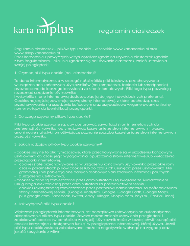 regulamin ciasteczek Regulamin ciasteczek – plików typu cookie – w serwisie www.kartanaplus.pl oraz www.sklep.kartanaplus.pl Przez korzystanie z powyższych witryn wyrażasz zgodę na używanie ciasteczek zgodnie z tym Regulaminem. Jeżeli nie zgadzasz się na używanie ciasteczek, zmień ustawienia swojej przeglądarki. 1. Czym są pliki typu cookie (pol. ciasteczka)? To dane informatyczne, a w szczególności krótkie pliki tekstowe, przechowywane w urządzeniach końcowych użytkowników (na komputerze, tablecie lub smartphonie) przeznaczone do lepszego korzystania ze stron internetowych. Pliki tego typu pozwalają rozpoznać urządzenie użytkownika i wyświetlić stronę internetową dostosowując ją do jego indywidualnych preferencji. Cookies najczęściej zawierają nazwę strony internetowej, z której pochodzą, czas przechowywania na urządzeniu końcowym oraz przypadkowo wygenerowany unikalny numer służący do identyfikacji przeglądarki. 2. Do czego używamy plików typu cookie? Pliki typu cookie używane są, aby dostosować zawartości stron internetowych do preferencji użytkownika, optymalizować korzystanie ze stron internetowych i tworzyć anonimowe statystyki, umożliwiające poznanie sposobu korzystania ze stron internetowych przez użytkownika. 3. Jakich rodzajów plików typu cookie używamy? - cookies sesyjne to pliki tymczasowe, które przechowywane są w urządzeniu końcowym użytkownika do czasu jego wylogowania, opuszczenia strony internetowej lub wyłączenia przeglądarki internetowej, - cookies stałe przechowywane są w urządzeniu końcowym użytkownika przez określony czas w parametrach plików cookies lub do czasu ich usunięcia przez użytkownika. Nie gromadzą i nie pobierają one danych osobowych ani żadnych informacji poufnych - z urządzenia użytkownika, - cookies własne są zamieszczane przez administratora i są związane ze świadczeniem usług droga elektroniczną przez administratora za pośrednictwem serwisu, - cookies zewnętrzne są zamieszczane przez partnerów administratora, za pośrednictwem strony internetowej serwisu (Google Analytics, Google, Google Earth, Google Maps, plus.google.com, Facebook, Twitter, ebay, Allegro, Shoplo.com, PayYou, PayPal i inne). 4. Jak wyłączyć pliki typu cookie? Większość przeglądarek internetowych jest początkowo ustawionych na automatyczne akceptowanie plików typu cookie. Zawsze można zmienić ustawienia przeglądarki i zablokować cookies (w całości lub w części). Użytkownik może w każdej chwili usunąć pliki cookies korzystając z dostępnych funkcji w przeglądarce internetowej, której używa. Jeżeli pliki typu cookie zostaną zablokowane, może to negatywnie wpłynąć na wygodę oraz jakość korzystania z witryn.
