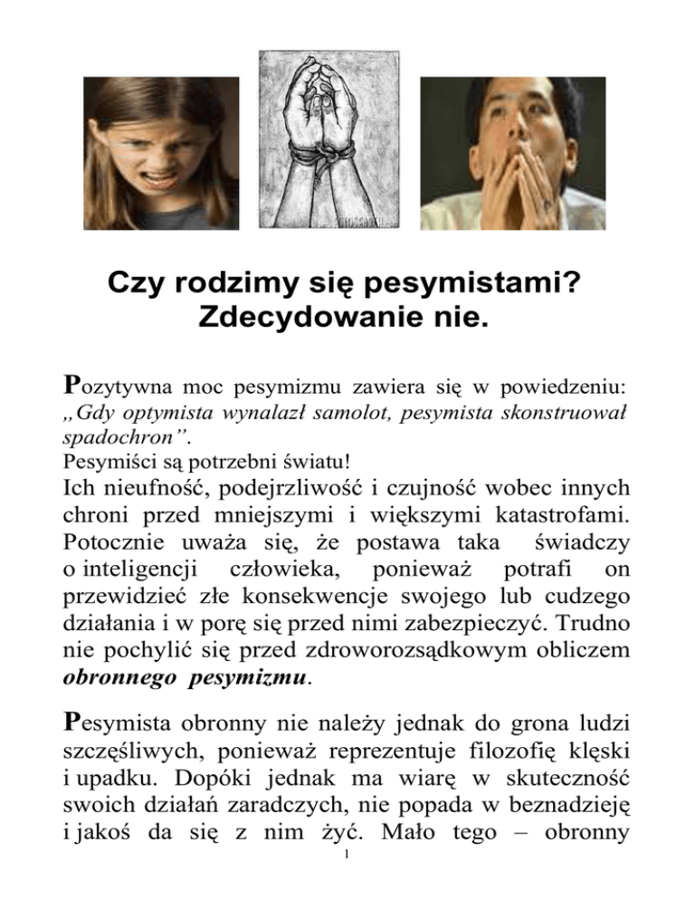 Czy rodzimy się pesymistami? Zdecydowanie nie. Pozytywna moc pesymizmu zawiera się w powiedzeniu: „Gdy optymista wynalazł samolot, pesymista skonstruował spadochron”. Pesymiści są potrzebni światu! Ich nieufność, podejrzliwość i czujność wobec innych chroni przed mniejszymi i większymi katastrofami. Potocznie uwaŜa się, Ŝe postawa taka świadczy o inteligencji człowieka, poniewaŜ potrafi on przewidzieć złe konsekwencje swojego lub cudzego działania i w porę się przed nimi zabezpieczyć. Trudno nie pochylić się przed zdroworozsądkowym obliczem obronnego pesymizmu. Pesymista obronny nie naleŜy jednak do grona ludzi szczęśliwych, poniewaŜ reprezentuje filozofię klęski i upadku. Dopóki jednak ma wiarę w skuteczność swoich działań zaradczych, nie popada w beznadzieję i jakoś da się z nim Ŝyć. Mało tego – obronny 1 pesymizm pozwala pozbyć się strachu, działać wytrwale i konsekwentnie, zapobiegać wpadkom, a nawet redukować własne oczekiwania i lepiej znosić poraŜki. Przewidując zagroŜenie, człowiek stawia mu czoło i działa. Przeciwieństwem pesymisty obronnego jest pesymista z wyuczoną bezradnością. Powiedzieli o nim: • Oskar Wilde: To ktoś, kto postawiony przed wyborem jednego z dwojga złego - wybiera oba. • George Bernard Shaw - To człowiek, który sądzi, Ŝe wszyscy są tak samo okropni jak on. Nienawidzi ich za to. • StaroŜytni: pesymista od łac. pessimus – najgorszy. Postaw wyuczonej bezradności objawia się skłonnością do negatywnego oceniania ludzi i sytuacji, postrzeganiem tylko ujemnych stron Ŝycia, brakiem wiary w pomyślność i lękiem przed podejmowaniem działań. Powtarzaj dziecku wytrwale od najmłodszych lat: „nawet głupiej sznurówki nie umiesz sam zawiązać”, „tobie nigdy nie moŜna zaufać”, „i co znowu narobiłeś”, „zostaw, ja to zrobię, bo zaraz coś zepsujesz”, „głupku”, „niedojdo”, „z tobą zawsze same kłopoty”, a staniesz się nauczycielem jego wyuczonej bezradności. Potem podziwiaj wynik serii złych doświadczeń narastającą u dziecka niechęć do podejmowania działań, które mogłyby poprawić sytuację. W efekcie dziecko wzrasta w przeświadczeniu o swojej 2 nieudolności i braku kompetencji, przenosząc lęki na inne sfery Ŝycia. Z czasem nauczy się kompensować sobie niską samoocenę za konsekwencje bylejakości lub nicnierobienia oskarŜając tzw. innych – nauczyciela w szkole (uwziął się), szefa w pracy (jest głupi), Ŝonę lub męŜa (czepia się, jest Ŝyciową pomyłką). WYUCZONA BEZRADNOŚĆ WIĄśE RĘCE I UNIESZCZĘŚLIWIA Pesymizm nie jest złem, ale jeśli staje się dominującym sposobem myślenia, pozbawia człowieka energii, wpędza w depresję i skazuje na samotność. 3 Czy rodzimy się optymistami? Zdecydowanie tak. Okres dzieciństwa to czas, gdy jesteśmy największymi optymistami z dobrze działającą barierą przeciw bezradności. Rodzimy się ufni, ciekawscy, aktywni, z zachwytem próbujemy poznać i nawiązać kontakt z otoczeniem. Wielomiesięczne upadki nie powstrzymują przed kolejnymi próbami stania się istotami dwunoŜnymi. Ta sama determinacja towarzyszy nam w następnych latach Ŝycia, jeŜeli najbliŜsi wspierają nas w empirycznym zbieraniu wiedzy o świecie, ludziach, o sobie. Gorzej, gdy nie mamy wsparcia. Jeszcze gorzej, kiedy stykamy się z niechęcią otoczenia, które jawnie traci cierpliwość i... próbuje nauczyć nas bezradności. Okres wczesnoszkolny moŜe nieco rozszczelnić naszą barierę, gdy porównujemy się z rówieśnikami w klasie. Zawsze zdarzy się, Ŝe ktoś inny jest od nas w czymś lepszy. Od dziecka nauczonego pozytywnego postrzegania siebie i innych, moŜemy oczekiwać, Ŝe potraktuje tę sytuację w sposób naturalny. Jeśli uzna, Ŝe potrzebuje określonej umiejętności na wyŜszym poziomie, znajdzie w sobie 4 motywację i energię, by cel osiągnąć, a nawet chętnie będzie uczyło się od kolegi/ koleŜanki, który juŜ to potrafi. O dziecko, które nauczyło się pozytywnego postrzegania tylko siebie, moŜemy być mniej spokojni - natknie się w tej samej sytuacji na silny stres. Skutkiem moŜe być impuls do działania, by udowodnić, Ŝe jest lepsze od najlepszego. JeŜeli nie wyjdzie, zachowa się jak kolega z wyuczoną bezradnością – uzna, Ŝe nie warto nic robić, moŜe prócz znalezienia osoby odpowiedzialnej za swoje złe samopoczucie i ukarania jej - złośliwą uwagą, plotką, nieŜyczliwością. śycie wszystkim serwuje podobne doświadczenia. RóŜnica polega na ocenie sytuacji i stylu wyjaśnienia jej sobie samemu. Optymizmu moŜna dziecko nauczyć, jeŜeli dostrzeŜemy pierwsze oznaki rodzącej się bezradności. Pierwszym krokiem jest zrozumienie i przekazanie dziecku, Ŝe to, jak się czujemy zaleŜy od sposobu naszego myślenia (przekonania). Kiedy w Ŝyciu natrafiamy na Trudność nasz umysł tworzy Przekonanie o jej przyczynie: Trudność: „Chłopaki nie chcą przyjąć mnie do druŜyny. Na końcu pani przydziela mnie do druŜyny, w której mam być bramkarzem. Oni są wściekli.” Przekonanie: „Znowu to samo. Nic mi się nigdy nie uda. Tato ma rację, jestem fajtłapą, nigdy nie będę tak dobry jak on. ” Skutek: „Czuję się okropnie w tej bramce. Oni zawsze krzyczą, co mam robić. UwaŜają mnie za kogoś gorszego! Zaraz się rozpłaczę.” Oto jak Przekonanie decyduje o Skutku - naszym dobrym lub złym samopoczuciu - przyczyna nieszczęścia wydaje się wieczna, a negatywne przekonanie taki juŜ jestem prowadzi 5 do postawy nic nie da się zrobić. Tak zresztą uwaŜa najwaŜniejszy autorytet - własny tata. Od Kwestionowania, jako zaprzeczenia wstępnej samoocenie, droga prowadzi do działania,czyli Aktywizacji: Kwestionowanie: „No tak! Poprzednio znowu obraziłem się na chłopaków, gdy wbili mi gola i zszedłem zaryczany z boiska. Musieli wybrać nowego bramkarza. Długo to trwało, więc sobie nie pograli. TeŜ bym si