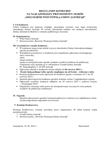 REGULAMIN KONKURSU NA NAJŁADNIEJSZY PRZYDOMOWY OGRÓD „MÓJ OGRÓD WIZYTÓWKĄ GMINY JASTRZĄB” I. Cel konkursu. Celem konkursu jest poprawa wyglądu, utrzymania czystości oraz stanu środowiska naturalnego Gminy Jastrząb. W swoich założeniach konkurs ma zachęcić mieszkańców Gminy Jastrząb do dbałości o estetykę najbliższego otoczenia. II. Organizatorzy: Wójt Gminy Jastrząb Stowarzyszenie „Rozwój i Promocja Gminy Jastrząb” III. Uczestnictwo i zasady konkursu. • W konkursie mogą wziąć udział wszyscy mieszkańcy Gminy Jastrząb posiadający ogrody przydomowe. • Warunkiem uczestnictwa w konkursie jest wypełnienie zgłoszenia zawierającego: imię i nazwisko, adres, numer telefonu, zgodę na sfotografowanie ogrodu i podanie wyników konkursu do publicznej wiadomości oraz złożenie go w sekretariacie Urzędu Gminy Jastrząb, Pl. Niepodległości 5, 26-502 Jastrząb. • Zgłoszenia udziału w konkursie można składać do 06 czerwca 2012 r. • Ocenie będą podlegać tylko ogrody znajdujące się od frontu – widoczne z ulicy • Komisja konkursowa oceni zgłoszone do konkursu ogrody w terminie od 11 do 20 czerwca 2012 r. • Spośród zgłoszonych do konkursu ogrodów komisja wyłoni 3 najpiękniejsze ogrody. • Ogłoszenie wyników konkursu odbędzie się 24 czerwca 2012 r. podczas festynu „ Świętojanki 2012” • Organizator zastrzega sobie prawo do sfotografowania zwycięzców oraz podania wyników do publicznej wiadomości. IV. Nagrody Spośród zgłoszonych ogrodów komisja konkursowa wybierze trzy najładniejsze, które zostaną nagrodzone nagrodami rzeczowymi. V. Komisja Konkursowa. Komisja Konkursowa zostanie powołana przez organizatora. W skład komisji wejdą przedstawiciele: Urzędu Gminy Jastrząb Stowarzyszenia „ Rozwój i Promocja Gminy Jastrząb” Jastrząb dn. 10. 05. 2012 r. Zatwierdził: