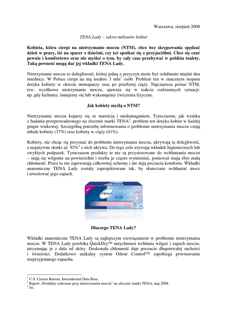 Warszawa, sierpień 2008 TENA Lady – sekret milionów kobiet