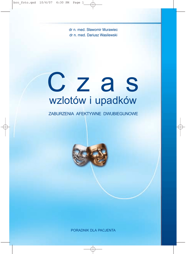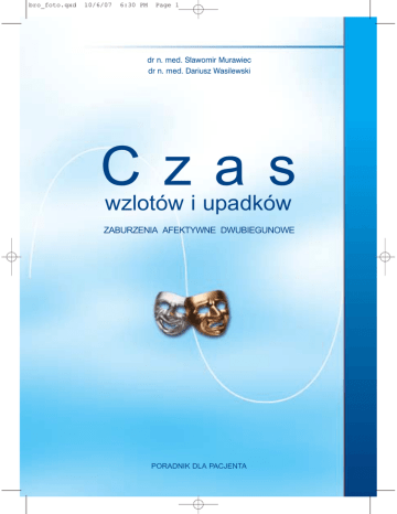 bro_foto.qxd 10/6/07 6:30 PM Page 1 dr n. med. Sławomir Murawiec dr n. med. Dariusz Wasilewski Czas wzlotów i upadków ZABURZENIA AFEKTYWNE DWUBIEGUNOWE PORADNIK DLA PACJENTA bro_foto.qxd 10/6/07 6:31 PM Page 2 Sponsorem edukacyjnym wydania jest: ul. Domaniewska 41, 02-672 Warszawa tel. +48 022 541 46 45 faks +48 022 541 46 08 2 bro_foto.qxd 10/6/07 6:31 PM Page 3 spis treści Jakie są objawy choroby afektywnej dwubiegunowej ........................................................... 2 Wystąpienie choroby dwubiegunowej nie wynika z niczyjej winy ........................................ 3 Wiele osób na świecie cierpi na różne zaburzenia afektywne .............................................. 3 Czym się różni choroba afektywna dwubiegunowa od zwykłych wahań nastroju ............. 4 Przyczyny występowania choroby afektywnej dwubiegunowej ........................................... 4 Ważna jest postawa osób w otoczeniu kogoś, kto choruje na choroby afektywne ........... 5 Leczenie choroby afektywnej dwubiegunowej ...................................................................... 6 Leki ............................................................................................................................................ 6 Psychoterapia ........................................................................................................................... 6 Jeśli leki nie pomagają od razu .............................................................................................. 8 Mówić czy nie mówić o swojej chorobie ............................................................................... 8 Choroba afektywna dwubiegunowa może zagrażać poważnymi skutkami życiowymi ... 9 Gdy pojawią się myśli samobójcze ....................................................................................... 10 Objawy początkowe pojawiają się zanim wystąpi pełny nawrót choroby afektywnej ...... 10 3 bro_foto.qxd 10/6/07 6:31 PM Page 4 CHOROBA AFEKTYWNA DWUBIEGUNOWA mów. I wówczas ta „choroba nastroju” może wymagać leczenia. Tak jak każda inna choroba spośród tych, które mogą nas dotknąć. Gdy zgłosimy się do lekarza, usłyszymy medyczne rozpoznanie tego, co stanowi problem. Usłyszymy o zaburzeniach nastroju, czyli o chorobach afektywnych. Jednym z takich zaburzeń nastroju są zaburzenia afektywne dwubiegunowe (choroba afektywna dwubiegunowa). Jakie są objawy choroby afektywnej dwubiegunowej? K ażdy człowiek ma jakiś nastrój, i miewa zmiany tego nastroju. Możemy być smutni, lub weseli. Pobudzeni i aktywni, lub przygaszeni i apatyczni. To część naszego życia. To także sposób, w jaki reagujemy na przyjemne lub niekorzystne w nim wydarzenia. Nastrój jest tłem, które nadaje życiu barwę, koloryt. Czasem oświetla nasz świat słonecznym blaskiem, a czasem pogrąża w mroku. Nasza aktywność jest zazwyczaj związana z nastrojem. Gdy jest nam wesoło, czujemy dużo energii i chęci do działania. Gdy pojawia się smutek, najprostsze czynności mogą być ciężarem ponad siły. Nastrój jest częścią nas samych. I tak jak wszystko w nas, może czasami „zachorować” i przysporzyć nam proble- 4 Zaburzenia afektywne dwubiegunowe, lub krócej zaburzenia dwubiegunowe, były nazywane kiedyś psychozą maniakalno-depresyjną. Są one rozpoznawane u osób, u których następują duże zmiany nastroju trwające najczęściej tygodnie lub miesiące, choć niekiedy dni lub lata. U osób z zaburzeniami dwubiegunowymi nastrój może przechylić się nadmiernie w stronę smutku lub w stronę euforii. Obrazowo mówi się czasami, że można mieć „górkę” lub „dołek”. Te „górki” bywają bardzo wysokie, a „dołki” bardzo głębokie. W „górce” nastrój jest nadmiernie dobry, nazywany euforycznym, czasami podbarwiony niecierpliwością i drażliwością. Aktywność jest przesadna, wszystko wydaje się łatwe do osiągnięcia, ma miejsce duża łatwość wchodzenia w poufałe relacje z innymi i za wiele dzieje się na raz. Mówimy wtedy o manii lub zespole maniakalnym. Może być tak, że na- bro_foto.qxd 10/6/07 6:32 PM Page 5 strój wędruje w drugą stronę, w kierunku smutku, przygnębienia, zniechęcenia, zmęczenia i zobojętnienia. Wtedy zrobienie czegokolwiek może wiązać się z wielkim wysiłkiem. Mówimy wtedy o depresji lub zespole depresyjnym. Osoby z zaburzeniami dwubiegunowymi miewają okresowo nawroty zespołów maniakalnych i zespołów depresyjnych. Mówimy o cyklicznym lub nawrotowym przebiegu tej choroby. Na przykład ktoś przebył depresję i powrócił do zdrowia. Taki stan powrotu do zdrowia może być trwały i nawrót dolegliwości może nie nastąpić. Ale może być też tak, że po pewnym czasie (miesiące, lata) powróci ponownie depresja lub pojawi się mania. Ich nawroty u jednych osób bywają nieregularne, u innych są związane z porami roku (wiosna, jesień). Nie można przewidzieć czy i kiedy wystąpi kolejny nawrót i jaki będzie miał charakter. Wystąpienie choroby dwubiegunowej nie wynika z niczyjej winy Jeśli u kogoś zostanie stwierdzona choroba dwubiegunowa, taka osoba ma wiele pytań, wątpliwości i lęków. Na niektóre z nich postaramy się odpowiedzieć w tej broszurze. Jeśli nie będzie tu odpowiedzi na jakieś pytanie, trzeba je zadać swojemu lekarzowi lub psychologowi. Zacznijmy od tego, że wystąpienie choroby dwubiegunowej nie jest winą osoby chorującej, ani jej otoczenia czy bliskich. Choroby dotyczące psychiki w pewnym zakresie różnią się od chorób dotyczących ciała (bo ulegają w nich zaburzeniu myśli, uczucia, zachowanie), ale poza tym są takimi samymi chorobami jak wszystkie inne. Pomyślmy o osobie chorej na serce, grypę, raka. Nie jest to jej wina, że zachorowała. Wszyscy jej współczują. Nie ma wątpliwości, że musi podjąć leczenie. Ale też nie jest tak, że nie ma wpływu na przebieg choroby. Na przykład: jeśli pali pap