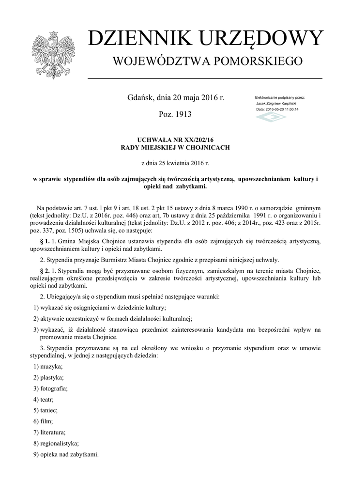 DZIENNIK URZĘDOWY WOJEWÓDZTWA POMORSKIEGO Gdańsk, dnia 20 maja 2016 r. Elektronicznie podpisany przez: Jacek Zbigniew Karpiński Poz. 1913 Data: 2016-05-20 11:00:14 UCHWAŁA NR XX/202/16 RADY MIEJSKIEJ W CHOJNICACH z dnia 25 kwietnia 2016 r. w sprawie stypendiów dla osób zajmujących się twórczością artystyczną, upowszechnianiem kultury i opieki nad zabytkami. Na podstawie art. 7 ust. l pkt 9 i art, 18 ust. 2 pkt 15 ustawy z dnia 8 marca 1990 r. o samorządzie gminnym (tekst jednolity: Dz.U. z 2016r. poz. 446) oraz art, 7b ustawy z dnia 25 października 1991 r. o organizowaniu i prowadzeniu działalności kulturalnej (tekst jednolity: Dz.U. z 2012 r. poz. 406; z 2014r., poz. 423 oraz z 2015r. poz. 337, poz. 1505) uchwala się, co następuje: § 1. 1. Gmina Miejska Chojnice ustanawia stypendia dla osób zajmujących się twórczością artystyczną, upowszechnianiem kultury i opieki nad zabytkami. 2. Stypendia przyznaje Burmistrz Miasta Chojnice zgodnie z przepisami niniejszej uchwały. § 2. 1. Stypendia mogą być przyznawane osobom fizycznym, zamieszkałym na terenie miasta Chojnice, realizującym określone przedsięwzięcia w zakresie twórczości artystycznej, upowszechniania kultury lub opieki nad zabytkami. 2. Ubiegający/a się o stypendium musi spełniać następujące warunki: 1) wykazać się osiągnięciami w dziedzinie kultury; 2) aktywnie uczestniczyć w formach działalności kulturalnej; 3) wykazać, iż działalność stanowiąca przedmiot zainteresowania kandydata ma bezpośredni wpływ na promowanie miasta Chojnice. 3. Stypendia przyznawane są na cel określony we wniosku o przyznanie stypendium oraz w umowie stypendialnej, w jednej z następujących dziedzin: 1) muzyka; 2) plastyka; 3) fotografia; 4) teatr; 5) taniec; 6) film; 7) literatura; 8) regionalistyka; 9) opieka nad zabytkami. Dziennik Urzędowy Województwa Pomorskiego –2– Poz. 1913 § 3. Burmistrz Miasta Chojnice przyznaje stypendium z inicjatywy własnej lub na wniosek: 1) zainteresowanych twórców i artystów; 2) stowarzyszeń zrzeszających twórców i artystów; 3) dyrektorów instytucji kultury; 4) komisji Rady Miejskiej właściwej ds. kultury; 5) innych jednostek organizacyjnych, których statutowy zakres merytoryczny obejmuje zadania w dziedzinie upowszechniania kultury i sztuki. § 4. 1. Stypendium jest przyznawane w kwocie: 2.000,00 zł, 4.000,00 zł, 6.000,00 zł, 8.000,00 zł, 10.000,00 zł i wypłacane jednorazowo w terminie 14 dni od dnia podpisania umowy stypendialnej lub w transzach. 2. Wysokość kwoty, przeznaczonej na stypendia na każdy rok, określona jest w budżecie miasta Chojnice. 3. Liczba stypendiów w danym roku jest uzależniona od możliwości finansowych miasta i może podlegać zmianom w poszczególnych latach. 4. Stypendium ma charakter uznaniowy. 5. Burmistrz Miasta może w danym roku nie przyznać żadnego stypendium. 6. W danym roku budżetowym jedna osoba może otrzymać jedno stypendium. § 5. 1. Wniosek o przyznanie stypendium powinien być szczegółowo umotywowany i udokumentowany w odniesieniu do osiągnięć kandydata. W przypadku zgłoszenia wniosku przez osobę fizyczną do wniosku należy dołączyć co najmniej jedną rekomendację podmiotu, o którym mowa w § 3 pkt 2 - 4. 2. Wzór wniosku o stypendium stanowi załącznik do uchwały. 3. Wniosek formułowany jest w oparciu o dane z rocznego okresu poprzedzającego termin składania wniosków. 4. Wniosek pozostaje bez rozpatrzenia w przypadku: 1) złożenia wniosku po wyznaczonym terminie; 2) pisemnego wycofania wniosku przez wnioskodawcę; 3) nieusunięcia braków formalnych, po wcześniejszym wezwaniu burmistrza, w terminie 7 dni. 5. Wnioski o przyznanie stypendium składa się w terminie do dnia l5 kwietnia każdego roku kalendarzowego w Biurze Podawczym Urzędu Miejskiego w Chojnicach. 6. W szczególnie uzasadnionych przypadkach wniosek może zostać złożony po terminie, o którym mowa w ust. 5. 7. Złożenie wniosku nie jest równoznaczne z udzieleniem stypendium. § 6. Decyzję w sprawie przyznania stypendium podejmuje Burmistrz Miasta po zapoznaniu się z opinią komisji stypendialnej. Opinia, o której mowa nie wiąże Burmistrza Miasta. Od podjętej decyzji nie przysługuje odwołanie. § 7. 1. W skład komisji, o której mowa w § 6, wchodzą: 1) trzech przedstawicieli Rady Miejskiej; 2) dwóch przedstawicieli Burmistrza Miasta; 3) dwóch przedstawicieli zajmujących się twórczością artystyczną lub upowszechnianiem kultury. 2. Członkowie komisji pełnią swoją funkcję społecznie. 3. w pracach komisji nie mogą brać udziału osoby, które pozostają z wnioskodawcą lub kandydatem do stypendium w takim stosunku prawnym lub faktycznym, który mógłby budzić wątpliwości co do bezstronności oceny wniosku. 4. Do zadań komisji należy: Dziennik Urzędowy Województwa Pomorskiego –3– Poz. 1913 1) rozpatrywanie i opiniowanie wniosków; 2) przedstawienie Burmistrzowi Miasta Chojnice propozycji laureatów oraz propozycji wysokości stypendiów w ramach przewidzianych na ten cel środków w budżecie miasta. 5. Ocena wniosków ma charakter konkursowy, opiera się o ich merytoryczną zawartość i ma na celu udzielenie wsparcia osobom wybitnie uzdolnionym. 6. Przy ocenie wniosków bierze się pod uwagę następujące kryteria: 1) promowanie młodych talentów; 2) przyczynienie się przedsięwzięcia do rozwoju życia kulturalnego i kształtowania tożsamości regionu, opieki nad zabytkami oraz rozwoju umiejętności artystycznych twórcy; 3) cel, jaki zamierza osiągnąć stypendysta realizując przedsięwzięcie w zgłoszonej dziedzinie; 4) ocenę udokumentowanych dokonań i ich znaczenie dla kultury, w tym wkład w rozwój kultury i promocję miasta Chojnice. § 8. Wykonanie uchwały powierza się burmistrzowi miasta Chojnice. § 9. Uchwała wchodzi w życie po upływie 14 dni od dnia jej opublikowania w Dzienniku Urzędowym Województwa Pomorskiego. Przewodniczący Rady Miej