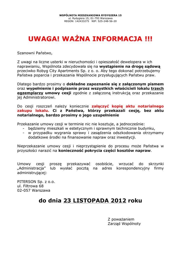 WSPÓLNOTA MIESZKANIOWA RYDYGIERA 15 ul. Rydygiera 15; 01-793 Warszawa REGON: 142433275 NIP: 525-248-56-20 UWAGA! WAŻNA INFORMACJA !!! Szanowni Państwo, Z uwagi na liczne usterki w nieruchomości i opieszałość dewelopera w ich naprawianiu, Wspólnota zdecydowała się na wystąpienie na drogę sądową przeciwko Robyg City Apartments Sp. z o. o. Aby tego dokonać potrzebujemy Państwa poparcia i przekazania Wspólnocie przysługujących Państwu praw. Dlatego bardzo prosimy o dokładne zapoznanie się z załączonym pismem oraz wypełnienie i podpisanie przez wszystkich właścicieli lokalu trzech egzemplarzy umowy cesji zgodnie z załączoną instrukcją oraz przekazanie jej Administratorowi. Do cesji roszczeń należy koniecznie załączyć kopię aktu notarialnego zakupu lokalu. Ci z Państwa, którzy przekazali cesję, bez aktu notarialnego, bardzo prosimy o jego uzupełnienie Przekazanie umowy cesji w terminie nic nie kosztuje, a jednocześnie: - będziemy mieszkali w estetycznym i sprawnym technicznie budynku, - w przypadku wygrania sprawy i zasądzenia odszkodowania otrzymamy dodatkowe środki na finansowanie napraw oraz inwestycji. Nieprzekazanie umowy cesji i nieprzystąpienie do procesu może Państwa w przyszłości narazić na konieczność pokrycia części kosztów napraw. Umowy cesji proszę przekazywać osobiście, wrzucać do skrzynki „Administracja” lub wysłać pocztą na adres korespondencyjny firmy administrującej: PITERSON Sp. z o.o. ul. Filtrowa 68 02-057 Warszawa do dnia 23 LISTOPADA 2012 roku Z poważaniem Zarząd Wspólnoty WSPÓLNOTA MIESZKANIOWA RYDYGIERA 15 ul. Rydygiera 15; 01-793 Warszawa REGON: 142433275 NIP: 525-248-56-20 UWAGA! Umowa Cesji dotyczy tylko i wyłącznie wad i usterek w częściach wspólnych nieruchomości. W przypadku wystąpienia wad w lokalach mieszkalnych każdy właściciel może dochodzić swoich roszczeń jedynie w trybie indywidualnym. Szanowni Państwo, Działając na podstawie uchwały Wspólnoty Mieszkaniowej „Rydygiera 15” nr 6/2011 w sprawie: wystąpienia na drogę sądową przeciwko deweloperowi Robyg City Apartments z tytułu wad w nieruchomości wspólnej oraz pokrycia kosztów usunięcia tych wad oraz uchwały 7/1012 w sprawie: ustalenia wysokości funduszu celowego dotyczącego wystąpienia na drogę sądową przeciwko deweloperowi Robyg City Apartments, zwracamy się do Państwa z prośbą o udzielenie cesji roszczeń, przysługujących członkom Wspólnoty w stosunku do Robyg City Apartments z tytułu wad fizycznych nieruchomości wspólnej. Dnia 23 września 2004r Sąd Najwyższy podjął uchwałę III CZP 48/2004, która mówi o konieczności udzielenia przez właścicieli lokali w formie pisemnej tzw. cesji praw na rzecz Wspólnoty Mieszkaniowej w celu sądowego dochodzenia roszczeń odszkodowawczych związanych z wadami fizycznymi nieruchomości wspólnej w stosunku do dewelopera. W świetle powołanej powyżej Uchwały Sądu Najwyższego, cesja praw jest niezbędnym warunkiem sądowego dochodzenia roszczeń od dewelopera przez Wspólnotę. Wspólnota może dochodzić roszczeń odszkodowawczych związanych z wadami fizycznymi nieruchomości wspólnej jedynie w przypadku, gdy takie prawa przeleją na nią właściciele lokali. Teoretycznie każdy właściciel może sam wystąpić do sądu z takimi roszczeniami, ale wtedy będzie musiał udowodnić wysokość szkody w całej nieruchomości wspólnej, ponieść koszty procesu, a sąd zasądzi mu odszkodowanie odpowiednio do posiadanego udziału w nieruchomości wspólnej. Np. gdyby całość roszczenia wynosiła 1.000.000 zł, a właściciel posiadał 0,5% udziału, to sąd mógłby mu zasądzić odszkodowanie w kwocie 5.000 zł. W przypadku naszej Wspólnoty wartość roszczeń została oszacowana na kwotę prawie 1.000.000 zł. Uważamy, że indywidualne dochodzenie roszczeń za wady nieruchomości wspólnej byłoby bardzo trudne, kosztowne i czasochłonne. Dlatego proponujemy złożenie jednego pozwu w oparciu o cesje praw właścicieli. Ci właściciele, którzy nie udzielą cesji Wspólnocie, mogą dochodzić roszczeń indywidualnie albo zaniechać jakichkolwiek działań. Jednak jeśli jako Wspólnota wygramy proces i uzyskamy odszkodowanie, wtedy ci z Państwa, którzy udzielili cesji – zyskają powyższe odszkodowanie, a ci z Państwa, którzy jej nie udzielili, będą musieli sami pokryć koszty napraw, a następnie sądzić się z deweloperem o zwrot tych kosztów. Mając na uwadze koszty sądowe (wpis sądowy, wynagrodzenie biegłych sądowych, koszty zastępstwa procesowego), a także wysokość odszkodowania, Wspólnota wystąpi do sądu tylko w przypadku podpisania Umowy Cesji przez właścicieli reprezentujących co najmniej 70% udziałów. Mamy nadzieję, iż Robyg City Apartments usunie wszystkie zgłoszone wady i usterki, bądź przed upływem okresu rękojmi podpisze ugodę w tej sprawie. Wtedy droga sądowa będzie zbędna. Jednak na wypadek braku porozumienia z deweloperem prosimy o podpisanie umowy cesji już teraz, tak abyśmy mieli przygotowane wszystkie niezbędne do wystąpienia na drogę sądową dokumenty przed upływem okresu rękojmi. W niniejszej korespondencji znajdziecie Państwo druki Umowy Cesji oraz instrukcję ich wypełnienia. Prosimy o wypełnienie i podpisanie cesji w trzech egzemplarzach. Jeden egzemplarz, po podpisaniu przez Zarząd, zostanie Państwu zwrócony. W przypadku gdy właścicielami mieszkania jest małżeństwo lub współwłaściciele, prosimy o podpisanie Umowy Cesji przez oboje małżonków lub wszystkich współwłaścicieli. Informacje o dokładnych terminach przekazania cesji będą podawane na tablicach ogłoszeniowych oraz za pośrednictwem strony internetowej http://rydygiera15.pl. Z poważaniem, Zarząd Wspólnoty Mieszkaniowej „Rydygiera 15” WSPÓLNOTA MIESZKANIOWA RYDYGIERA 15 ul. Rydygiera 15; 01-793 Warszawa REGON: 142433275 NIP: 525-248-56-20 INSTRUKCJA WYPEŁNIANIA CESJI ROSZCZEŃ 