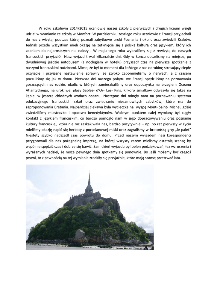 W roku szkolnym 2014/2015 uczniowie naszej szkoły z pierwszych i drugich liceum wzięli udział w wymianie ze szkołą w Monfort. W październiku zeszłego roku uczniowie z Francji przyjechali do nas z wizytą, podczas której poznali zabytkowe uroki Poznania i okolic oraz zwiedzili Kraków. Jednak przede wszystkim mieli okazję na zetknięcie się z polską kulturą oraz językiem, który ich zdaniem do najprostszych nie należy . W maju tego roku wybraliśmy się z rewizytą do naszych francuskich przyjaciół. Nasz wyjazd trwał kilkanaście dni. Gdy w końcu dotarliśmy na miejsce, po dwudniowej jeździe autobusem (z noclegiem w hotelu) przyszedł czas na pierwsze spotkanie z naszymi francuskimi rodzinami. Mimo, że był to moment dla każdego z nas odrobinę stresujący ciepłe przyjęcie i przyjazne nastawienie sprawiły, że szybko zapomnieliśmy o nerwach, a z czasem poczuliśmy się jak w domu. Pierwsze dni naszego pobytu we Francji spędziliśmy na poznawaniu goszczących nas rodzin, okolic w których zamieszkaliśmy oraz odpoczynku na brzegiem Oceanu Atlantyckiego, na urokliwej plaży Sables- d’Or- Les- Pins. Kilkoro śmiałków odważyło się także na kąpiel w jeszcze chłodnych wodach oceanu. Następne dni minęły nam na poznawaniu systemu edukacyjnego francuskich szkół oraz zwiedzaniu niesamowitych zabytków, które ma do zaproponowania Bretania. Najbardziej ciekawa była wycieczka na wyspę Mont- Saint- Michel, gdzie zwiedziliśmy miasteczko i opactwo benedyktynów. Ważnym punktem całej wymiany był ciągły kontakt z językiem francuskim, co bardzo pomogło nam w jego dopracowywaniu oraz poznanie kultury francuskiej, która nie raz zaskakiwała nas, bardzo pozytywnie – np. po raz pierwszy w życiu mieliśmy okazję napić się herbaty z porcelanowej miski oraz zagraliśmy w bretońską grę: „le palet” Niestety szybko nadszedł czas powrotu do domu. Przed naszym wyjazdem nasi korespondenci przygotowali dla nas pożegnalną imprezę, na której wszyscy razem mieliśmy ostatnią szansę by wspólnie spędzić czas i dobrze się bawić. Sam dzień wyjazdu był pełen podziękowań, łez wzruszenia i wyrażanych nadziei, że może pewnego dnia spotkamy się ponownie. Bo jeśli możemy być czegoś pewni, to z pewnością na tej wymianie zrodziły się przyjaźnie, które mają szansę przetrwać lata. Maria Kruczkowska i Natalia Popłonyk z klasy Vita-2