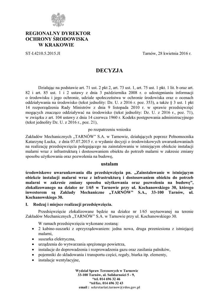 REGIONALNY DYREKTOR OCHRONY ŚRODOWISKA W KRAKOWIE Tarnów, 28 kwietnia 2016 r. ST-I.4210.5.2015.JI DECYZJA Działając na podstawie art. 71 ust. 2 pkt 2, art. 73 ust. 1, art. 75 ust. 1 pkt. 1 lit. b oraz art. 82 i art. 85 ust. 1 i 2 ustawy z dnia 3 października 2008 r. o udostępnianiu informacji o środowisku i jego ochronie, udziale społeczeństwa w ochronie środowiska oraz o ocenach oddziaływania na środowisko (tekst jednolity: Dz. U. z 2016 r. poz. 353), a także § 3 ust. 1 pkt 14 rozporządzenia Rady Ministrów z dnia 9 listopada 2010 r. w sprawie przedsięwzięć mogących znacząco oddziaływać na środowisko (tekst jednolity: Dz. U. z 2016 r., poz. 71), w związku z art. 104 ustawy z dnia 14 czerwca 1960 r. Kodeks postępowania administracyjnego (tekst jednolity Dz. U. z 2016 r., poz. 21), po rozpatrzeniu wniosku Zakładów Mechanicznych „TARNÓW” S.A. w Tarnowie, działających poprzez Pełnomocnika Katarzynę Łucka, z dnia 07.07.2015 r. o wydanie decyzji o środowiskowych uwarunkowaniach na realizację przedsięwzięcia polegającego na zainstalowaniu w istniejącym obiekcie instalacji malarni wraz z infrastrukturą i dostosowaniem obiektu do potrzeb malarni w zakresie zmiany sposobu użytkowania oraz pozwolenia na budowę, ustalam środowiskowe uwarunkowania dla przedsięwzięcia pn. „Zainstalowanie w istniejącym obiekcie instalacji malarni wraz z infrastrukturą i dostosowaniem obiektu do potrzeb malarni w zakresie zmiany sposobu użytkowania oraz pozwolenia na budowę”, zlokalizowanego na działce nr 1/65 w Tarnowie przy ul. Kochanowskiego 30, którego inwestorem są Zakłady Mechaniczne „TARNÓW” S.A., 33-100 Tarnów, ul. Kochanowskiego 30. I. Rodzaj i miejsce realizacji przedsięwzięcia. Przedsięwzięcie zlokalizowane będzie na działce nr 1/65 usytuowanej na terenie Zakładów Mechanicznych „TARNÓW” S.A. w Tarnowie przy ul. Kochanowskiego 30. W ramach przedsięwzięcia wykonane zostaną: 2 kabino-suszarki z oprzyrządowaniem: jedna nowa, druga przeniesiona z istniejącej malarni, suszarka elektryczna, urządzenia do wytwarzania sprężonego powietrza, instalacje do doprowadzenia i rozprowadzenia gazu oraz zasilania palników, pojemniki do składowania i transportu części, regały, biurka itp. elementy, instalacje wentylacyjne, Wydział Spraw Terenowych w Tarnowie 33-100 Tarnów, al. Solidarności 5 - 9, *tel. 014 696 32 46 *tel/fax. 014 696 32 43 email : [email protected] 2 rozdzielnie zasilające w energię elektryczną wraz z główną szafą zasilająco - sterowniczą (GST) oraz instalacja elektryczna od rozdzielni do szaf zasilająco - sterowniczych urządzeń, instalacje sygnalizacyjne oraz blokady uzależniające pracę poszczególnych urządzeń, instalacje grzewcze pomieszczeń, instalacje wodno – kanalizacyjne, instalacje wentylacji ogólnej pomieszczeń, instalacje oświetlenia pomieszczeń, wyposażenie p.poż. pomieszczeń malarni, pomieszczenia socjalno - bytowe wraz z wyposażeniem. Powierzchnia zabudowy istniejącego budynku przeznaczonego dla malarni wynosi 8 600 m2. Malarnia będzie służyła do malowania elementów produkowanych przez Inwestora. Ze względu na gabaryty niektórych elementów, będą one malowane w dwóch grupach: elementy o maksymalnych wymiarach: (długość x szerokość x wysokość) – 4700 x 2900 x 2900 mm oraz ciężarze maksymalnym do 2 000 kg, elementy o maksymalnych wymiarach: (długość x szerokość x wysokość) – 2000 x 1500 x 1500 mm oraz ciężarze maksymalnym do 100 kg. Elementy zaliczone do pierwszej grupy (o ciężarze powyżej 100 kg) będą transportowane przy wykorzystaniu podłogowych wózków szynowych. Elementy lekkie (o ciężarze poniżej 100 kg) będą transportowane przy wykorzystaniu układu transportu podwieszonego, obsługiwanego ręcznie. W skali roku i rozpuszczalników. w lakierni zużywane będzie łącznie 7100 litrów lakierów II. Warunki wykorzystania terenu w fazie realizacji i eksploatacji lub użytkowania przedsięwzięcia, ze szczególnym uwzględnieniem konieczności ochrony cennych wartości przyrodniczych, zasobów naturalnych i zabytków oraz ograniczenia uciążliwości dla terenów sąsiednich: 1. Wydzielić na placu budowy oraz w miejscu wykonywania robót budowlanych miejsca: postojowe sprzętu budowlanego, awaryjnych napraw sprzętu, w sposób gwarantujący ochronę środowiska gruntowo – wodnego. 2. W trakcie wykonywania robót ciężkim sprzętem zmechanizowanym należy zwrócić szczególną uwagę na bezpieczne prowadzenie prac, które należy wykonywać w odpowiednio przygotowanym i zabezpieczonym terenie. 3. Należy właściwie gospodarować odpadami w czasie budowy, w tym minimalizować ich ilość, prowadzić selektywną zbiórkę odpadów nadających się do odzysku lub unieszkodliwiania w szczelnych, oznakowanych pojemnikach, w wydzielonym miejscu, w warunkach zabezpieczających przed wpływem czynników atmosferycznych i dostępem osób postronnych oraz przekazywać je podmiotom posiadającym stosowne zezwolenia. III. Wymagania dotyczące ochrony środowiska konieczne w dokumentacji wymaganej do wydania pozwolenia na budowę. do uwzględnienia 1. Pobór wody należy realizować w oparciu o miejską sieć wodociągową. 2. Ścieki socjalno – bytowe należy odprowadzać do miejskiej sieci kanalizacji sanitarnej. 3 3. Wody opadowo – roztopowe z terenów przedsięwzięcia przed odprowadzeniem do rzeki Biała należy oczyścić w separatorze substancji ropopochodnych i osadniku zawiesiny ogólnej. 4. Ogrzewanie kabino – suszarki nr 1 i kabino – suszarki nr 2 należy zrealizować w oparciu o gaz ziemny. 5. Zanieczyszczenia z procesu spalania gazu w palniku gazowym zainstalowanym w kabino suszarce nr 1 należy odprowadzać do powietrza emitorem o średnicy 0,2 m i o wysokości minimum 13,0 m. 6. Zanieczyszczenia z procesu spalania gazu w palniku gazowym zainstalowanym w kabino suszarce nr 2 należy odprowadzać do powietrza emitorem o