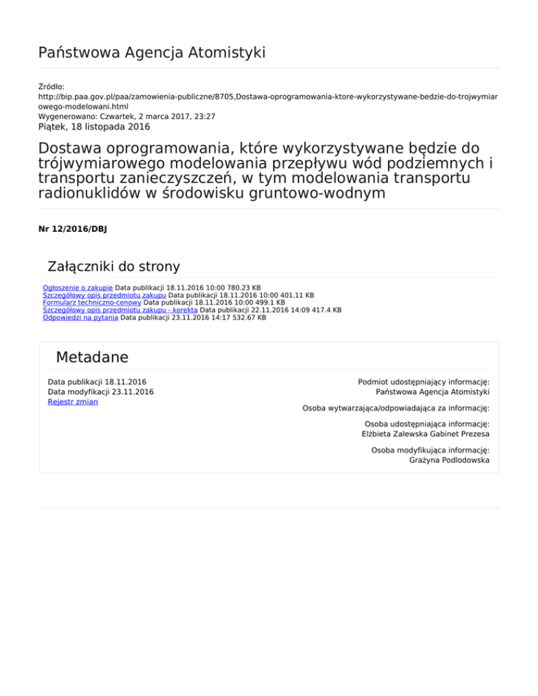 Państwowa Agencja Atomistyki Źródło: http://bip.paa.gov.pl/paa/zamowienia-publiczne/8705,Dostawa-oprogramowania-ktore-wykorzystywane-bedzie-do-trojwymiar owego-modelowani.html Wygenerowano: Czwartek, 2 marca 2017, 23:27 Piątek, 18 listopada 2016 Dostawa oprogramowania, które wykorzystywane będzie do trójwymiarowego modelowania przepływu wód podziemnych i transportu zanieczyszczeń, w tym modelowania transportu radionuklidów w środowisku gruntowo-wodnym Nr 12/2016/DBJ Załączniki do strony Ogłoszenie o zakupie Data publikacji 18.11.2016 10:00 780.23 KB Szczegółowy opis przedmiotu zakupu Data publikacji 18.11.2016 10:00 401.11 KB Formularz techniczno-cenowy Data publikacji 18.11.2016 10:00 499.1 KB Szczegółowy opis przedmiotu zakupu - korekta Data publikacji 22.11.2016 14:09 417.4 KB Odpowiedzi na pytania Data publikacji 23.11.2016 14:17 532.67 KB Metadane Data publikacji 18.11.2016 Data modyfikacji 23.11.2016 Rejestr zmian Podmiot udostępniający informację: Państwowa Agencja Atomistyki Osoba wytwarzająca/odpowiadająca za informację: Osoba udostępniająca informację: Elżbieta Zalewska Gabinet Prezesa Osoba modyfikująca informację: Grażyna Podlodowska