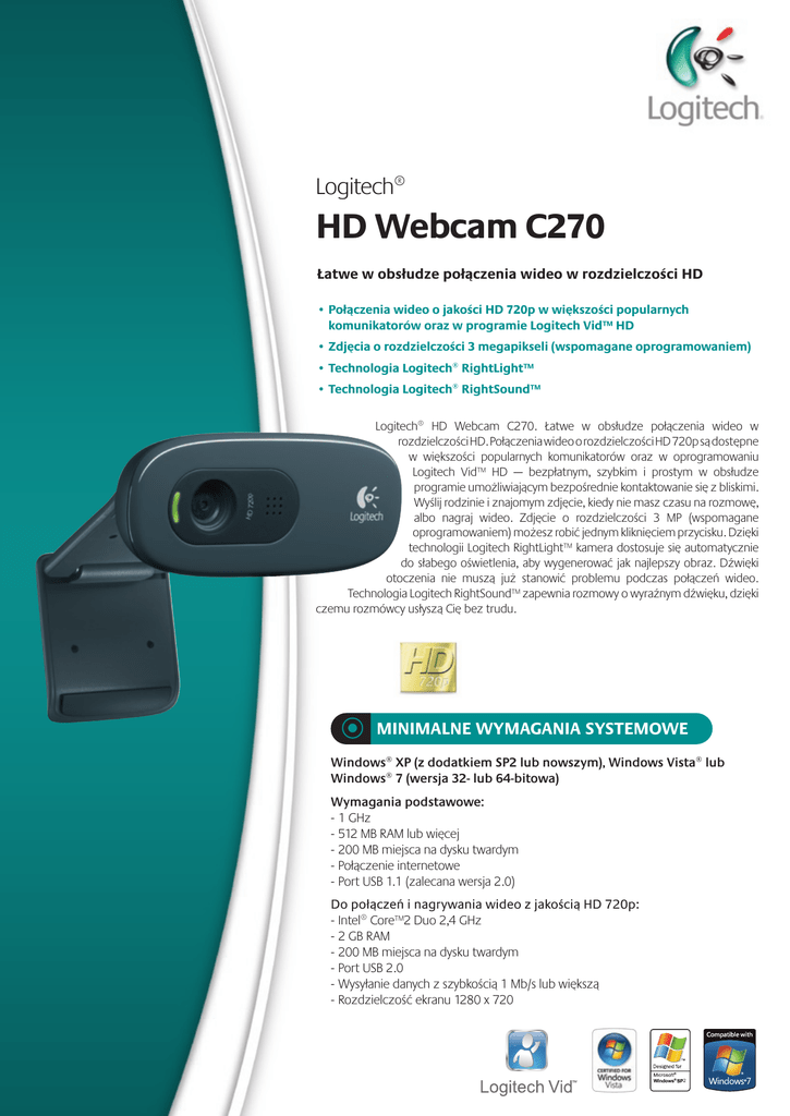Logitech® HD Webcam C270 Łatwe w obsłudze połączenia wideo w rozdzielczości HD • Połączenia wideo o jakości HD 720p w większości popularnych komunikatorów oraz w programie Logitech Vid™ HD • Zdjęcia o rozdzielczości 3 megapikseli (wspomagane oprogramowaniem) • Technologia Logitech® RightLight™ • Technologia Logitech® RightSound™ Logitech® HD Webcam C270. Łatwe w obsłudze połączenia wideo w rozdzielczości HD. Połączenia wideo o rozdzielczości HD 720p są dostępne w większości popularnych komunikatorów oraz w oprogramowaniu Logitech Vid™ HD — bezpłatnym, szybkim i prostym w obsłudze programie umożliwiającym bezpośrednie kontaktowanie się z bliskimi. Wyślij rodzinie i znajomym zdjęcie, kiedy nie masz czasu na rozmowę, albo nagraj wideo. Zdjęcie o rozdzielczości 3 MP (wspomagane oprogramowaniem) możesz robić jednym kliknięciem przycisku. Dzięki technologii Logitech RightLight™ kamera dostosuje się automatycznie do słabego oświetlenia, aby wygenerować jak najlepszy obraz. Dźwięki otoczenia nie muszą już stanowić problemu podczas połączeń wideo. Technologia Logitech RightSound™ zapewnia rozmowy o wyraźnym dźwięku, dzięki czemu rozmówcy usłyszą Cię bez trudu. Minimalne wymagania systemowe Windows® XP (z dodatkiem SP2 lub nowszym), Windows Vista® lub Windows® 7 (wersja 32- lub 64-bitowa) Wymagania podstawowe: -- 1 GHz -- 512 MB RAM lub więcej -- 200 MB miejsca na dysku twardym -- Połączenie internetowe -- Port USB 1.1 (zalecana wersja 2.0) Do połączeń i nagrywania wideo z jakością HD 720p: -- Intel® Core™2 Duo 2,4 GHz -- 2 GB RAM -- 200 MB miejsca na dysku twardym -- Port USB 2.0 -- Wysyłanie danych z szybkością 1 Mb/s lub większą -- Rozdzielczość ekranu 1280 x 720 2 Logitech® HD Webcam C270 Dane techniczne - Połączenia wideo HD (1280 x 720 pikseli) na komputerze z zalecaną konfiguracją - Nagrywanie wideo: do 1280 x 720 pikseli - Zdjęcia: do 3,0 megapikseli (wspomagane oprogramowaniem) - Wbudowany mikrofon z technologią Logitech RightSound™ - Certyfikat zgodności ze standardem Hi-Speed USB 2.0 (zalecany) - Uniwersalny zaczep do laptopów oraz monitorów LCD i CRT Oprogramowanie do kamery internetowej firmy Logitech: - Logitech Vid™ HD - Technologia Logitech RightLight™ - Nagrywanie wideo i robienie zdjęć Działa z większością aplikacji komunikatorów Szczegóły techniczne pakietu Primary Pack (Single Pack) Nr katalogowy # WER Kod kreskowy Nr katalogowy # CENTRAL Kod kreskowy Nr katalogowy # EER Master Shipper (Out Case Pack) 960-000582 n/a 5099206023758 (EAN-13) 50992060237517 (SCC-14) 960-000635 n/a 5099206023802 (EAN-13) 50992060238019 (SCC-14) 960-000636 n/a 5099206023819 (EAN-13) 50992060238118 (SCC-14) 226.8g 2.147 kg Długość (Szerokość) 20.95cm 31.50cm Szerokość (Głębokość) 7.62 cm 31.06cm Kod kreskowy Waga Wysokość/Głębokość (Wysokość) 15.24 cm 22.40 cm Objętość 2.433dm3 0.02230m3 1 Primary Pack (Single Carton) 1 n/a 1 Intermediate Pack (Case Pack) 0 n/a 1 Master Shipper (Outer Case Pack) 8 1 432 54 1 Container 20ft 10080 1260 1 Container 40 ft 21280 2660 1 Container 40 ft HQ 23408 2926 1 Pallet EURO Zawartość opakowania •Kamera internetowa z kablem 1,5 m •Zestaw słuchawkowy •Oprogramowanie do kamery internetowej Logitech Vid™ HD •Dokumentacja www.logitech.com Logitech® Vid™. Bezpłatne, szybkie i łatwe nawiązywanie połączeń wideo przy użyciu kamery internetowej firmy Logitech. ©2010 Logitech. Logitech, logo Logitech i inne znaki firmy Logitech są własnością firmy Logitech i mogą być zastrzeżone. Wszystkie inne znaki towarowe są własnością odpowiednich firm.