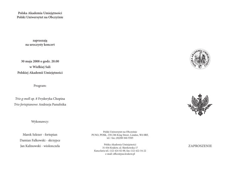 Polska Akademia Umiejętności Polski Uniwersytet na Obczyźnie zapraszają na uroczysty koncert 30 maja 2008 o godz. 20.00 w Wielkiej Sali Polskiej Akademii Umiejętności Program: Trio g-moll op. 8 Fryderyka Chopina Trio fortepianowe Andrzeja Panufnika Wykonawcy: Marek Szlezer - fortepian Damian Falkowski - skrzypce Jan Kalinowski - wiolonczela Polski Uniwersytet na Obczyźnie PUNO, POSK, 238-246 King Street, London, W6 0RF, tel./ fax; (0)208 846 9305 Polska Akademia Umiejętności 31-016 Kraków, ul. Sławkowska 17 Kancelaria tel.: (12) 424-02-00, fax: (12) 422-54-22 e-mail: offi[email protected] ZAPROSZENIE Polska Akademia Umiejętności Polski Uniwersytet na Obczyźnie PIĄTEK – 30 maja 9.15 – OTWARCIE Wprowadzenie Jerzy Wyrozumski – Sekretarz Generalny PAU Wojciech Falkowski – Rektor PUNO zapraszają na sesję naukową Irena Homola-Skąpska Polski Słownik Biograficzny o Polakach działających w Wielkiej Brytanii w XX wieku 16.30–17.00 – PRZERWA Nina Taylor-Terlecka Literatura polska w Wielkiej Brytanii Alicja Moskalowa Angielskie powieści Jerzego Pietrkiewicza Wojciech Stanisław Ligęza Polska poezja emigracyjna w perspektywie europejskiej Dyskusja Tadeusz Radzik Wkład emigracji polskiej w naukę światową Jadwiga Wędzicha Wkład Polaków w Anglii do medycyny akademickiej po drugiej wojnie światowej Wkład wychodźstwa polskiego w naukę i kulturę Wielkiej Brytanii Dyskusja 11.00–11.30 – PRZERWA Halina Taborska Polskie szkoły architektury w Wielkiej Brytanii Włodzimierz Bronic-Czerechowski Wkład architektów polskich do postępu urbanistyki i architektury Wielkiej Brytanii Paul Lasok / Damian Falkowski Trials and Tribulations Ewa Lewandowska-Tarasiuk Kulturowe pomosty: polscy tłumacze i interpretatorzy Dyskusja 13.30–15.00 – PRZERWA NA OBIAD Lady Camilla Panufnik Polish Thoughts and Polish Music Sesja odbędzie się w dniach 30–31 maja 2008 w Wielkiej Sali Polskiej Akademii Umiejętności przy ul. Sławkowskiej 17 w Krakowie Jan W. Sienkiewicz Polskie galerie sztuki w Londynie Joanna Pyłat Wkład najmłodszej emigracji w kulturę brytyjską Dyskusja SOBOTA – 31 maja 9.00 Bernard Kołodziej Wkład religii w zachowanie tożsamości narodowej wśród emigracji polskiej Zbigniew Pełczyński Polski wkład w nauki społeczne i polityczne w Wielkiej Brytanii po 1945 roku Grzegorz Babiński Socjologowie polscy na emigracji Michael Fleming Leszek Kolakowski on Marxism and Religion Dyskusja 11.00–11.30 – PRZERWA Rafał Artur Habielski Kultura polska na obczyźnie. Próba bilansu Jan Lencznarowicz Emigracyjny wybór tradycji. Przykłady nawiązań do polskiej historii w emigracyjnym piśmiennictwie politycznym 1944–1956 Karolina Grodziska Znaki pamięci. Groby ludzi nauki i twórców kultury na cmentarzach Wielkiej Brytanii Dyskusja i zakończenie Sesji 13.00 – LUNCH