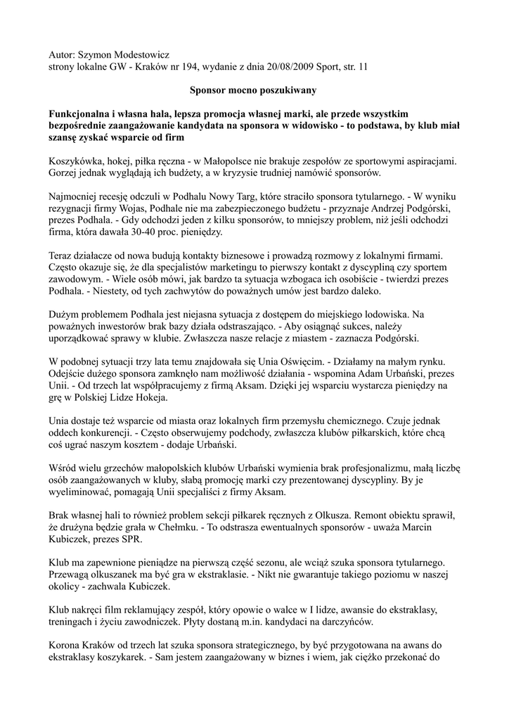 Autor: Szymon Modestowicz strony lokalne GW - Kraków nr 194, wydanie z dnia 20/08/2009 Sport, str. 11 Sponsor mocno poszukiwany Funkcjonalna i własna hala, lepsza promocja własnej marki, ale przede wszystkim bezpośrednie zaangażowanie kandydata na sponsora w widowisko - to podstawa, by klub miał szansę zyskać wsparcie od firm Koszykówka, hokej, piłka ręczna - w Małopolsce nie brakuje zespołów ze sportowymi aspiracjami. Gorzej jednak wyglądają ich budżety, a w kryzysie trudniej namówić sponsorów. Najmocniej recesję odczuli w Podhalu Nowy Targ, które straciło sponsora tytularnego. - W wyniku rezygnacji firmy Wojas, Podhale nie ma zabezpieczonego budżetu - przyznaje Andrzej Podgórski, prezes Podhala. - Gdy odchodzi jeden z kilku sponsorów, to mniejszy problem, niż jeśli odchodzi firma, która dawała 30-40 proc. pieniędzy. Teraz działacze od nowa budują kontakty biznesowe i prowadzą rozmowy z lokalnymi firmami. Często okazuje się, że dla specjalistów marketingu to pierwszy kontakt z dyscypliną czy sportem zawodowym. - Wiele osób mówi, jak bardzo ta sytuacja wzbogaca ich osobiście - twierdzi prezes Podhala. - Niestety, od tych zachwytów do poważnych umów jest bardzo daleko. Dużym problemem Podhala jest niejasna sytuacja z dostępem do miejskiego lodowiska. Na poważnych inwestorów brak bazy działa odstraszająco. - Aby osiągnąć sukces, należy uporządkować sprawy w klubie. Zwłaszcza nasze relacje z miastem - zaznacza Podgórski. W podobnej sytuacji trzy lata temu znajdowała się Unia Oświęcim. - Działamy na małym rynku. Odejście dużego sponsora zamknęło nam możliwość działania - wspomina Adam Urbański, prezes Unii. - Od trzech lat współpracujemy z firmą Aksam. Dzięki jej wsparciu wystarcza pieniędzy na grę w Polskiej Lidze Hokeja. Unia dostaje też wsparcie od miasta oraz lokalnych firm przemysłu chemicznego. Czuje jednak oddech konkurencji. - Często obserwujemy podchody, zwłaszcza klubów piłkarskich, które chcą coś ugrać naszym kosztem - dodaje Urbański. Wśród wielu grzechów małopolskich klubów Urbański wymienia brak profesjonalizmu, małą liczbę osób zaangażowanych w kluby, słabą promocję marki czy prezentowanej dyscypliny. By je wyeliminować, pomagają Unii specjaliści z firmy Aksam. Brak własnej hali to również problem sekcji piłkarek ręcznych z Olkusza. Remont obiektu sprawił, że drużyna będzie grała w Chełmku. - To odstrasza ewentualnych sponsorów - uważa Marcin Kubiczek, prezes SPR. Klub ma zapewnione pieniądze na pierwszą część sezonu, ale wciąż szuka sponsora tytularnego. Przewagą olkuszanek ma być gra w ekstraklasie. - Nikt nie gwarantuje takiego poziomu w naszej okolicy - zachwala Kubiczek. Klub nakręci film reklamujący zespół, który opowie o walce w I lidze, awansie do ekstraklasy, treningach i życiu zawodniczek. Płyty dostaną m.in. kandydaci na darczyńców. Korona Kraków od trzech lat szuka sponsora strategicznego, by być przygotowana na awans do ekstraklasy koszykarek. - Sam jestem zaangażowany w biznes i wiem, jak ciężko przekonać do inwestowania w sport - opowiada Jan Mostowik, prezes Korony. - Ciężko też rywalizować z tak medialną dyscypliną jak piłka nożna. Klub z Podgórza wprowadza nowoczesną strategię promowania marki. - Podjęliśmy współpracę z firmą z Łodzi, która przygotowała plan działania w celu wzmocnienia naszej pozycji - twierdzi Mostowik. Są kluby, którym udało się namówić poważną firmę i to na dobre i na złe. Tak Can-Pack związał się z Wisłą. - Klubowi zależy na wizerunku drużyny. Dodanie członu nazwy sponsora lub umieszczenie reklam na strojach kosztuje najwięcej - zdradza Robert Strupiechowski, kierownik marketingu Wisły. - Pozostałe formy: banery w hali, reklama na materiałach poligraficznych lub w internecie są dostępne dla każdej, nawet drobnej firmy. Przedstawiciel Wisły zaznacza, że w kontaktach z firmami liczy się bezpośrednie zaangażowanie w widowisko. - Ważne, by potencjalnych reklamodawców zaprosić na mecz. Muszą przekonać się, że warto - zaznacza Strupiechowski. - Wysyłać ofertę reklamową bez jakiejkolwiek wcześniejszej rozmowy nie ma sensu. Dla "Gazety" Piotr Jakóbik agencja Sport Evolution O coraz większym zainteresowaniu sponsoringiem sportowym świadczą badania. Potencjał rozwoju jest ogromny. Jeśli popatrzymy na sumy, jakie na sponsoring sportowy wydają firmy na Zachodzie, zobaczymy, że dzielą nas od nich lata świetlne. Część firm wyłożyłaby pieniądze na sport, gdyby miała z kim rozmawiać w klubach. "Działacze" są jednak często nieprzygotowani do takich rozmów. Nieprofesjonalne zarządzanie, brak infrastruktury oraz struktur marketingowych zniechęcają do podjęcia współpracy. Za jej podjęciem przemawia wiele czynników, a najważniejsze to powiązanie marki z emocjami, jakie sport wyzwala, dotarcie do specyficznych grup docelowych. Robert Paszczyk dyrektor marketingu na Polskę w bet-at-home.com W dobie kryzysu mniej firm inwestuje w sponsoring sportowy, a część się wycofuje. Polski sport zmienia się na lepsze. Robimy coraz to ciekawsze projekty. W klubach mamy do czynienia z młodymi i dynamicznymi menedżerami, którzy zrozumieli, że wspólne działanie ze sponsorem pomoże osiągnąć sukces. Wymagania sponsorów określa dyscyplina, klub, sytuacja na rynku. Korzyści jest wiele, np. niestandardowy sposób dotarcia do klientów. Problemem klubów w dużej mierze są obiekty sportowe. Liczę, że ta sytuacja szybko się zmieni.