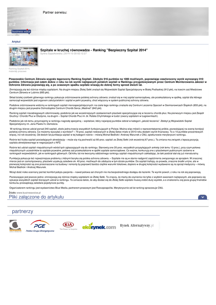 Partner serwisu: Artykuł Szpitale w kruchej równowadze - Ranking "Bezpieczny Szpital 2014" Sylwia Szparkowska | 2014-10-30 02:12:27 Ranking Szpitali 2014, materiały prasowe Pleszewskie Centrum Zdrowia wygrało tegoroczny Ranking Szpitali. Zdobyło 916 punktów na 1000 możliwych, poprawiając zeszłoroczny wynik wynoszący 910 punktów. Informacja jest zatem dobra: z roku na rok wyniki najlepszych polskich szpitali w Rankingu przygotowywanym przez Centrum Monitorowania Jakości w Ochronie Zdrowia poprawiają się, a po czasowym spadku szpitale wracają do dobrej formy sprzed dwóch lat. Zmniejszają się też różnice między szpitalami. Na drugim miejscu Złotej Setki znalazł się Wojewódzki Szpital Specjalistyczny w Białej Podlaskiej (912 pkt), na trzecim zaś Miedziowe Centrum Zdrowia w Lubinie (895 pkt). Skład ścisłej czołówki głównego rankingu pokazuje zróżnicowanie polskiej ochrony zdrowia: znalazł się w niej szpital samorządowy, ale przekształcony w spółkę, szpital dla którego samorząd wojewódzki jest organem założycielskim i szpital w pełni prywatny, choć włączony w system publicznej ochrony zdrowia. Podobne zróżnicowanie widzimy w rankingach szpitali monospecjalistycznych: na czele tego rankingu znalazło się Centrum Leczenia Oparzeń w Siemianowicach Śląskich (855 pkt), na drugim miejscu jest prywatne Dolnośląskie Centrum Chorób Serca „Medinet” (842 pkt). Ranking szpitali niezabiegowych zdominowały, podobnie jak we wcześniejszych zestawieniach placówki specjalizujące się w leczeniu chorób płuc. Na pierwszym miejscu jest Zespół Gruźlicy i Chorób Płuc w Olsztynie, na drugim – Szpital Chorób Płuc im. bł. Rafała Chylińskiego w Łodzi (zwany szpitalem w Łagiewnikach). Podobnie jak rok temu, przyznajemy w rankingu nagrodę specjalną – szpitalowi, który najwięcej punktów zebrał w kategorii „jakość leczenia”. Zdobył ją Wojewódzki Szpital Specjalistyczny im. Jana Pawła II z Zamościa. W rankingu bierze udział ponad 240 szpitali, około jedna trzecia wszystkich funkcjonujących w Polsce. Można więc mówić o reprezentatywnej próbie, pozwalającej na ocenę kondycji polskiej ochrony zdrowia. Co możemy wyczytać z wyników? – 70 proc. szpitali notowanych w Złotej Setce miało w 2013 roku dodatni wynik finansowy. To o 10 punktów procentowych więcej, niż rok wcześniej. Od dwóch lat punktacja szpitali w tej kategorii rośnie – mówią Michał Bedlicki i Andrzej Warunek z CMJ, opiekunowie merytoryczni rankingu. Rośnie też liczba szpitali posiadających akredytację – może się nią pochwalić aż 80 proc. szpitali ze Złotej Setki (rok wcześniej 67 proc.). Ta zmiana ma związek z lepszą pozycją szpitala akredytowanego w negocjacjach z NFZ. Rośnie też udział szpitali niepublicznych wśród tych zgłaszających się do rankingu. Stanowią one 20 proc. wszystkich przysyłających ankiety (rok temu 13 proc.), przy czym połowa niepublicznych uczestników to szpitale prywatne, połowa zaś przekształcone w spółki szpitale samorządowe. Co ważne, konkurują one z placówkami publicznymi zarówno w rankingach wojewódzkich, jak w rankingach głównych. Od kilku lat nie tworzymy oddzielnego rankingu szpitali niepublicznych zakładając, że taki podział stał się już nienaturalny. Punktacja pokazuje też najważniejsze problemy z którymi boryka się polska ochrona zdrowia. – Szpitale nie są w stanie nadgonić zapóźnienia związanego ze sprzętem. W znacznej mierze jest on zamortyzowany, placówki uzyskują zaledwie ok. 40 proc. możliwych do zdobycia w tym dziale punktów. Do szpitali trafiają, co prawda, znaczne środki unijne, ale w pierwszej kolejności są one przeznaczane na budowy i remonty by poprawić bardzo ciężkie warunki lokalowe, dopiero w drugiej kolejności wydawane są na sprzęt medyczny – mówią Michał Bedlicki i Andrzej Warunek. Wciąż dość nisko oceniany jest też komfort pobytu pacjenta – nawet połowa sal chorych nie ma bezpośredniego dostępu do łazienki. Te wyniki powoli, z roku na rok się poprawiają. Pocieszające jest jeszcze jedno: zmniejszają się różnice między szpitalami ze Złotej Setki. To znaczy, że mamy do czynienia nie tylko z szybkim awansem najlepszych, ale poprawia się sytuacja wszystkich szpitali biorących udział w rankingu. To oznacza także, że aby dostać się do Złotej Setki szpitale muszą zrobić duży wysiłek, a o znalezieniu się poza grupą finalistów konkursu przesądzają zaledwie pojedyncze punkty. Organizatorem rankingu jest wydawnictwo Blue Media, partnerem prasowym jest Rzeczpospolita. Merytorycznie od lat ranking opracowuje CMJ. Źródło: www.businessvoice.pl Pliki załączone do artykułu partnerzy