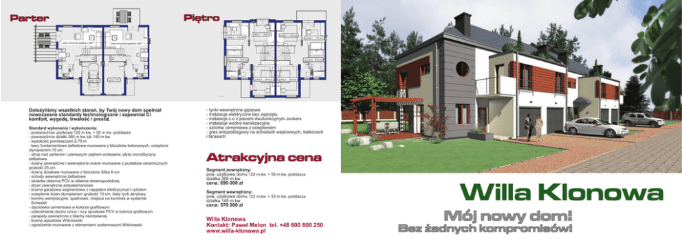 Piętro Parter pokój 1 - 12m.kw pokój 2 - 12m.kw salon+kuchnia+jadalnia 38m2 pokój 1 - 12m.kw pokój 2 - 12m.kw salon+kuchnia+jadalnia 38m2 łazienka - 8,5m.kw garaż 16m 2 garaż 16m 2 Dołożyliśmy wszelkich starań, by Twój nowy dom spełniał nowoczesne standardy technologiczne i zapewniał Ci komfort, wygodę, trwałość i prestiż. Standard wykonania i wykończenia: - powierzchnia użytkowa 122 m.kw. + 55 m kw. poddasza - powierzchnia działki 360 m kw lub 140 m kw - wysokość pomieszczeń 2,70 m - ławy fundamentowe żelbetowe murowane z bloczków betonowych, ocieplone styropianem 10 cm - strop nad parterem i pierwszym piętrem wylewane; płyta monolityczna żelbetowa - ściany zewnętrzne i wewnętrzne nośne murowane z pustaków ceramicznych grubość 25 cm - ściany działowe murowane z bloczków Silka 8 cm - schody wewnętrzne żelbetowe - stolarka okienna PCV w okleinie drewnopodobnej - drzwi zewnętrzne antywłamaniowe - brama garażowa segmentowa z napędem elektrycznym i pilotem - ocieplenie ścian styropianem grubość 15 cm, biały tynk akrylowy - kominy wentylacyjne, spalinowe, miejsce na kominek w systemie Schiedel - dachówka cementowa w kolorze grafitowym - odwodnienie dachu rynny i rury spustowe PCV w kolorze grafitowym - parapety zewnętrzne z blachy nierdzewnej - brama wjazdowa Wiśniowski - ogrodzenie murowane z elementami systemowymi Wiśniowski łazienka - 8,5m.kw pokój 3 - 16m.kw pokój 3 - 16m.kw - tynki wewnętrzne gipsowe - instalacje elektryczne bez osprzętu - instalacje c.o z piecem dwufunkcyjnym Junkers - instalacje wodno-kanalizacyjne - szlichta cementowa z ociepleniem - gres antypoślizgowy na schodach wejściowych, balkonach i tarasach Atrakcyjna cena Segment zewnętrzny: pow. użytkowa domu 122 m.kw. + 55 m kw. poddasza działka 360 m kw. cena: 690 000 zł Segment wewnętrzny: pow. użytkowa domu 122 m.kw. + 55 m kw. poddasza działka 140 m kw. cena: 570 000 zł Willa Klonowa Kontakt: Paweł Melon tel. +48 600 800 250 www.willa-klonowa.pl Willa Klonowa Mój nowy dom! Bez żadnych kompromisów! ul.Warszawska Górczewska Powst.Śląskich Stare Babice Lazurowa Willa Klonowa to budynek szeregowy zlokalizowany w Koczargach Starych, przy zachodniej granicy Warszawy, w otulinie Kampinoskiego Parku Narodowego. Najbliższe sąsiedztwo to wyłącznie niska zabudowa jednorodzinna. Położenie w pobliżu szkół, przedszkoli i sklepów oraz komunikacji miejskiej ułatwia codzienne życie. Architekturę domów wyróżnia nowoczesna forma oraz wysoki standard wykonania. Funkcjonalny rozkład pomieszczeń oraz dbałość o szczegóły architektoniczne sprawiają, że czuje się komfort i wygodę mieszkania w wysokiej jakości domach. Akacjowa Willa Klonowa Tylko 9km do skrzyżowania: Górczewska / Lazurowa Klonowa Mój nowy dom Komfort życia • indywidualny projekt • wysoki standard wykonania • dbałość o szczegóły • ergonomiczne i komfortowe dla Twojej rodziny zagospodarowanie powierzchni Willa Klonowa to nie tylko piękna i funkcjonalna architekura! Liczy się Twoje wygodne życie i możliwości rozwoju dla Ciebie i Twojej rodziny. Ciesz się życiem u boku czystej natury i jednoczesną bliskością wielkiego miasta. • powierzchnia użytkowa domu - 122 m kw. + 55 m kw. poddasze • powierzchnia działki - 360 m kw. lub 140 m kw. • szkoła podstawowa i gimnazjum – 500 m • Kampinoski Park Narodowy – 500 m • centrum handlowe Tesco - 9 km • centrum handlowe Wola Park - 10 km. • nowobudowana trasa S8 - 7,5 km. • przystanek autobusowy – 500 m • stacja metra Młociny - 13 km.