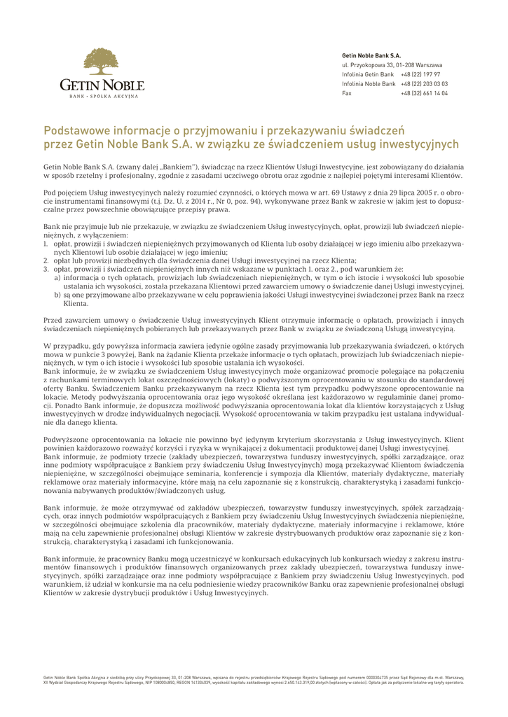 Getin Noble Bank S.A. ul. Przyokopowa 33, 01-208 Warszawa Infolinia Getin Bank +48 (22) 197 97 Infolinia Noble Bank +48 (22) 203 03 03 Fax +48 (32) 661 14 04 Podstawowe informacje o przyjmowaniu i przekazywaniu świadczeń przez Getin Noble Bank S.A. w związku ze świadczeniem usług inwestycyjnych Getin Noble Bank S.A. (zwany dalej „Bankiem”), świadcząc na rzecz Klientów Usługi Inwestycyjne, jest zobowiązany do działania w sposób rzetelny i profesjonalny, zgodnie z zasadami uczciwego obrotu oraz zgodnie z najlepiej pojętymi interesami Klientów. Pod pojęciem Usług inwestycyjnych należy rozumieć czynności, o których mowa w art. 69 Ustawy z dnia 29 lipca 2005 r. o obrocie instrumentami finansowymi (t.j. Dz. U. z 2014 r., Nr 0, poz. 94), wykonywane przez Bank w zakresie w jakim jest to dopuszczalne przez powszechnie obowiązujące przepisy prawa. Bank nie przyjmuje lub nie przekazuje, w związku ze świadczeniem Usług inwestycyjnych, opłat, prowizji lub świadczeń niepieniężnych, z wyłączeniem: 1. opłat, prowizji i świadczeń niepieniężnych przyjmowanych od Klienta lub osoby działającej w jego imieniu albo przekazywanych Klientowi lub osobie działającej w jego imieniu; 2. opłat lub prowizji niezbędnych dla świadczenia danej Usługi inwestycyjnej na rzecz Klienta; 3. opłat, prowizji i świadczeń niepieniężnych innych niż wskazane w punktach 1. oraz 2., pod warunkiem że: a) informacja o tych opłatach, prowizjach lub świadczeniach niepieniężnych, w tym o ich istocie i wysokości lub sposobie ustalania ich wysokości, została przekazana Klientowi przed zawarciem umowy o świadczenie danej Usługi inwestycyjnej, b)są one przyjmowane albo przekazywane w celu poprawienia jakości Usługi inwestycyjnej świadczonej przez Bank na rzecz Klienta. Przed zawarciem umowy o świadczenie Usług inwestycyjnych Klient otrzymuje informację o opłatach, prowizjach i innych świadczeniach niepieniężnych pobieranych lub przekazywanych przez Bank w związku ze świadczoną Usługą inwestycyjną. W przypadku, gdy powyższa informacja zawiera jedynie ogólne zasady przyjmowania lub przekazywania świadczeń, o których mowa w punkcie 3 powyżej, Bank na żądanie Klienta przekaże informacje o tych opłatach, prowizjach lub świadczeniach niepieniężnych, w tym o ich istocie i wysokości lub sposobie ustalania ich wysokości. Bank informuje, że w związku ze świadczeniem Usług inwestycyjnych może organizować promocje polegające na połączeniu z rachunkami terminowych lokat oszczędnościowych (lokaty) o podwyższonym oprocentowaniu w stosunku do standardowej oferty Banku. Świadczeniem Banku przekazywanym na rzecz Klienta jest tym przypadku podwyższone oprocentowanie na lokacie. Metody podwyższania oprocentowania oraz jego wysokość określana jest każdorazowo w regulaminie danej promocji. Ponadto Bank informuje, że dopuszcza możliwość podwyższania oprocentowania lokat dla klientów korzystających z Usług inwestycyjnych w drodze indywidualnych negocjacji. Wysokość oprocentowania w takim przypadku jest ustalana indywidualnie dla danego klienta. Podwyższone oprocentowania na lokacie nie powinno być jedynym kryterium skorzystania z Usług inwestycyjnych. Klient powinien każdorazowo rozważyć korzyści i ryzyka w wynikającej z dokumentacji produktowej danej Usługi inwestycyjnej. Bank informuje, że podmioty trzecie (zakłady ubezpieczeń, towarzystwa funduszy inwestycyjnych, spółki zarządzające, oraz inne podmioty współpracujące z Bankiem przy świadczeniu Usług Inwestycyjnych) mogą przekazywać Klientom świadczenia niepieniężne, w szczególności obejmujące seminaria, konferencje i sympozja dla Klientów, materiały dydaktyczne, materiały reklamowe oraz materiały informacyjne, które mają na celu zapoznanie się z konstrukcją, charakterystyką i zasadami funkcjonowania nabywanych produktów/świadczonych usług. Bank informuje, że może otrzymywać od zakładów ubezpieczeń, towarzystw funduszy inwestycyjnych, spółek zarządzających, oraz innych podmiotów współpracujących z Bankiem przy świadczeniu Usług Inwestycyjnych świadczenia niepieniężne, w szczególności obejmujące szkolenia dla pracowników, materiały dydaktyczne, materiały informacyjne i reklamowe, które mają na celu zapewnienie profesjonalnej obsługi Klientów w zakresie dystrybuowanych produktów oraz zapoznanie się z konstrukcją, charakterystyką i zasadami ich funkcjonowania. Bank informuje, że pracownicy Banku mogą uczestniczyć w konkursach edukacyjnych lub konkursach wiedzy z zakresu instrumentów finansowych i produktów finansowych organizowanych przez zakłady ubezpieczeń, towarzystwa funduszy inwestycyjnych, spółki zarządzające oraz inne podmioty współpracujące z Bankiem przy świadczeniu Usług Inwestycyjnych, pod warunkiem, iż udział w konkursie ma na celu podniesienie wiedzy pracowników Banku oraz zapewnienie profesjonalnej obsługi Klientów w zakresie dystrybucji produktów i Usług Inwestycyjnych. Getin Noble Bank Spółka Akcyjna z siedzibą przy ulicy Przyokopowej 33, 01-208 Warszawa, wpisana do rejestru przedsiębiorców Krajowego Rejestru Sądowego pod numerem 0000304735 przez Sąd Rejonowy dla m.st. Warszawy, XII Wydział Gospodarczy Krajowego Rejestru Sądowego, NIP 1080004850, REGON 141334039, wysokość kapitału zakładowego wynosi 2.650.143.319,00 złotych (wpłacony w całości). Opłata jak za połączenie lokalne wg taryfy operatora.