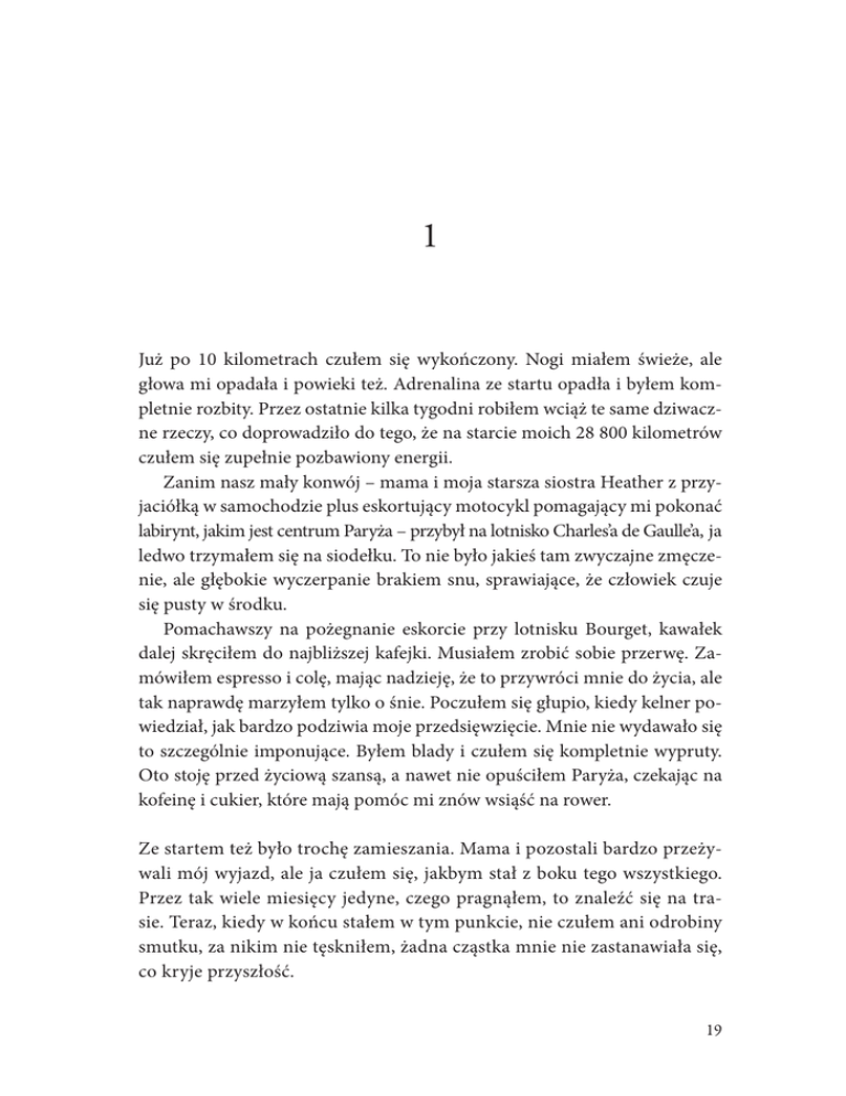 1 Już po 10 kilometrach czułem się wykończony. Nogi miałem świeże, ale głowa mi opadała i powieki też. Adrenalina ze startu opadła i byłem kompletnie rozbity. Przez ostatnie kilka tygodni robiłem wciąż te same dziwaczne rzeczy, co doprowadziło do tego, że na starcie moich 28 800 kilometrów czułem się zupełnie pozbawiony energii. Zanim nasz mały konwój – mama i moja starsza siostra Heather z przyjaciółką w samochodzie plus eskortujący motocykl pomagający mi pokonać labirynt, jakim jest centrum Paryża – przybył na lotnisko Charles’a de Gaulle’a, ja ledwo trzymałem się na siodełku. To nie było jakieś tam zwyczajne zmęczenie, ale głębokie wyczerpanie brakiem snu, sprawiające, że człowiek czuje się pusty w środku. Pomachawszy na pożegnanie eskorcie przy lotnisku Bourget, kawałek dalej skręciłem do najbliższej kafejki. Musiałem zrobić sobie przerwę. Zamówiłem espresso i colę, mając nadzieję, że to przywróci mnie do życia, ale tak naprawdę marzyłem tylko o śnie. Poczułem się głupio, kiedy kelner powiedział, jak bardzo podziwia moje przedsięwzięcie. Mnie nie wydawało się to szczególnie imponujące. Byłem blady i czułem się kompletnie wypruty. Oto stoję przed życiową szansą, a nawet nie opuściłem Paryża, czekając na kofeinę i cukier, które mają pomóc mi znów wsiąść na rower. Ze startem też było trochę zamieszania. Mama i pozostali bardzo przeżywali mój wyjazd, ale ja czułem się, jakbym stał z boku tego wszystkiego. Przez tak wiele miesięcy jedyne, czego pragnąłem, to znaleźć się na trasie. Teraz, kiedy w końcu stałem w tym punkcie, nie czułem ani odrobiny smutku, za nikim nie tęskniłem, żadna cząstka mnie nie zastanawiała się, co kryje przyszłość. 19 Mark Beaumont Ostatni dzień przed wyjazdem był gorący i pogodny, ale spędziłem go w pokoju numer 409 w hotelu Radisson Bolougne w Paryżu. Dopiero wieczorem wybraliśmy się z mamą i Heather do uroczej knajpki Au Vaillant Chez Chemin niedaleko Porte de Saint Cloud, aby uczcić początek przygody. Od mojego taty nie zawsze otrzymywałem bezwarunkowe wsparcie i nie zawsze się zgadzaliśmy, ale pomimo dzielących nas różnic byłem mu wdzięczny za zrozumienie dla zadania, które sobie wyznaczyłem. Cały dzień rozkładaliśmy różne rzeczy, wielokrotnie pakując je i sortując. Ku mojemu zdumieniu po żonglerce rozmaitymi przedmiotami pomiędzy czterema głównymi sakwami z zamiarem ich odpowiedniego zrównoważenia wszystko doskonale się spasowało. Moglibyśmy jeszcze długo gadać i krzątać się, ale o pierwszej w nocy nie byłem w stanie już nic robić. Rower był gotowy i spakowany, ale pozostałe prace administracyjne średnio nam szły. Za dużo pozostawało do zrobienia, żeby pozwolić sobie na ekscytację. Szybko się nauczyłem, że nieodłączną częścią „życia marzeniami” jest to, że rzeczywistość prawie zawsze różni się od tego, jak ją sobie wcześniej wyobrażałem. Oczekiwałem międzynarodowego szumu medialnego towarzyszącego mojemu wyjazdowi, a tymczasem nie zadzwonił ani jeden dziennikarz. Zainteresował się mną tylko John Beattie ze „Sports Weekly”, prowadzący audycję w Radio Scotland, który kilka miesięcy wcześniej gościł mnie u siebie w studiu i przeprowadził ze mną krótki wywiad. Przez ostatnie sześć miesięcy moją historię śledziło kilka lokalnych gazet, mimo to czułem się rozczarowany. Nie marzyłem o sławie, ale chciałem podzielić się moją przygodą z szerokim gronem odbiorców i odwdzięczyć sponsorom za wsparcie. Tego popołudnia pozwoliłem sobie na małe przedstawienie, kiedy Heather wróciła ze spóźnionym lunchem i przez pomyłkę podała mi quiche z szynką. Zazwyczaj staram się zachowywać dietę wegetariańską, a ta błaha pomyłka okazała się kroplą, która uwolniła napięcie, jakie w sobie tłumiłem. Kilka miesięcy później ze śmiechem wspominałem moją przesadzoną reakcję. Gdybym tylko wiedział, co wkrótce będę jadł, nawet nie zwróciłbym uwagi na wędlinę w placku. Heather spędziła większość popołudnia na dopieszczaniu prezentu, który zamierzała mi dać – uroczego „poradnika” z rysunkiem ludzika-cyklisty objeżdżającego świat. Broszura miała idealny kieszonkowy format, a wstęp 20 Człowiek, który objechał świat na rowerze głosił: „Oto książeczka z pożytecznymi informacjami z całego świata… Przyjemnego korzystania!”. Zawierała szczegółowe dane i podstawowe wyrażenia z każdego kraju, moje dane kontaktowe, informacje istotne w razie wypadku, listę sprzętu pierwszej pomocy i inne potrzebne wskazówki. Moim głównym zmartwieniem podczas tych ostatnich paru dni był brak czasu na staranne przekazanie mamie kierownictwa, żeby od teraz sama mogła koordynować działania „Bazy”. Zaledwie kilka miesięcy wcześniej nie umiała nawet wysłać maila, więc naszym głównym zmartwieniem było nie „co”, ale „jak”. Pozostawało mieć nadzieję, że to, co do tej pory zdążyliśmy zrobić, okaże się wystarczające, a pozostałych rzeczy mama będzie w stanie nauczyć się samodzielnie. O 7.00 w niedzielę 5 sierpnia 2007 roku ostatecznie zapiąłem sakwy, wymeldowałem się z Radisson Bolougne i wyruszyłem na nowym rowerze, pierwszy raz z pełnym bagażem. Poranne słońce odbijało się migotliwie od tafli Sekwany, gdy wolno jechałem na start z Porte de Saint Cloud. Rower wydawał się zrównoważony i niezawodny, ale okazał się cięższy, niż się spodziewałem. Całą drogę się uśmiechałem, nie spiesząc się i z roztargnieniem myśląc o tym, co przede mną. Cieszyłem się jednym z pierwszych od wielu tygodni momentów swobodnych, niczym nieskrępowanych rozmyślań. Na ulicach panował niedzielny spokój (na ile to możliwe w centrum Paryża). Obserwowałem ludzi leniwie sączących weekendową kawę i mijające mnie skutery. „To jest ten dzień” 