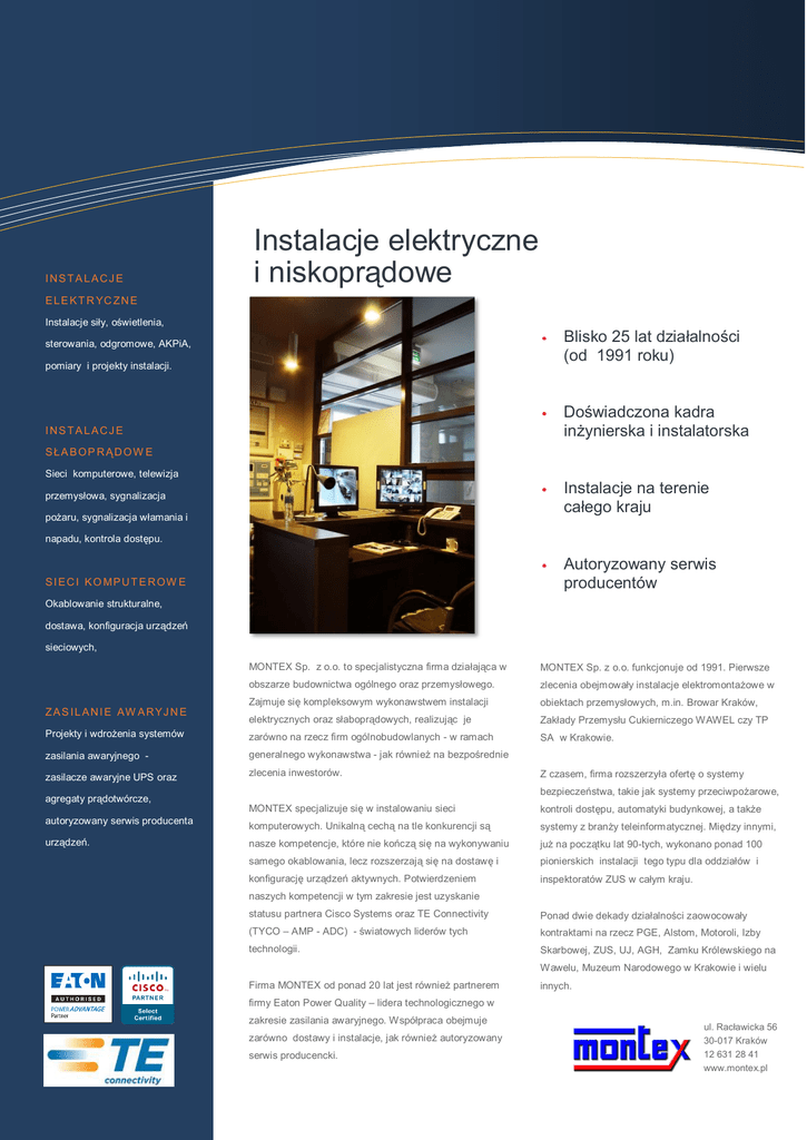 INSTALACJE Instalacje elektryczne i niskopr dowe E L E K T R YC Z N E Instalacje si y, o wietlenia, Blisko 25 lat dzia alno ci (od 1991 roku) sterowania, odgromowe, AKPiA, pomiary i projekty instalacji. Do wiadczona kadra in ynierska i instalatorska INSTALACJE ABOP R DOW E Sieci komputerowe, telewizja Instalacje na terenie ca ego kraju przemys owa, sygnalizacja po aru, sygnalizacja w amania i napadu, kontrola dost pu. Autoryzowany serwis producentów SIEC I KO MPUT E ROW E Okablowanie strukturalne, dostawa, konfiguracja urz dze sieciowych, MONTEX Sp. z o.o. to specjalistyczna firma dzia aj ca w Z A S I L A N I E AW A R YJ N E Projekty i wdro enia systemów obszarze budownictwa ogólnego oraz przemys owego. zlecenia obejmowa y instalacje elektromonta owe w Zajmuje si kompleksowym wykonawstwem instalacji obiektach przemys owych, m.in. Browar Kraków, elektrycznych oraz s abopr dowych, realizuj c je Zak ady Przemys u Cukierniczego WAWEL czy TP zarówno na rzecz firm ogólnobudowlanych - w ramach SA w Krakowie. zasilania awaryjnego - generalnego wykonawstwa - jak równie na bezpo rednie zasilacze awaryjne UPS oraz zlecenia inwestorów. urz dze . Z czasem, firma rozszerzy a ofert o systemy bezpiecze stwa, takie jak systemy przeciwpo arowe, agregaty pr dotwórcze, autoryzowany serwis producenta MONTEX Sp. z o.o. funkcjonuje od 1991. Pierwsze MONTEX specjalizuje si w instalowaniu sieci kontroli dost pu, automatyki budynkowej, a tak e komputerowych. Unikaln cech na tle konkurencji s systemy z bran y teleinformatycznej. Mi dzy innymi, nasze kompetencje, które nie ko cz si na wykonywaniu ju na pocz tku lat 90-tych, wykonano ponad 100 samego okablowania, lecz rozszerzaj si na dostaw i pionierskich instalacji tego typu dla oddzia ów i konfiguracj urz dze aktywnych. Potwierdzeniem inspektoratów ZUS w ca ym kraju. naszych kompetencji w tym zakresie jest uzyskanie statusu partnera Cisco Systems oraz TE Connectivity Ponad dwie dekady dzia alno ci zaowocowa y (TYCO – AMP - ADC) - wiatowych liderów tych kontraktami na rzecz PGE, Alstom, Motoroli, Izby technologii. Skarbowej, ZUS, UJ, AGH, Zamku Królewskiego na Wawelu, Muzeum Narodowego w Krakowie i wielu Firma MONTEX od ponad 20 lat jest równie partnerem innych. firmy Eaton Power Quality – lidera technologicznego w zakresie zasilania awaryjnego. Wspó praca obejmuje zarówno dostawy i instalacje, jak równie autoryzowany serwis producencki. ul. Rac awicka 56 30-017 Kraków 12 631 28 41 www.montex.pl Wybrani Klienci i U ytkownicy UCZE LN IE Uniwersytet Jagiello ski Uniwersytet Wroc awski SIED ZIBA Akademia Górniczo-Hutnicza 30-017 Kraków, Uniwersytet Ekonomiczny w Krakowie ul. Rac awicka 56 Pa stwowa Wy sza Szko Teatralna w Krakowie Uniwersytet Rolniczy w Krakowie Politechnika Krakowska Wy sza Szko a Zarz dzania i Bankowo ci w Krakowie KONTAKT Tel.: Akademia Wychowania Fizycznego w Krakowie +48 12 631 28 41 Faks: +48 12 631 28 43 PRZEMYS Elektrownia Be chatów Elektrownia Jaworzno III INTERNET www.montex.pl I N S T YT U C J E K U L T U R Y Elektrownia Konin Zamek Królewski na Wawelu Wawel SA Muzeum Narodowe w Krakowie Saint-Gobain Polska Muzeum Sztuki Wspó czesnej w Krakowie MAN Trucks Centrum Malta skie w Krakowie Motorola Tymbark SA DANE REJ EST ROW E Miejskie oczyszczalnie cieków – D browa Górnicza, KRS: 0000169614 NIP: 677-005-04-97 HANDEL I US UGI Cz stochowa, Bielsko Bia a Auchan REGON 350005414 KFC i Burger King (AmRest) Office Depot Makro C&C OBI BA ZDROW IA Szpital Uniwersytecki w Krakowie Szpital Miejski w Chrzanowie Szpital eromskiego w Krakowie Instytut Marii Sk odowskiej-Curie w Krakowie AD MIN ISTR ACJ A Zak ad Ubezpiecze Spo ecznych F I R M Y W YK O N A W C Z E Urz dy Skarbowe - Ma opolska Alstom Power Urz dy Miast – Ma opolska, Podkarpacie Qumak SA Urz d Marsza kowski Kraków SNEF Polska PZU w Opolu Budopol Kraków BPH SA Instal Kraków SA A U T O R Y Z A C J E Cisco Systems Select Partner Eaton Power Advantage Authorised Partner TE Connectivity ND&I Contractor KNX Partner (Konex EIB) ul. Rac awicka 56 30-017 Kraków 12 631 28 41 www.montex.pl