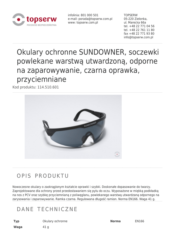 infolinia: 801 000 501 e-mail: [email protected] www: topserw.com.pl TOPSERW 05-220 Zielonka, ul. Marecka 66a tel. +48 22 771 04 56 tel. +48 22 761 11 80 fax +48 22 771 93 80 [email protected] Okulary ochronne SUNDOWNER, soczewki powlekane warstwą utwardzoną, odporne na zaparowywanie, czarna oprawka, przyciemniane Kod produktu: 114.510.601 OPIS PRODUKTU Nowoczesne okulary o zaokrąglonym kształcie oprawki i szybki. Doskonałe dopasowanie do twarzy. Zaprojektowane dla ochrony przed przedostawaniem się pyłu do oczu. Wyposażone w miękką podkładką na nos z PCV oraz szybkę przyciemnianą z poliwęglanu, powlekanego warstwą utwardzaną odpornego na zarysowania i zaparowywanie. Ramka czarna. Regulowana długość ramion. Norma EN166. Waga 41 g. DANE TECHNICZNE Typ Okulary ochronne Waga 41 g Norma EN166 CERTYFIKATY POWIĄZANE Produkt Typ Materiał Znak Kolor Okulary ochronne SUNDOWNER, soczewki powlekane warstwą utwardzoną, odporne na zaparowywanie, czarna oprawka, przezroczyste Okulary ochronne -- -- -- Okulary ochronne SUNDOWNER, soczewki powlekane warstwą utwardzoną, odporne na zaparowywanie, czarna oprawka, przyciemniane Okulary ochronne -- -- --