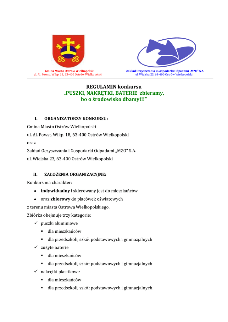 Gmina Miasto Ostrów Wielkopolski ul. Al. Powst.. Wlkp. 18, 63-400 Ostrów Wielkopolski Zakład Oczyszczania i Gospodarki Odpadami „MZO” S.A. ul. Wiejska 23, 63-400 Ostrów Wielkopolski REGULAMIN konkursu „PUSZKI, NAKRĘTKI, BATERIE zbieramy, bo o środowisko dbamy!!!” I. ORGANIZATORZY KONKURSU: Gmina Miasto Ostrów Wielkopolski ul. Al. Powst. Wlkp. 18, 63-400 Ostrów Wielkopolski oraz Zakład Oczyszczania i Gospodarki Odpadami „MZO” S.A. ul. Wiejska 23, 63-400 Ostrów Wielkopolski II. ZAŁOŻENIA ORGANIZACYJNE: Konkurs ma charakter: indywidualny i skierowany jest do mieszkańców oraz zbiorowy do placówek oświatowych z terenu miasta Ostrowa Wielkopolskiego. Zbiórka obejmuje trzy kategorie: puszki aluminiowe dla mieszkańców dla przedszkoli, szkół podstawowych i gimnazjalnych zużyte baterie dla mieszkańców dla przedszkoli, szkół podstawowych i gimnazjalnych nakrętki plastikowe dla mieszkańców dla przedszkoli, szkół podstawowych i gimnazjalnych. III. CELE KONKURSU: 1. Zbiórka odpadów segregowanych podlegających recyklingowi. 2. Edukacja i rozpowszechnianie świadomości ekologicznej wśród dzieci, młodzieży i mieszkańców miasta. 3. Wyrobienie nawyku segregacji odpadów w miejscu ich wytworzenia, czyli w gospodarstwach domowych. IV. WARUNKI I WYMAGANIA: 1. Konkurs polega na zbiórce odpadów w postaci puszek aluminiowych, zużytych baterii (z wyłączeniem akumulatorów)i nakrętek plastikowych. 2. Uczestnicy indywidualnego konkursu muszą być mieszkańcami miasta Ostrowa Wielkopolskiego. 3. Wszystkie placówki oświatowe biorące udział w konkursie muszą być z terenu miasta Ostrowa Wielkopolskiego. 4. Wszystkie zebrane i przekazane odpady pozostają własnością ZOiGO „MZO” S.A.. 5. Punkty za dostarczone zużyte baterie przez wszystkich uczestników konkursu indywidualnego i zbiorowego, zostaną dopisane placówkom oświatowym do ich kont założonych w Organizacji Odzysku REBA. V. TRYB ZGŁASZANIA I TERMIN KONKURSU: 1. Potwierdzenie uczestnictwa w konkursie dla placówek oświatowych należy przesłać do dnia 30 kwietnia 2010r. do siedziby organizatora konkursu – ZAŁACZNIK 1. KARTA ZGŁOSZENIA – odbiór odpadów po wcześniejszym uzgodnieniu z ZOiGO „MZO” S.A. 2. Potwierdzeniem uczestnictwa w konkursie indywidualnym będzie dostarczenie zebranych odpadów do Parku Miejskiego podczas Festynu Rodzinnego majOSTaszki, na stanowisko organizatora, w dniu 8 maja 2010r. do godziny 1630 oraz wypełnienie kuponu konkursowego: zbiórka puszek aluminiowych -1 kupon za 0,5 kg odpadu zbiórka nakrętek plastikowych -1 kupon za 0,5kg odpadu zbiórka zużytych baterii -1 kupon za 1,0 kg odpadu 3. Zgłoszenie uczestnictwa w konkursie jest równoznaczne z uznaniem warunków zawartych w niniejszym regulaminie. 4. Wyniki konkursu zostaną ogłoszone w dniu 8 maja 2010r. około godziny 1800 w Parku Miejskim podczas Festynu Rodzinnego majOSTaszki. VI. KOMISJA KONKURSOWA: 1. W sprawach spornych Komisja zajmuje stanowisko w drodze głosowania większością głosów, w składzie: Pani Beata Rybka – kierownik Biura Obsługi Klienta ZOiGO „MZO” S.A. Pani Ewa Kasperek – kierownik Referatu Ochrony Środowiska Urzędu Miejskiego Pani Agnieszka Fila – przedstawiciel Organizacji Odzysku REKOPOL S.A. 2. Komisja podejmuje decyzje o nagrodach i o prawidłowościach przebiegu konkursu. 3. Decyzje Komisji są ostateczne, nie przewiduje się od nich środków odwoławczych. VII. NAGRODY: 1. Organizator konkursu w kategorii uczestników zbiorowych przyzna nagrody za I, II i III miejsce w każdej kategorii, w zależności od ilości zebranych odpadów w przeliczeniu na jednego ucznia lub przedszkolaka. 2. Organizator konkursu indywidualnego przyzna 3 nagrody w każdej kategorii, które zostaną wylosowane ze wszystkich dostarczonych kuponów konkursowych. 3. Nagrody przyznawane zostaną zgodnie z niniejszym regulaminem. 4. Podział nagród zostanie dokonany przez Komisję Konkursową. 5. Fundatorami nagród są: Gmina Miasto Ostrów Wielkopolski, Zakład Oczyszczania i Gospodarki Odpadami „MZO” S.A. w Ostrowie Wielkopolskim. ZAŁACZNIK 1. KARTA ZGŁOSZENIA do konkursu „PUSZKI, NAKRĘTKI, BATERIE zbieramy, bo o środowisko dbamy!!!” Placówka oświatowa (nazwa i adres placówki oraz telefon kontaktowy) ................................................................................................................................................................ ................................................................................................................................................................ ................................................................................................................................................................ startuje w kategorii 1: zbiórka puszek aluminiowych zbiórka plastikowych nakrętek zbiórka zużytych baterii Imię i nazwisko nauczyciela/opiekuna odpowiedzialnego oraz nr telefonu kontaktowego .................................................................................................................................................................. ............................................................. (data i pieczęć placówki) 1 zaznacz krzyżykiem odpowiednią kategorię ............................................................. (podpis Dyrektor) Zgłoszenie prosimy przesłać na adres: Zakład Oczyszczania i Gospodarki Odpadami „MZO” S.A. ul. Wiejska 23, 63 – 400 Ostrów Wielkopolski