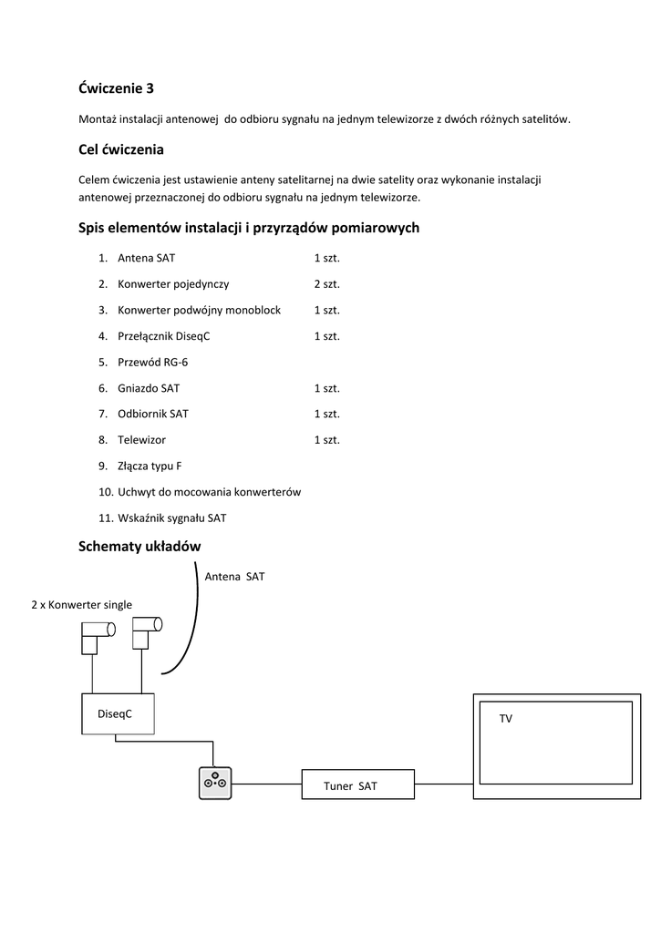 Ćwiczenie 3 Montaż instalacji antenowej do odbioru sygnału na jednym telewizorze z dwóch różnych satelitów. Cel ćwiczenia Celem ćwiczenia jest ustawienie anteny satelitarnej na dwie satelity oraz wykonanie instalacji antenowej przeznaczonej do odbioru sygnału na jednym telewizorze. Spis elementów instalacji i przyrządów pomiarowych 1. Antena SAT 1 szt. 2. Konwerter pojedynczy 2 szt. 3. Konwerter podwójny monoblock 1 szt. 4. Przełącznik DiseqC 1 szt. 5. Przewód RG-6 6. Gniazdo SAT 1 szt. 7. Odbiornik SAT 1 szt. 8. Telewizor 1 szt. 9. Złącza typu F 10. Uchwyt do mocowania konwerterów 11. Wskaźnik sygnału SAT Schematy układów Antena SAT 2 x Konwerter single DiseqC TV Tuner SAT Przebieg ćwiczenia 1. Dla danego satelity wyszukaj: kąt elewacji, azymut, skos konwertera 2. Zamontuj konwerter pojedynczy przez wskaźnik sygnału SAT podłącz go do odbiornika satelitarnego 3. Odbiornik satelitarny podłącz do telewizora 4. W menu odbiornika SAT wybierz tryb „ustawienie anteny” oraz wybierz pierwszego satelitę 5. Ustaw odpowiedni kąt elewacji i azymut anteny oraz skos konwertera 6. Przy pomocy wskaźnika sygnału SAT wyreguluj antenę na wybranego satelitę 7. Przy pomocy uchwytu uniwersalnego zamontuj drugi konwerter o podłącz go przez wskaźnik sygnału SAT do telewizora. 8. W menu odbiornika SAT wybierz drugiego satelitę 9. Przy pomocy wskaźnika sygnału SAT ustaw antenę na wybranego satelitę 10. Po ustawieniu anteny połącz konwertery z przełącznikiem DiSEqC 11. Zamontuj gniazdo SAT 12. Za pomocą pilota TV sprawdź odbiór sygnałów z różnych satelitów i wyreguluj jakość i moc sygnału na max 13. Nie wprowadzając zmian w ustawieniu anteny zamień konwertery single na konwerter monoblok 14. Za pomocą pilota TV sprawdź odbiór sygnałów z różnych satelitów i wyreguluj jakość i moc sygnału na max W sprawozdaniu odpowiedz na następujące pytania: 1. 2. 3. 4. Co to jest konwerter monoblok i do czego służy Do czego służy przełącznik DiseqC, podaj jego parametry Gdzie powinno się montować przełącznik DiseqC? Sygnał z jakich satelitów możemy odbierać w naszej miejscowości na jednej antenie równocześnie