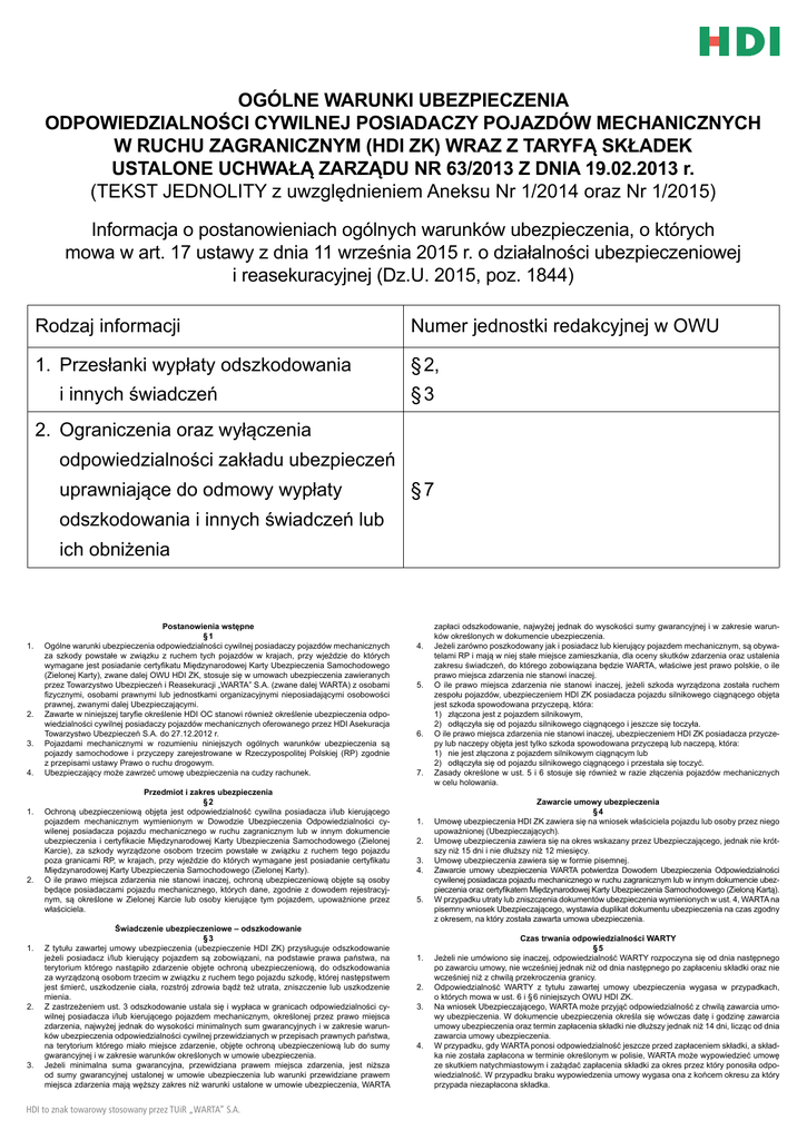 OGÓLNE WARUNKI UBEZPIECZENIA ODPOWIEDZIALNOŚCI CYWILNEJ POSIADACZY POJAZDÓW MECHANICZNYCH W RUCHU ZAGRANICZNYM (HDI ZK) WRAZ Z TARYFĄ SKŁADEK ustalone Uchwałą Zarządu Nr 63/2013 z dnia 19.02.2013 r. (TEKST JEDNOLITY z uwzględnieniem Aneksu Nr 1/2014 oraz Nr 1/2015) Informacja o postanowieniach ogólnych warunków ubezpieczenia, o których mowa w art. 17 ustawy z dnia 11 września 2015 r. o działalności ubezpieczeniowej i reasekuracyjnej (Dz.U. 2015, poz. 1844) Rodzaj informacji Numer jednostki redakcyjnej w OWU 1. Przesłanki wypłaty odszkodowania § 2, i innych świadczeń § 3 2. Ograniczenia oraz wyłączenia odpowiedzialności zakładu ubezpieczeń uprawniające do odmowy wypłaty § 7 odszkodowania i innych świadczeń lub ich obniżenia 1. 2. 3. 4. 1. 2. 1. 2. 3. Postanowienia wstępne § 1 Ogólne warunki ubezpieczenia odpowiedzialności cywilnej posiadaczy pojazdów mechanicznych za szkody powstałe w związku z ruchem tych pojazdów w krajach, przy wjeździe do których wymagane jest posiadanie certyfikatu Międzynarodowej Karty Ubezpieczenia Samochodowego (Zielonej Karty), zwane dalej OWU HDI ZK, stosuje się w umowach ubezpieczenia zawieranych przez Towarzystwo Ubezpieczeń i Reasekuracji „WARTA” S.A. (zwane dalej WARTA) z osobami fizycznymi, osobami prawnymi lub jednostkami organizacyjnymi nieposiadającymi osobowości prawnej, zwanymi dalej Ubezpieczającymi. Zawarte w niniejszej taryfie określenie HDI OC stanowi również określenie ubezpieczenia odpowiedzialności cywilnej posiadaczy pojazdów mechanicznych oferowanego przez HDI Asekuracja Towarzystwo Ubezpieczeń S.A. do 27.12.2012 r. Pojazdami mechanicznymi w rozumieniu niniejszych ogólnych warunków ubezpieczenia są pojazdy samochodowe i przyczepy zarejestrowane w Rzeczypospolitej Polskiej (RP) zgodnie z przepisami ustawy Prawo o ruchu drogowym. Ubezpieczający może zawrzeć umowę ubezpieczenia na cudzy rachunek. Przedmiot i zakres ubezpieczenia § 2 Ochroną ubezpieczeniową objęta jest odpowiedzialność cywilna posiadacza i/lub kierującego pojazdem mechanicznym wymienionym w Dowodzie Ubezpieczenia Odpowiedzialności cywilenej posiadacza pojazdu mechanicznego w ruchu zagranicznym lub w innym dokumencie ubezpieczenia i certyfikacie Międzynarodowej Karty Ubezpieczenia Samochodowego (Zielonej Karcie), za szkody wyrządzone osobom trzecim powstałe w związku z ruchem tego pojazdu poza granicami RP, w krajach, przy wjeździe do których wymagane jest posiadanie certyfikatu Międzynarodowej Karty Ubezpieczenia Samochodowego (Zielonej Karty). O ile prawo miejsca zdarzenia nie stanowi inaczej, ochroną ubezpieczeniową objęte są osoby będące posiadaczami pojazdu mechanicznego, których dane, zgodnie z dowodem rejestracyjnym, są określone w Zielonej Karcie lub osoby kierujące tym pojazdem, upoważnione przez właściciela. Świadczenie ubezpieczeniowe – odszkodowanie § 3 Z tytułu zawartej umowy ubezpieczenia (ubezpieczenie HDI ZK) przysługuje odszkodowanie jeżeli posiadacz i/lub kierujący pojazdem są zobowiązani, na podstawie prawa państwa, na terytorium którego nastąpiło zdarzenie objęte ochroną ubezpieczeniową, do odszkodowania za wyrządzoną osobom trzecim w związku z ruchem tego pojazdu szkodę, której następstwem jest śmierć, uszkodzenie ciała, rozstrój zdrowia bądź też utrata, zniszczenie lub uszkodzenie mienia. Z zastrzeżeniem ust. 3 odszkodowanie ustala się i wypłaca w granicach odpowiedzialności cywilnej posiadacza i/lub kierującego pojazdem mechanicznym, określonej przez prawo miejsca zdarzenia, najwyżej jednak do wysokości minimalnych sum gwarancyjnych i w zakresie warunków ubezpieczenia odpowiedzialności cywilnej przewidzianych w przepisach prawnych państwa, na terytorium którego miało miejsce zdarzenie, objęte ochroną ubezpieczeniową lub do sumy gwarancyjnej i w zakresie warunków określonych w umowie ubezpieczenia. Jeżeli minimalna suma gwarancyjna, przewidziana prawem miejsca zdarzenia, jest niższa od sumy gwarancyjnej ustalonej w umowie ubezpieczenia lub warunki przewidziane prawem miejsca zdarzenia mają węższy zakres niż warunki ustalone w umowie ubezpieczenia, WARTA HDI to znak towarowy stosowany przez TUiR „WARTA” S.A. 4. 5. 6. 7. 1. 2. 3. 4. 5. 1. 2. 3. 4. zapłaci odszkodowanie, najwyżej jednak do wysokości sumy gwarancyjnej i w zakresie warunków określonych w dokumencie ubezpieczenia. Jeżeli zarówno poszkodowany jak i posiadacz lub kierujący pojazdem mechanicznym, są obywatelami RP i mają w niej stałe miejsce zamieszkania, dla oceny skutków zdarzenia oraz ustalenia zakresu świadczeń, do którego zobowiązana będzie WARTA, właściwe jest prawo polskie, o ile prawo miejsca zdarzenia nie stanowi inaczej. O ile prawo miejsca zdarzenia nie stanowi inaczej, jeżeli szkoda wyrządzona została ruchem zespołu pojazdów, ubezpieczeniem HDI ZK posiadacza pojazdu silnikowego ciągnącego objęta jest szkoda spowodowana przyczepą, która: 1) złączona jest z pojazdem silnikowym, 2) odłączyła się od pojazdu silnikowego ciągnącego i jeszcze się toczyła. O ile prawo miejsca zdarzenia nie stanowi inaczej, ubezpieczeniem HDI ZK posiadacza przyczepy lub naczepy objęta jest tylko szkoda spowodowana przyczepą lub naczepą, która: 1) nie jest złączona z pojazdem silnikowym ciągnącym lub 2) odłączyła się od pojazdu silnikowego ciągnącego i przestała się toczyć. Zasady określone w ust. 5 i 6 stosuje się również w razie złączenia pojazdów mechanicznych w celu holowania. Zawarcie umowy ubezpieczenia § 4 Umowę ubezpieczenia HDI ZK zawiera się na wniosek właściciela pojazdu lub osoby przez niego upoważnionej (Ubezpieczających). Umowę ubezpieczenia zawiera się na okres wskazany przez Ubezpieczającego, jednak nie krótszy niż 15 dni i nie dłuższy niż 12 miesięcy. Umowę ubezpieczenia zawiera się w formie pisemnej. Zawarcie umowy ubezpieczenia WARTA potwierdza Dowodem Ubezpieczenia Odp