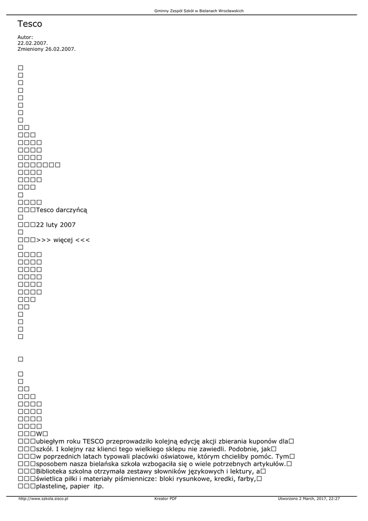 Gminny Zespół Szkół w Bielanach Wrocławskich Tesco Autor: 22.02.2007. Zmieniony 26.02.2007. Tesco darczyńcą 22 luty 2007 >>> więcej <<< W ubiegłym roku TESCO przeprowadziło kolejną edycję akcji zbierania kuponów dla szkół. I kolejny raz klienci tego wielkiego sklepu nie zawiedli. Podobnie, jak w poprzednich latach typowali placówki oświatowe, którym chcieliby pomóc. Tym sposobem nasza bielańska szkoła wzbogaciła się o wiele potrzebnych artykułów. Biblioteka szkolna otrzymała zestawy słowników językowych i lektury, a świetlica piłki i materiały piśmiennicze: bloki rysunkowe, kredki, farby, plastelinę, papier itp. http://www.szkola.sisco.pl Kreator PDF Utworzono 2 March, 2017, 22:27 Gminny Zespół Szkół w Bielanach Wrocławskich W tym miejscu Dyrekcja szkoły, Nauczyciele, Uczniowie i ich Rodzice pragną podziękować osobom zarządzającym sklepem TESCO za wspaniałą akcję i dary, a wszystkim kupującym za wczucie się w potrzeby placówek oświatowych i wspomaganie ich uczestnictwem w takich imprezach. http://www.szkola.sisco.pl Kreator PDF Utworzono 2 March, 2017, 22:27