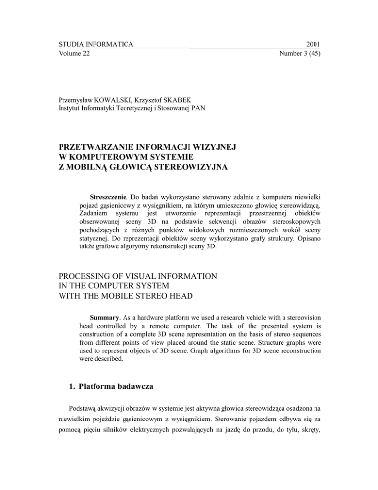 STUDIA INFORMATICA Volume 22 2001 Number 3 (45) Przemysław KOWALSKI, Krzysztof SKABEK Instytut Informatyki Teoretycznej i Stosowanej PAN PRZETWARZANIE INFORMACJI WIZYJNEJ W KOMPUTEROWYM SYSTEMIE Z MOBILNĄ GŁOWICĄ STEREOWIZYJNA Streszczenie. Do badań wykorzystano sterowany zdalnie z komputera niewielki pojazd gąsienicowy z wysięgnikiem, na którym umieszczono głowicę stereowidzącą. Zadaniem systemu jest utworzenie reprezentacji przestrzennej obiektów obserwowanej sceny 3D na podstawie sekwencji obrazów stereoskopowych pochodzących z różnych punktów widokowych rozmieszczonych wokół sceny statycznej. Do reprezentacji obiektów sceny wykorzystano grafy struktury. Opisano także grafowe algorytmy rekonstrukcji sceny 3D. PROCESSING OF VISUAL INFORMATION IN THE COMPUTER SYSTEM WITH THE MOBILE STEREO HEAD Summary. As a hardware platform we used a research vehicle with a stereovision head controlled by a remote computer. The task of the presented system is construction of a complete 3D scene representation on the basis of stereo sequences from different points of view placed around the static scene. Structure graphs were used to represent objects of 3D scene. Graph algorithms for 3D scene reconstruction were described. 1. Platforma badawcza Podstawą akwizycji obrazów w systemie jest aktywna głowica stereowidząca osadzona na niewielkim pojeździe gąsienicowym z wysięgnikiem. Sterowanie pojazdem odbywa się za pomocą pięciu silników elektrycznych pozwalających na jazdę do przodu, do tyłu, skręty, 2 P. Kowalski, K. Skabek podnoszenie i opuszczanie wysięgnika z głowicą stereowidzącą a także obrót oraz podnoszenie i opuszczanie głowicy. Przyjęto model, w którym dana jest scena statyczna (nieruchome obiekty, stacjonarne oświetlenie itp.), natomiast kamery mają możliwość obrotu wokół określonego punktu centralnego sceny. Rys. 1. Schemat systemu aktywnego stereowidzenia Fig. 1. Scheme of the active stereovision system 2. Przesyłanie informacji wizyjnej w systemie Aktywna głowica stereowidząca jest połączona z komputerem (stacją roboczą Sun) za pośrednictwem dwóch łączy bezprzewodowych. Pierwsze z nich służy do transmisji obrazów, a drugie do transmisji poleceń sterujących [1, 2]. Mimo posiadania przez głowicę dwóch kamer, nie istnieje możliwość równoczesnej transmisji obrazów z obu kamer. Wynika to z faktu wykorzystania pojedynczego łącza do transmisji obrazów. Zastosowany zestaw “Wireless Cop”, składający się z odbiornika i nadajnika sygnałów audio-video, jest w zasadzie przeznaczony dla zastosowań telewizji przemysłowej, w których może pracować z wykorzystaniem wielu różnych kanałów. Kanały w odbiorniku są jednak przełączane ręcznie, co uniemożliwia ich programowe przełączanie; podobnie wyboru kanału w nadajniku, dokonuje się zwierając odpowiednie zworki. Odbiornik dysponuje pojedynczymi wyjściami dla sygnału video i audio. Przetwarzanie informacji wizyjnej w komputerowm systemie ... 3 Karta akwizycji obrazu – Sun Video Ultra Plus, dysponuje dwoma wejściami sygnału video. Zaleta ta nie może być jednak wykorzystana, z uwagi na wykorzystanie pojedynczego zestawu “Wireless Cop”, z jednym kanałem wybranym przed rozpoczęciem pracy systemu. Karta akwizycji może pracować z obrazami w formatach NTSC (640x480) i PAL (768x576). W ramach projektu zastosowano dwie czarno-białe kamery CCD i system PAL. Polecenie akwizycji obrazów wbudowano w procedurę sterowania aktywną głowicą stereowidzącą – może zostać wywołane jako jedno z poleceń języka skryptowego. W procesie akwizycji obrazów wykorzystuje się funkcje należące do biblioteki XIL. Kamery są przełączane zdalnie przy wykorzystaniu łącza bezprzewodowego dla poleceń sterujących. Rozwiązanie takie uniemożliwia pracę w czasie rzeczywistym, ze względu na opóźnienia w przełączaniu kamer, mające wpływ na czas akwizycji. 3. Sterowanie platformą wizyjną Kanał sterowania został zaprojektowany w oparciu o standard RS 232c. Aby umożliwić autonomiczną pracę głowicy do transmisji wykorzystano dwa radimodemy, pracujące na częstotliwości 433,92 MHz. Wykorzystano tryb transmisji 8 bitowej, z bitem parzystości i jednym bitem stopu; o prędkości 1200 bitów na sekundę. Kanał sterowania pracuje w trybie half-duplex – wynika to z wykorzystania protokołu BNET (opracowanego w firmie SCS), dla transmisji poleceń. Lista poleceń sterujących aktywną głowicą stereowizyjną obejmuje: • Ruch pojazdu (Forward, Backward, Left, Right, ArmUp, ArmDown, HeadUp, HeadDown, HeadLeft, HeadRight); • Włączanie i wyłączanie kamer, akwizycję obrazu (GetImage, GetStereo, GetLeft, GetRight). Pełniejszy opis języka skryptowego, wykorzystywanego jako interfejs dla wydawania poleceń aktywnej głowicy stereowizyjnej; a odpowiadający dostępnym poleceniom dla sterowania głowicą, zawarto w [1, 2]. Polecenia przesyłane są do sterownika aktywnej głowicy stereowidzącej w postaci serii wpisów do rejestrów. Przykładowo akwizycja pary stereoobrazów przebiega w kilku etapach: 1. Włączenie kamery numer 2 (lewej). 2. Włączenie kamery, wymaga zapisania w rejestrze sterownika kilku kolejnych wartości: • wstawienie do rejestru sterownika numer dwa, numeru kamery (przesyłana ramka SetExt[3]); 4 P. Kowalski, K. Skabek • wstawienia do rejestru sterownika numer jeden wartości ‘5’ (odpowiada poleceniu “włącz kamerę”); • wstawienie do rejestru sterownika numer zero, wartości ‘5’ (odpowiada zgłoszeniu poprawności połączenia); • uruchomienie programu sterownika (przesyłana ramka BasRun); • wysłanie do rejestru sterownika numer trzy wartości ‘-1’ (odpowiada ustawieniu flagi gotowości, czyli wywołaniu uruchomienia procedury). 3. Akwizycja obrazu; 4. Włączenie kamery numer 1 (prawej) 5. Akwizycja obrazu 6. Wyłączenie kamery numer 1 (prawej). Wyłączenie przebiega podobnie do włączen