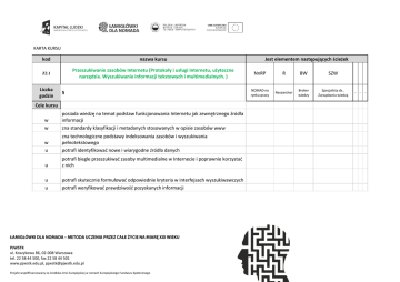 KARTA KURSU kod nazwa kursu Z2.1 Przeszukiwanie zasobów Internetu (Protokoły i usługi Internetu, użyteczne narzędzia. Wyszukiwanie informacji tekstowych i multimedialnych. ) Liczba godzin 5 Cele kursu w w posiada wiedzę na temat podstaw funkcjonowania Internetu jak zewnętrznego źródła informacji zna standardy klasyfikacji i metadanych stosowanych w opisie zasobów www w u zna technologiczne podstawy indeksowania zasobów i wyszukiwania pełnotekstowego potrafi identyfikować nowe i wiarygodne źródła danych u potrafi biegle przeszukiwać zasoby multimedialne w Internecie i poprawnie korzystać z nich u u potrafi skutecznie formułować odpowiednie kryteria w interfejsach wyszukiwawczych potrafi weryfikować prawdziwość pozyskanych informacji PJWSTK ul. Koszykowa 86, 02-008 Warszawa tel. 22 58 44 500, fax 22 58 44 501 www.pjwstk.edu.pl, [email protected] Projekt współfinansowany ze środków Unii Europejskiej w ramach Europejskiego Funduszu Społecznego . Jest elementem następujących ścieżek NnRP R BW SZW NOMAD na rynku pracy Researcher Broker wiedzy Specjalista ds.. Zarządzania wiedzą -- -- --