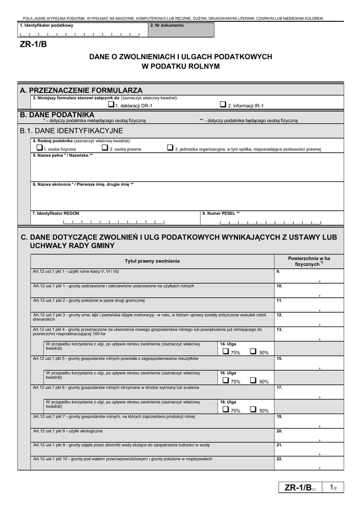 POLA JASNE WYPEŁNIA PODATNIK. WYPEŁNIAĆ NA MASZYNIE, KOMPUTEROWO LUB RĘCZNIE, DUŻYMI, DRUKOWANYMI LITERAMI, CZARNYM LUB NIEBIESKIM KOLOREM. 1. Identyfikator podatkowy 2. Nr dokumentu |____|____|____|____|____|____|____|____|____|____|____|____|____| ZR-1/B DANE O ZWOLNIENIACH I ULGACH PODATKOWYCH W PODATKU ROLNYM A. PRZEZNACZENIE FORMULARZA 3. Niniejszy formularz stanowi załącznik do (zaznaczyć właściwy kwadrat): 1. deklaracji DR-1 B. DANE PODATNIKA * - dotyczy podatnika niebędącego osobą fizyczną 2. informacji IR-1 ** - dotyczy podatnika będącego osobą fizyczną B.1. DANE IDENTYFIKACYJNE 4. Rodzaj podatnika (zaznaczyć właściwy kwadrat): 1. osoba fizyczna 5. Nazwa pełna * / Nazwisko ** 2. osoba prawna 3. jednostka organizacyjna, w tym spółka, nieposiadająca osobowości prawnej 6. Nazwa skrócona * / Pierwsze imię, drugie imię ** 7. Identyfikator REGON 8. Numer PESEL ** |____|____|____|____|____|____|____|____|____|____|____| |____|____|____|____|____|____|____|____|____|____|____| C. DANE DOTYCZĄCE ZWOLNIEŃ I ULG PODATKOWYCH WYNIKAJĄCYCH Z USTAWY LUB UCHWAŁY RADY GMINY Powierzchnia w ha 1) fizycznych Tytuł prawny zwolnienia Art.12 ust.1 pkt 1 - użytki rolne klasy V, VI i VIz 9. Art.12 ust.1 pkt 1 - grunty zadrzewione i zakrzewione ustanowione na użytkach rolnych 10. Art.12 ust.1 pkt 2 - grunty położone w pasie drogi granicznej 11. Art.12 ust.1 pkt 3 - grunty orne, łąki i pastwiska objęte melioracją - w roku, w którym uprawy zostały zniszczone wskutek robót drenarskich 12. Art.12 ust.1 pkt 4 - grunty przeznaczone na utworzenie nowego gospodarstwa rolnego lub powiększenie już istniejącego do powierzchni nieprzekraczającej 100 ha 13. , , , W przypadku korzystania z ulgi, po upływie okresu zwolnienia (zaznaczyć właściwy kwadrat) Art.12 ust.1 pkt 5 - grunty gospodarstw rolnych powstałe z zagospodarowania nieużytków , , 14. Ulga 75% 50% 15. , W przypadku korzystania z ulgi, po upływie okresu zwolnienia (zaznaczyć właściwy kwadrat) 16. Ulga 75% 50% Art.12 ust.1 pkt 6 - grunty gospodarstw rolnych otrzymane w drodze wymiany lub scalenia 17. , W przypadku korzystania z ulgi, po upływie okresu zwolnienia (zaznaczyć właściwy kwadrat) 18. Ulga 75% 50% Art.12 ust.1 pkt 7 - grunty gospodarstw rolnych, na których zaprzestano produkcji rolnej 19. Art.12 ust.1 pkt 8 - użytki ekologiczne 20. Art.12 ust.1 pkt 9 - grunty zajęte przez zbiorniki wody służące do zaopatrzenia ludności w wodę 21. Art.12 ust.1 pkt 10 - grunty pod wałami przeciwpowodziowymi i grunty położone w międzywałach 22. , , , , ZR-1/B (1) 1/2 POLA JASNE WYPEŁNIA PODATNIK. WYPEŁNIAĆ NA MASZYNIE, KOMPUTEROWO LUB RĘCZNIE, DUŻYMI, DRUKOWANYMI LITERAMI, CZARNYM LUB NIEBIESKIM KOLOREM. Art.12 ust.1 pkt 11 - grunty wpisane do rejestru zabytków 23. Art.12 ust.1 pkt 12 - grunty stanowiące działki przyzagrodowe członków rolniczych spółdzielni produkcyjnych 24. Art.12 ust.2 pkt 1 - uczelnie 25. Art.12 ust.2 pkt 2 - publiczne i niepubliczne jednostki organizacyjne objęte systemem oświaty oraz prowadzące je organy, w zakresie gruntów zajętych na działalność oświatową 26. Art.12 ust.2 pkt 3 - instytuty naukowe i pomocnicze jednostki naukowe Polskiej Akademii Nauk, w odniesieniu do gruntów, które są niezbędne do realizacji zadań, o których mowa w art. 2 ustawy z dnia 30 kwietnia 2010 r. o Polskiej Akademii Nauk (Dz. U. Nr 96, poz. 619) 27. , , , , , Art.12 ust.2 pkt 4 - prowadzący zakłady pracy chronionej spełniające warunek, o którym mowa w art. 28 ust. 1 pkt 1 lit. b ustawy 28. z dnia 27 sierpnia 1997 r. o rehabilitacji zawodowej i społecznej oraz zatrudnianiu osób niepełnosprawnych (Dz. U. z 2010 r. Nr 214, poz. 1407, Nr 217, poz. 1427 i Nr 226, poz. 1475), lub zakłady aktywności zawodowej - w zakresie gruntów zgłoszonych wojewodzie, jeżeli zgłoszenie zostało potwierdzone decyzją w sprawie przyznania statusu zakładu pracy chronionej lub zakładu aktywności zawodowej albo zaświadczeniem - zajętych na prowadzenie tego zakładu, z wyjątkiem gruntów znajdujących się w posiadaniu zależnym podmiotów niebędących prowadzącymi zakłady pracy chronionej spełniające warunek, o którym mowa w art. 28 ust. 1 pkt 1 lit. b ustawy z dnia 27 sierpnia 1997 r. o rehabilitacji zawodowej i społecznej oraz zatrudnianiu osób niepełnosprawnych lub zakłady aktywności zawodowej Art.12 ust.2 pkt 5 – instytuty badawcze 29. Art.12 ust.2 pkt 5a - przedsiębiorcy o statusie centrum badawczo-rozwojowego uzyskanym na zasadach określonych w przepisach o niektórych formach wspierania działalności innowacyjnej, w odniesieniu do przedmiotów opodatkowania zajętych na cele prowadzonych badań i prac rozwojowych 30. Art.12 ust.2 pkt 6 - Polski Związek Działkowców z tytułu użytkowania i użytkowania wieczystego gruntu rodzinnych ogrodów działkowych 31. Inne 32. , , , , , Inne 33. , D. DANE DOTYCZĄCE ULG PODATKOWYCH WYNIKAJĄCYCH Z USTAWY LUB UCHWAŁY RADY GMINY Tytuł prawny ulgi Art.13 ust.1 - ulga inwestycyjna 34. Art.13a ust.1 i 2 - ulga dla żołnierzy odbywających zasadniczą służbę wojskową lub długotrwałe przeszkolenie wojskowe, osób spełniających zastępczo obowiązek służby wojskowej w formie skoszarowanej i prowadzących te gospodarstwa bezpośrednio przed powołaniem do służby oraz członków rodzin tych osób (zaznaczyć właściwy kwadrat) 35. Ulga Art.13b ust.1 - ulga dla gruntów położonych na terenach podgórskich i górskich (zaznaczyć właściwy kwadrat) 36. Ulga Art.13c ust.1 - ulga z tytułu wystąpienia klęski żywiołowej 37. Inne 38. tak nie 60% 40% 60% 30% tak nie , Inne 39. , 1) Należy podać z dokładnością do czterech miejsc po przecinku. ZR-1/B (1) 2/2