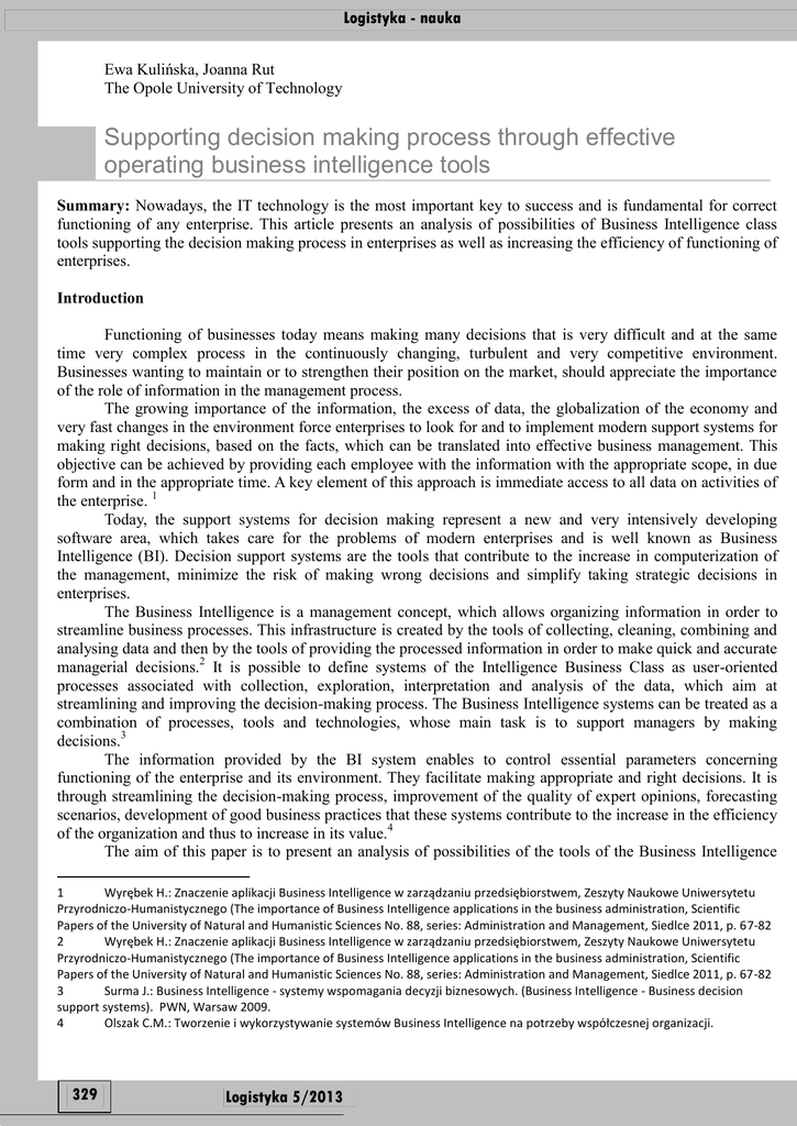 Logistyka - nauka Ewa Kulińska, Joanna Rut The Opole University of Technology Supporting decision making process through effective operating business intelligence tools Summary: Nowadays, the IT technology is the most important key to success and is fundamental for correct functioning of any enterprise. This article presents an analysis of possibilities of Business Intelligence class tools supporting the decision making process in enterprises as well as increasing the efficiency of functioning of enterprises. Introduction Functioning of businesses today means making many decisions that is very difficult and at the same time very complex process in the continuously changing, turbulent and very competitive environment. Businesses wanting to maintain or to strengthen their position on the market, should appreciate the importance of the role of information in the management process. The growing importance of the information, the excess of data, the globalization of the economy and very fast changes in the environment force enterprises to look for and to implement modern support systems for making right decisions, based on the facts, which can be translated into effective business management. This objective can be achieved by providing each employee with the information with the appropriate scope, in due form and in the appropriate time. A key element of this approach is immediate access to all data on activities of the enterprise. 1 Today, the support systems for decision making represent a new and very intensively developing software area, which takes care for the problems of modern enterprises and is well known as Business Intelligence (BI). Decision support systems are the tools that contribute to the increase in computerization of the management, minimize the risk of making wrong decisions and simplify taking strategic decisions in enterprises. The Business Intelligence is a management concept, which allows organizing information in order to streamline business processes. This infrastructure is created by the tools of collecting, cleaning, combining and analysing data and then by the tools of providing the processed information in order to make quick and accurate managerial decisions.2 It is possible to define systems of the Intelligence Business Class as user-oriented processes associated with collection, exploration, interpretation and analysis of the data, which aim at streamlining and improving the decision-making process. The Business Intelligence systems can be treated as a combination of processes, tools and technologies, whose main task is to support managers by making decisions.3 The information provided by the BI system enables to control essential parameters concerning functioning of the enterprise and its environment. They facilitate making appropriate and right decisions. It is through streamlining the decision-making process, improvement of the quality of expert opinions, forecasting scenarios, development of good business practices that these systems contribute to the increase in the efficiency of the organization and thus to increase in its value.4 The aim of this paper is to present an analysis of possibilities of the tools of the Business Intelligence 1 Wyrębek H.: Znaczenie aplikacji Business Intelligence w zarządzaniu przedsiębiorstwem, Zeszyty Naukowe Uniwersytetu Przyrodniczo-Humanistycznego (The importance of Business Intelligence applications in the business administration, Scientific Papers of the University of Natural and Humanistic Sciences No. 88, series: Administration and Management, Siedlce 2011, p. 67-82 2 Wyrębek H.: Znaczenie aplikacji Business Intelligence w zarządzaniu przedsiębiorstwem, Zeszyty Naukowe Uniwersytetu Przyrodniczo-Humanistycznego (The importance of Business Intelligence applications in the business administration, Scientific Papers of the University of Natural and Humanistic Sciences No. 88, series: Administration and Management, Siedlce 2011, p. 67-82 3 Surma J.: Business Intelligence - systemy wspomagania decyzji biznesowych. (Business Intelligence - Business decision support systems). PWN, Warsaw 2009. 4 Olszak C.M.: Tworzenie i wykorzystywanie systemów Business Intelligence na potrzeby współczesnej organizacji. 329 Logistyka 5/2013 Logistyka - nauka Class supporting making decisions in enterprises and presenting potential advantages resulting from the implementation of the systems increasing the efficiency of functioning of enterprises contributing to the possibility of obtaining competitive advantages at the same time. Business Intelligence – measurable value added of enterprises. Nowadays, it is the modern IT technology that is one of the most effective tools for companies to achieve satisfactory results. Thanks to it, it is possible to accelerate the flow of goods, to minimize costs, to save at every stage of distribution and to synchronize work at strategic positions. The modern technology contributes also to better transfer of the information used for better satisfying the needs of customers, for keeping better contact amongst suppliers and recipients and for increasing profits and business growth.5 It is making right decisions and taking appropriate actions by employees in due time that causes that the enterprise wins in the market and becomes more competitive. However, it should be noted that without an efficient tool for increasing planning and implementing actions in the enterprise, the decision- making is very difficult and sometimes it is even impossible. The tool enhancing possibilities of taking appropriate current and strategic decisions and simultaneously facilitating better understanding of the situations occurring is the Intelligence Business.6 The systems of the Intelligence Business Class create a broad category of applications and technologies intended for collecting, analysing and providing data. 7 Business Intelligence Applications include decision support systems among others such as DSS (Decision S