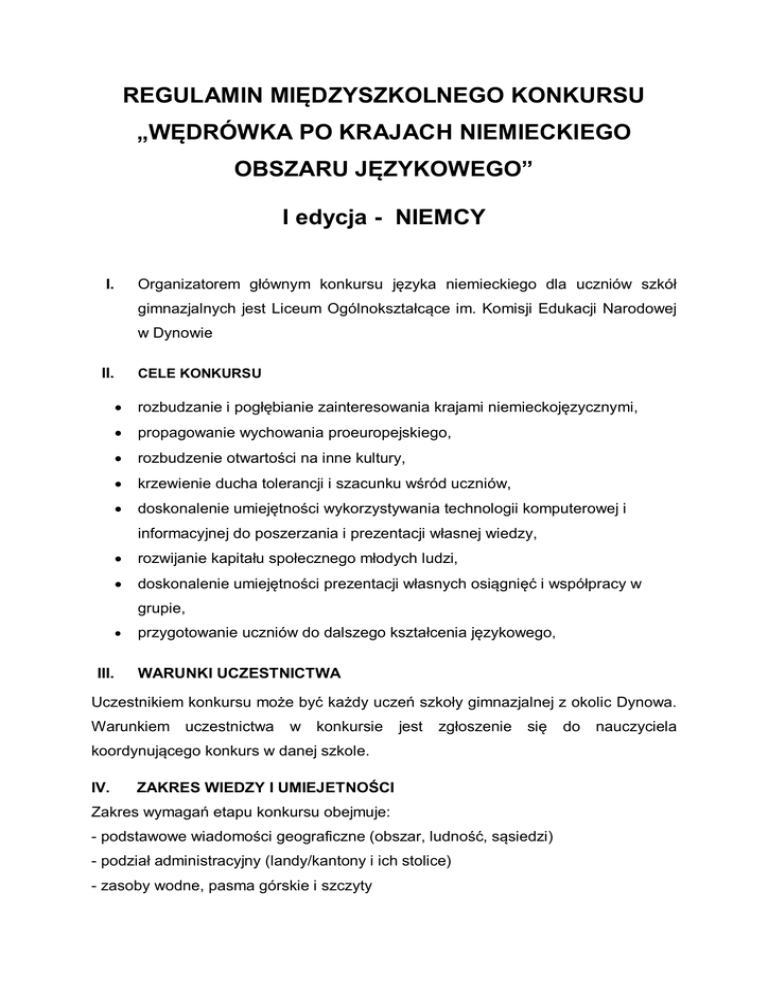 REGULAMIN MIĘDZYSZKOLNEGO KONKURSU „WĘDRÓWKA PO KRAJACH NIEMIECKIEGO OBSZARU JĘZYKOWEGO” I edycja - NIEMCY I. Organizatorem głównym konkursu języka niemieckiego dla uczniów szkół gimnazjalnych jest Liceum Ogólnokształcące im. Komisji Edukacji Narodowej w Dynowie II. CELE KONKURSU rozbudzanie i pogłębianie zainteresowania krajami niemieckojęzycznymi, propagowanie wychowania proeuropejskiego, rozbudzenie otwartości na inne kultury, krzewienie ducha tolerancji i szacunku wśród uczniów, doskonalenie umiejętności wykorzystywania technologii komputerowej i informacyjnej do poszerzania i prezentacji własnej wiedzy, rozwijanie kapitału społecznego młodych ludzi, doskonalenie umiejętności prezentacji własnych osiągnięć i współpracy w grupie, III. przygotowanie uczniów do dalszego kształcenia językowego, WARUNKI UCZESTNICTWA Uczestnikiem konkursu może być każdy uczeń szkoły gimnazjalnej z okolic Dynowa. Warunkiem uczestnictwa w konkursie jest zgłoszenie się koordynującego konkurs w danej szkole. IV. ZAKRES WIEDZY I UMIEJETNOŚCI Zakres wymagań etapu konkursu obejmuje: - podstawowe wiadomości geograficzne (obszar, ludność, sąsiedzi) - podział administracyjny (landy/kantony i ich stolice) - zasoby wodne, pasma górskie i szczyty do nauczyciela - największe miasta - najatrakcyjniejsze miejsca, zabytki - symbole narodowe - gospodarka (najsłynniejsze marki przemysłu) - środki transportu i lokomocji - media (najpopularniejsze tytuły prasy i stacje telewizyjne) - słynne postacie (polityka, kultura, sport, muzyka) - waluta - najważniejsze święta, tradycje i obrzędy - tradycyjne potrawy Testy konkursowe przygotowane będą przez nauczycieli języka niemieckiegoLiceum Ogólnokształcącego im. Komisji Edukacji Narodowej, czyli organizatora konkursu. V. ZASADY I PRZEBIEG KONKURSU Konkurs odbywa się w dwóch etapach: etap szkolny (eliminacje) oraz finał międzyszkolny. Etap I Eliminacje szkolne przeprowadzają poszczególne szkoły we własnym zakresie. Szkoły biorące udział w konkursie zobowiązane są do przeprowadzenia I etapu. Czas trwania eliminacji to 45 minut. Liczba uczestników etapu szkolnego jest nieograniczona. Nazwiska trzech najlepszych uczniów wraz z liczbą uzyskanych punktów należy przesłać na adres szkoły do dnia 10 lutego 2016r. Etap II Finał konkursu odbędzie się dnia 16 marca 2016 r. w Liceum Ogólnokształcącym w Dynowie o godz. 9.00. Czas trwania tej części konkursu to 45 minut. Etap finałowy będzie miał formę testu.Test zawiera pytania zamknięte oraz otwarte na temat geografii, najnowszej historii, kultury oraz realiów krajów niemieckiego obszaru językowego w języku polskim i niemieckim ( zróżnicowana liczba punktów). W roku 2016 pytania będą dotyczyły Niemiec. W finale bierze udział trzech najlepszych uczniów z każdej szkoły wyłonionych poprzez eliminacje szkolne.Jeśli zdarzy się, że finaliści będą mieli taką samą liczbę punktów, konieczne będzie przeprowadzenie dogrywki. Organizator będzie dysponował pulą dodatkowych pytań, które będzie zadawał na przemian uczniom do czasu, aż jeden z nich nie uzyska przewagi. W przypadku małej ilości zgłoszeń organizator zastrzega sobie prawo do zmian w tym punkcie regulaminu, o czym uczestnicy zostaną powiadomieni przed finałem konkursu. VI. NAGRODY Laureaci konkursu otrzymają nagrody rzeczowe oraz dyplomy. Każdy uczestnik etapu finałowego otrzyma dyplom uczestnictwa w konkursie. VII. JURY 1.Nad prawidłowością przebiegu etapu finałowego konkursu czuwać będzie jury w składzie wszystkich nauczycieli ze szkół biorących udział w konkursie oraz trzech nauczycieli wyznaczonych przez organizatora konkursu. 2. Wyniki konkursu zostaną ogłoszone po zakończeniu obrad jury. VIII. POSTANOWIENIA KOŃCOWE 1. Informacje na temat konkursu będą zamieszczone na stronie internetowej www.lodynow.pl. Wszelkich informacji dotyczących konkursu udzielać będą: p. Ewa Hadam, Beata Trzyna, Monika Rząsa. 2.Uczniowie biorący udział w I i II etapie konkursu zobowiązani są do punktualnego przybycia na miejsce oraz do okazania ważnej legitymacji szkolnej potwierdzającej ich tożsamość. 3.Nie przewiduje się dodatkowego postępowania konkursowego dla uczestników, którzy w wyznaczonym dniu i godzinie z przyczyn losowych nie przystąpią do konkursu. Ostateczne decyzje w sprawach spornych nie objętych regulaminem podejmuje przewodniczący właściwej komisji konkursowej. Protokół z etapu szkolnego Nazwa (numer) szkoły: Adres: Nazwisko i imię organizatora etapu szkolnego: Liczba uczestników etapu szkolnego: Nazwiska i imiona typowanych uczniów: