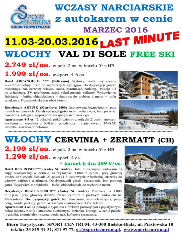 WCZASY NARCIARSKIE z autokarem w cenie MARZEC 2016 11.03-20.03.2016 WŁOCHY VAL DI SOLE FREE SKI 2.749 zł/os. w pok. 2 os. w hotelu 3* z HB 1.999 zł/os. w apart. 4-6 os. Hotel ARCANGELO *** (Pelizzano) Stylowy hotel usytuowany w centrum doliny, 3 km do najbliższych wyciągów. Do dyspozycji gości:: restauracja, bar, centrum relaksu, sauna, hyromasaż, parking. Pokoje 1-3 os. z łazienką, TV, telefonem, część pokoi posiada balkony. Wyżywienie: śniadanie – bufet, obiadokolacja 4 daniowa do wyboru z menu + bufet sałatkowy. Przystanek ski bus obok hotelu. Rezydencja ARTUIK (Marilleva 1400) Usytuowana bezpośrednio przy trasach narciarskich. Do dyspozycji gości m.in.; restauracja, bar, pizzeria, narciarnia, sala gier, wypożyczalnia sprzętu narciarskiego. Apartament 4-5 os. (2 pokoje): pokój dzienny z sofą dla 2 osób i aneksem kuchennym, sypialnia z łóżkiem pojedynczym i piętrowym, TV-SAT, łazienka, suszarka do włosów. *********************************************************************************************************************************** WŁOCHY CERVINIA + ZERMATT (CH) 2.199 zł/os. w pok. 2 os. w hotelu 3* z HB 1.299 zł/os. w apart. 4 os. + karnet 6 dni 289 €/os. Hotel DES ROSES*** (Antey St. Andre) Hotel z pięknymi widokami na Alpy, usytuowany w dolinie, na wysokości 1.080 m n.p.m., przy głównej drodze do Cervinii. Posiada 21 pokoi (1-3 osobowych) z łazienką, suszarką do włosów, sejfem i telefonem. Do dyspozycji gości: restauracja, bar, parking, garaż. Wyżywienie: śniadanie – bufet, obiadokolacja do wyboru z menu. Rezydencja BEAU SEJOUR** (Antey St. Andre) Położona na 1.000 m n.p.m., przy głównej drodze, blisko centrum z pięknym widokiem na Matternhorn. Do dyspozycji gości: bar, kawiarnia, sala telewizyjna, pingpong, winda, parking, garaż. W każdym apartamencie TV i telefon. Apartament 4 os. (2 pokoje): sypialnia z łóżkiem podwójnym i pojedynczym, pokój dzienny z sofą i aneksem kuchennym, łazienka. Uwaga: w cenie pościel i ręczniki, energia elektryczna, woda, gaz, końcowe sprzątanie. *********************************************************************************************************************************** Biuro Turystyczne SPORT CENTRUM, 43-300 Bielsko-Biała, ul. Piastowska 10 tel./fax 33 819 31 31, 811 97 77, [email protected], www.sportcentrum.pl WCZASY NARCIARSKIE z autokarem w cenie KWIECIEŃ 2016 AUSTRIA-SZWAJCARIA (Samnaun) ARLBERG + SILVRETTA 02.04-09.04.2016 1.559 zł/os. apart. 4-5 os. + karnet 6 dni 284 €/os. 2.099 zł/os. pok. 2 os. hotel 3* *********************************************************************************************************************************** AUSTRIA ZILLERTAL 09.04-16.04.2016 + karnet 234 €/os. 1.149 zł/os. apart. 4-6 os. 2.099 zł/os. pok. 2 os. hotelu 3* *********************************************************************************************************************************** AUSTRIA PITZTAL FREE SKI 29.04-03/04.05.2016 (4 noce + 4 dni karnet) 1.549 zł/os. apart. 4-6 os. 2.049 zł/os. pok. 2 os. hotel 3* *********************************************************************************************************************************** AUSTRIA STUBAI + HINTERTUX 30.04-07.05.2016 + karnet ok. 240 €/os. 1.149 zł/os. w apart. 4-6 os. 2.099 zł/os. pok. 2 os. hotel 3* *********************************************************************************************************************************** - IMPREZA POTWIERDZONA - IMPREZA BLISKA POTWIERDZENIA *********************************************************************************************************************************** Biuro Turystyczne SPORT CENTRUM, 43-300 Bielsko-Biała, ul. Piastowska 10 tel./fax 33 819 31 31, 811 97 77, [email protected], www.sportcentrum.pl