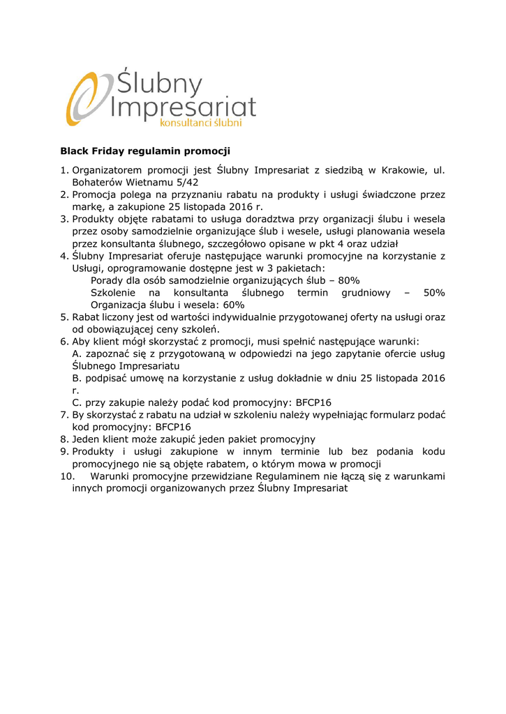 Black Friday regulamin promocji 1. Organizatorem promocji jest Ślubny Impresariat z siedzibą w Krakowie, ul. Bohaterów Wietnamu 5/42 2. Promocja polega na przyznaniu rabatu na produkty i usługi świadczone przez markę, a zakupione 25 listopada 2016 r. 3. Produkty objęte rabatami to usługa doradztwa przy organizacji ślubu i wesela przez osoby samodzielnie organizujące ślub i wesele, usługi planowania wesela przez konsultanta ślubnego, szczegółowo opisane w pkt 4 oraz udział 4. Ślubny Impresariat oferuje następujące warunki promocyjne na korzystanie z Usługi, oprogramowanie dostępne jest w 3 pakietach: Porady dla osób samodzielnie organizujących ślub – 80% Szkolenie na konsultanta ślubnego termin grudniowy – 50% Organizacja ślubu i wesela: 60% 5. Rabat liczony jest od wartości indywidualnie przygotowanej oferty na usługi oraz od obowiązującej ceny szkoleń. 6. Aby klient mógł skorzystać z promocji, musi spełnić następujące warunki: A. zapoznać się z przygotowaną w odpowiedzi na jego zapytanie ofercie usług Ślubnego Impresariatu B. podpisać umowę na korzystanie z usług dokładnie w dniu 25 listopada 2016 r. C. przy zakupie należy podać kod promocyjny: BFCP16 7. By skorzystać z rabatu na udział w szkoleniu należy wypełniając formularz podać kod promocyjny: BFCP16 8. Jeden klient może zakupić jeden pakiet promocyjny 9. Produkty i usługi zakupione w innym terminie lub bez podania kodu promocyjnego nie są objęte rabatem, o którym mowa w promocji 10. Warunki promocyjne przewidziane Regulaminem nie łączą się z warunkami innych promocji organizowanych przez Ślubny Impresariat