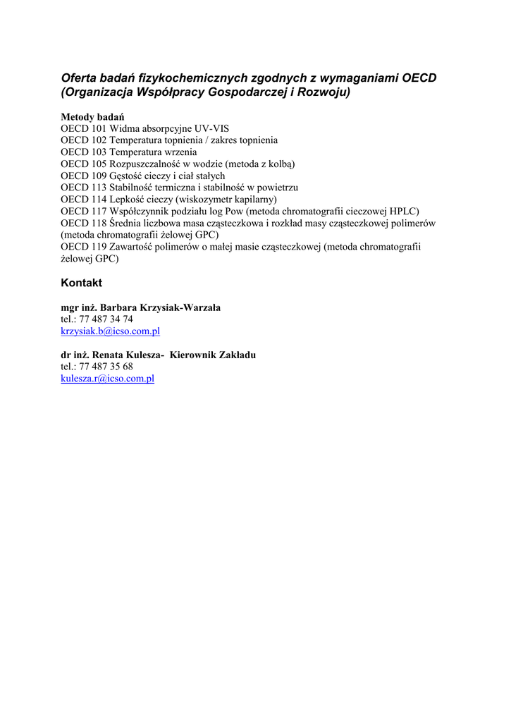 Oferta badań fizykochemicznych zgodnych z wymaganiami OECD (Organizacja Współpracy Gospodarczej i Rozwoju) Metody badań OECD 101 Widma absorpcyjne UV-VIS OECD 102 Temperatura topnienia / zakres topnienia OECD 103 Temperatura wrzenia OECD 105 Rozpuszczalność w wodzie (metoda z kolbą) OECD 109 Gęstość cieczy i ciał stałych OECD 113 Stabilność termiczna i stabilność w powietrzu OECD 114 Lepkość cieczy (wiskozymetr kapilarny) OECD 117 Współczynnik podziału log Pow (metoda chromatografii cieczowej HPLC) OECD 118 Średnia liczbowa masa cząsteczkowa i rozkład masy cząsteczkowej polimerów (metoda chromatografii żelowej GPC) OECD 119 Zawartość polimerów o małej masie cząsteczkowej (metoda chromatografii żelowej GPC) Kontakt mgr inż. Barbara Krzysiak-Warzała tel.: 77 487 34 74 [email protected] dr inż. Renata Kulesza- Kierownik Zakładu tel.: 77 487 35 68 [email protected]