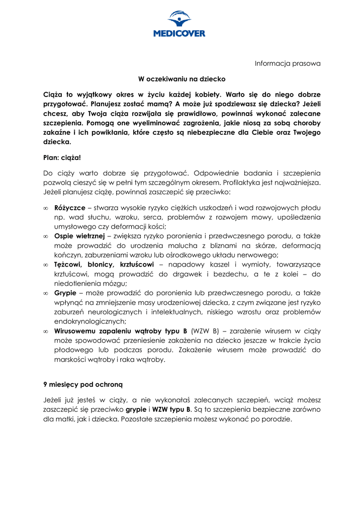 Informacja prasowa W oczekiwaniu na dziecko CiąŜa to wyjątkowy okres w Ŝyciu kaŜdej kobiety. Warto się do niego dobrze przygotować. Planujesz zostać mamą? A moŜe juŜ spodziewasz się dziecka? JeŜeli chcesz, aby Twoja ciąŜa rozwijała się prawidłowo, powinnaś wykonać zalecane szczepienia. Pomogą one wyeliminować zagroŜenia, jakie niosą za sobą choroby zakaźne i ich powikłania, które często są niebezpieczne dla Ciebie oraz Twojego dziecka. Plan: ciąŜa! Do ciąŜy warto dobrze się przygotować. Odpowiednie badania i szczepienia pozwolą cieszyć się w pełni tym szczególnym okresem. Profilaktyka jest najwaŜniejsza. JeŜeli planujesz ciąŜę, powinnaś zaszczepić się przeciwko: • • • • • RóŜyczce – stwarza wysokie sokie ryzyko cięŜkich uszkodzeń i wad rozwojowych płodu np. wad słuchu, wzroku, serca, problemów z rozwojem mowy, upośledzenia umysłowego czy deformacji kości; Ospie wietrznej – zwiększa ryzyko poronienia i przedwczesnego porodu, a takŜe moŜe prowadzić do urodzenia malucha z bliznami na skórze, deformacją kończyn, zaburzeniami wzroku lub ośrodkowego układu nerwowego; TęŜcowi, błonicy, krztuścowi – napadowy kaszel i wymioty, towarzyszące krztuścowi, mogą prowadzić do drgawek i bezdechu, bezdechu, a te z kolei – do niedotlenienia mózgu; Grypie – moŜe prowadzić do poronienia lub przedwczesnego porodu, a takŜe wpłynąć na zmniejszenie masy urodzeniowej dziecka, z czym związane jest ryzyko zaburzeń neurologicznych i intelektualnych, niskiego wzrostu oraz problemów endokrynologicznych; Wirusowemu zapaleniu wątroby typu B (WZW B) – zaraŜenie wirusem w ciąŜy moŜe spowodować przeniesienie zakaŜenia na dziecko jeszcze w trakcie Ŝycia płodowego lub podczas porodu. ZakaŜenie wirusem moŜe prowadzić do marskości wątroby i raka wątroby. wątrob 9 miesięcy pod ochroną JeŜeli juŜ jesteś w ciąŜy, a nie wykonałaś zalecanych szczepień, wciąŜ moŜesz zaszczepić się przeciwko grypie i WZW typu B.. Są to szczepienia bezpieczne zarówno dla matki, jak i dziecka. Pozostałe szczepienia moŜesz wykonać po porodzie. po „Pacjentkom planującym ciąŜę rekomendujemy zaszczepienie się przeciwko tym chorobom, które nabyte podczas ciąŜy, mogą spowodować jej utratę lub powstanie wad rozwojowych dziecka. Będąc w ciąŜy, wciąŜ moŜna wykonać szczepienie przeciwko grypie i WZW typu B. Pozostałe szczepienia warto uzupełnić po porodzie, aby stworzyć ochronny kokon wokół dziecka. Właściwe postępowanie naleŜy ustalić z lekarzem.” Dr. n. med. Lidia Walczak, ginekolog ze Szpitala Medicover. O szczegóły szczepień zapytaj swojego lekarza lekarza prowadzącego Na szczepienia moŜesz umówić się równieŜ do dowolnego Centrum Medicover, pod numerem 500 900 500.