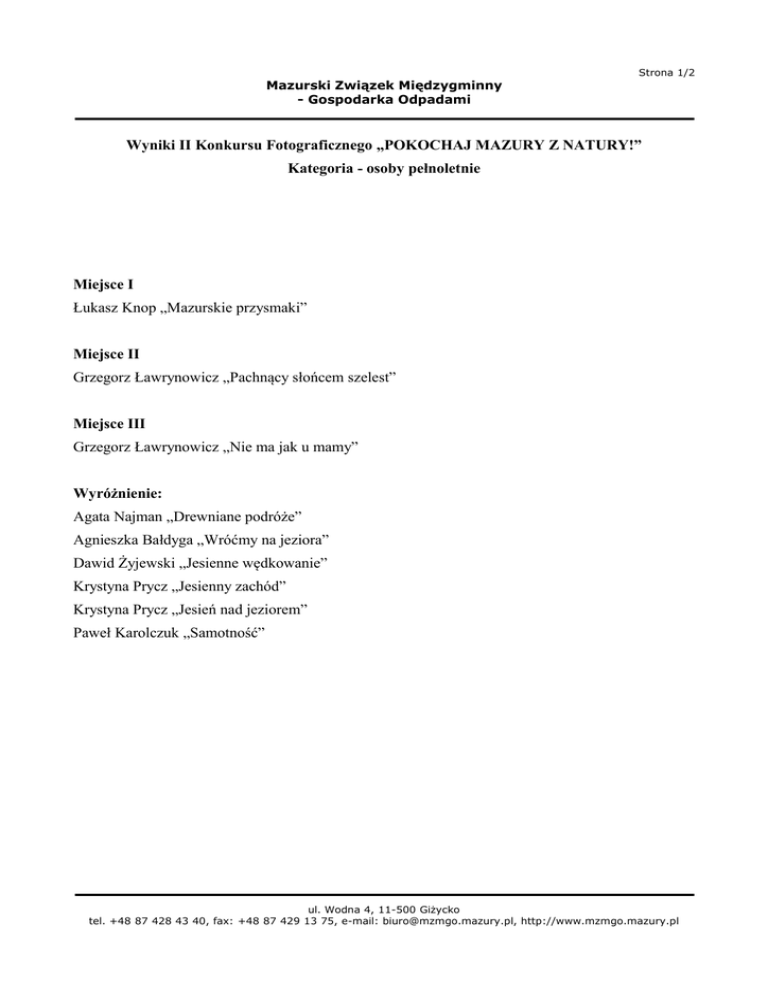 Mazurski Związek Międzygminny - Gospodarka Odpadami Strona 1/2 Wyniki II Konkursu Fotograficznego „POKOCHAJ MAZURY Z NATURY!” Kategoria - osoby pełnoletnie Miejsce I Łukasz Knop „Mazurskie przysmaki” Miejsce II Grzegorz Ławrynowicz „Pachnący słońcem szelest” Miejsce III Grzegorz Ławrynowicz „Nie ma jak u mamy” Wyróżnienie: Agata Najman „Drewniane podróże” Agnieszka Bałdyga „Wróćmy na jeziora” Dawid Żyjewski „Jesienne wędkowanie” Krystyna Prycz „Jesienny zachód” Krystyna Prycz „Jesień nad jeziorem” Paweł Karolczuk „Samotność” ul. Wodna 4, 11-500 Giżycko tel. +48 87 428 43 40, fax: +48 87 429 13 75, e-mail: [email protected], http://www.mzmgo.mazury.pl Mazurski Związek Międzygminny - Gospodarka Odpadami Strona 2/2 Wyniki II Konkursu Fotograficznego „POKOCHAJ MAZURY Z NATURY!” Kategoria - osoby niepełnoletnie Miejsce I Paweł Smoliński „Jesienna szadź” Miejsce II (ex aequo) Adrian Dudek „Cud natury” Lena Darska „Jesienna żabka” Miejsce III (ex aequo) Hubert Patejuk „Grzybki pod jesienną pierzynką” Maciej Bieniek „Jesienny spacer” Wyróżnienie: Laurentyna Cichurska „Kaczy Dołek” Lena Darska „Rosiczka” Mateusz Bohdanowicz „Niedzielny poranek” Paweł Smoliński „Żeremie bobrów” Szymon Wiśniewski „Jesień nad wodą” Szymon Wiśniewski „Jesień” ul. Wodna 4, 11-500 Giżycko tel. +48 87 428 43 40, fax: +48 87 429 13 75, e-mail: [email protected], http://www.mzmgo.mazury.pl