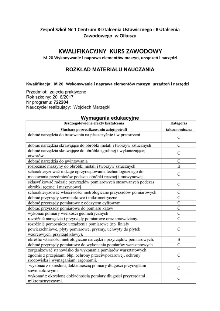 Zespół Szkół Nr 1 Centrum Kształcenia Ustawicznego i Kształcenia Zawodowego w Olkuszu KWALIFIKACYJNY KURS ZAWODOWY M.20 Wykonywanie i naprawa elementów maszyn, urządzeń i narzędzi ROZKŁAD MATERIAŁU NAUCZANIA Kwalifikacja: M.20 Wykonywanie i naprawa elementów maszyn, urządzeń i narzędzi Przedmiot: zajęcia praktyczne Rok szkolny: 2016/2017 Nr programu: 722204 Nauczyciel realizujący: Wojciech Marzęcki Wymagania edukacyjne Uszczegółowione efekty kształcenia Kategoria Słuchacz po zrealizowaniu zajęć potrafi taksonomiczna dobrać narzędzia do trasowania na płaszczyźnie i w przestrzeni dobrać narzędzia skrawające do obróbki metali i tworzyw sztucznych dobrać narzędzia skrawające do obróbki zgrubnej i wykańczającej otworów dobrać narzędzia do gwintowania rozpoznać maszyny do obróbki metali i tworzyw sztucznych scharakteryzować rodzaje oprzyrządowania technologicznego do mocowania przedmiotów podczas obróbki ręcznej i maszynowej sklasyfikować rodzaje przyrządów pomiarowych stosowanych podczas obróbki ręcznej i maszynowej scharakteryzować właściwości metrologiczne przyrządów pomiarowych dobrać przyrządy suwmiarkowe i mikrometryczne dobrać przyrządy pomiarowe z odczytem cyfrowym dobrać przyrządy pomiarowe do pomiaru kątów wykonać pomiary wielkości geometrycznych rozróżnić narzędzia i przyrządy pomiarowe oraz sprawdziany. rozróżnić pomocnicze urządzenia pomiarowe (np. liniały powierzchniowe, płyty pomiarowe, pryzmy, uchwyty do płytek wzorcowych, przyrząd kłowy). określić własności metrologiczne narzędzi i przyrządów pomiarowych. dobrać przyrządy pomiarowe do wykonania pomiarów warsztatowych. zorganizować stanowisko do wykonania pomiarów warsztatowych zgodnie z przepisami bhp, ochrony przeciwpożarowej, ochrony środowiska i wymaganiami ergonomii. wykonać z określoną dokładnością pomiary długości przyrządami suwmiarkowymi. wykonać z określoną dokładnością pomiary długości przyrządami mikrometrycznymi. C C C C B C C C C C C C C C B C C C C wykonać z określoną dokładnością pomiary długości za pomocą płytek wzorcowych. wykonać z określoną dokładnością pomiary długości za pomocą czujnika zegarowego. wykonać z określoną dokładnością pomiary kątów. sprawdzić płaskość powierzchni. sprawdzić wielkości szczelin i promieni zaokrągleń. sprawdzić parametry geometryczne detali za pomocą sprawdzianów. rozróżnić narzędzia do wykonywania prac z zakresu obróbki ręcznej. rozróżnić urządzenia do wykonywania prac z zakresu obróbki ręcznej. dobrać narzędzia, przyrządy i urządzenia do wykonania prac z zakresu obróbki ręcznej. wykonać trasowanie na płaszczyźnie i trasowanie przestrzenne. wykonać piłowanie powierzchni płaskich i kształtowych. wykonać ścinanie, wycinanie i przecinanie materiałów . wykonać gięcie, prostowanie materiałów. wykonać wiercenie , nawiercanie, pogłębianie i rozwiercanie otworów . wykonać skrobanie, docieranie, polerowanie. wykonać obróbkę ręczną tworzyw sztucznych. zorganizować stanowisko do wykonania prac z zakresu obróbki ręcznej zgodnie z przepisami bhp, ochrony przeciwpożarowej, ochrony środowiska i wymaganiami ergonomii. wykonać prace z zakresu obróbki ręcznej zachowując właściwą staranność i dokładność oraz przestrzegając przepisów bhp, ochrony przeciwpożarowej i ochrony środowiska. scharakteryzować parametry jakościowe wyrobów wykonanych metodą obróbki ręcznej. określić parametry jakościowe detalu (wyrobu) wykonanego metodą obróbki ręcznej. ocenić jakość wykonanych prac z zakresu obróbki ręcznej. rozróżnić narzędzia do wykonywania prac z zakresu obróbki maszynowej. rozróżnić urządzenia do wykonywania prac z zakresu obróbki maszynowej. dobrać narzędzia, przyrządy i urządzenia do wykonania prac z zakresu obróbki maszynowej. wykonać toczenie. wykonać frezowanie. wykonać struganie. wykonać szlifowanie. zorganizować stanowisko do wykonania prac z zakresu obróbki maszynowej zgodnie z przepisami bhp, ochrony przeciwpożarowej, ochrony środowiska i wymaganiami ergonomii. wykonać prace z zakresu obróbki maszynowej zachowując właściwą staranność i dokładność oraz przestrzegając przepisów bhp, ochrony przeciwpożarowej i ochrony środowiska. scharakteryzować parametry jakościowe wyrobów wykonanych metodą obróbki maszynowej. określić parametry jakościowe detalu (wyrobu) wykonanego metodą C C C C C C C C C C C C C C C C C C C C C C C C C C C C C C C C obróbki maszynowej. ocenić jakość wykonanych prac z zakresu obróbki maszynowej. dopasować kształty łączonych materiałów. oczyścić powierzchnie łączonych materiałów. rozróżnić narzędzia do wykonywania połączeń materiałów. rozróżnić urządzenia do wykonywania połączeń materiałów. dobrać narzędzia, przyrządy i urządzenia do wykonania połączenia materiałów. wykonać połączenia kształtowe materiałów. wykonać połączenia spajane materiałów . wykonać połączenia wciskowe materiałów. wykonać połączenia sprężyste materiałów. wykonać połączenia gwintowe materiałów. wykonać połączenia rurowe materiałów. zorganizować stanowisko do wykonania prac z zakresu wykonywania połączeń materiałów zgodnie z przepisami bhp, ochrony przeciwpożarowej, ochrony środowiska i wymaganiami ergonomii. wykonać połączenia materiałów zachowując właściwą staranność i dokładność oraz przestrzegając przepisów bhp, ochrony przeciwpożarowej i ochrony środowiska . rozróżnić i scharakteryzować parametry jakościowe połączeń materiałów. określić parametry jakościowe wykonywanego połączenia materiałów . ocenić jakość wykonanych połączeń materiałów. ocenić wizualnie stan powierzchni elementów maszyn, urządzeń oraz narzędzi. określić nominalne wartości parametrów elementów maszyn i urządzeń oraz narzę