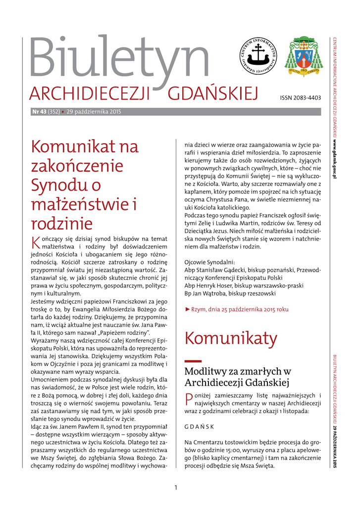 Nr 43 (352) • 29 października 2015 Komunikat na zakończenie Synodu o małżeństwie i rodzinie K nia dzieci w wierze oraz zaangażowania w życie parafii i wspierania dzieł miłosierdzia. To zaproszenie kierujemy także do osób rozwiedzionych, żyjących w ponownych związkach cywilnych, które – choć nie przystępują do Komunii Świętej – nie są wykluczone z Kościoła. Warto, aby szczerze rozmawiały one z kapłanem, który pomoże im spojrzeć na ich sytuację oczyma Chrystusa Pana, w świetle niezmiennej nauki Kościoła katolickiego. Podczas tego synodu papież Franciszek ogłosił świętymi Zelię i Ludwika Martin, rodziców św. Teresy od Dzieciątka Jezus. Niech miłość małżeńska i rodzicielska nowych Świętych stanie się wzorem i natchnieniem dla małżeństw i rodzin. ończący się dzisiaj synod biskupów na temat małżeństwa i rodziny był doświadczeniem jedności Kościoła i ubogacaniem się Jego różnorodnością. Kościół szczerze zatroskany o rodzinę przypomniał światu jej niezastąpioną wartość. Zastanawiał się, w jaki sposób skutecznie chronić jej prawa w życiu społecznym, gospodarczym, politycznym i kulturalnym. Jesteśmy wdzięczni papieżowi Franciszkowi za jego troskę o to, by Ewangelia Miłosierdzia Bożego dotarła do każdej rodziny. Dziękujemy, że przypomina nam, iż wciąż aktualne jest nauczanie św. Jana Pawła II, którego sam nazwał „Papieżem rodziny”. Wyrażamy naszą wdzięczność całej Konferencji Episkopatu Polski, która nas upoważniła do reprezentowania Jej stanowiska. Dziękujemy wszystkim Polakom w Ojczyźnie i poza jej granicami za modlitwę i okazywane nam wyrazy wsparcia. Umocnieniem podczas synodalnej dyskusji była dla nas świadomość, że w Polsce jest wiele rodzin, które z Bożą pomocą, w dobrej i złej doli, każdego dnia troszczą się o wierność swojemu powołaniu. Teraz zaś zastanawiamy się nad tym, w jaki sposób przesłanie tego synodu wprowadzić w życie. Idąc za św. Janem Pawłem II, synod ten przypomniał – dostępne wszystkim wierzącym – sposoby aktywnego uczestnictwa w życiu Kościoła. Dlatego też zapraszamy wszystkich do regularnego uczestnictwa we Mszy Świętej, do zgłębiania Słowa Bożego. Zachęcamy rodziny do wspólnej modlitwy i wychowa- Centrum Informacyjne Archidiecezji Gdańskiej www.gdansk.gosc.pl ISSN 2083-4403 Ojcowie Synodalni: Abp Stanisław Gądecki, biskup poznański, Przewodniczący Konferencji Episkopatu Polski Abp Henryk Hoser, biskup warszawsko-praski Bp Jan Wątroba, biskup rzeszowski ►►Rzym, dnia 25 października 2015 roku Komunikaty P oniżej zamieszczamy listę najważniejszych i największych cmentarzy w naszej Archidiecezji wraz z godzinami celebracji z okazji 1 listopada: GDAŃSK Na Cmentarzu Łostowickim będzie procesja do grobów o godzinie 15:00, wyruszy ona z placu apelowego (blisko kaplicy cmentarnej) i tam na zakończenie procesji odbędzie się Msza Święta. 1 Biuletyn Archidiecezji Gdańskiej 29 października 2015 Modlitwy za zmarłych w Archidiecezji Gdańskiej Centrum Informacyjne Archidiecezji Gdańskiej www.gdansk.gosc.pl nr 43 (352) Na Cmentarzu Garnizonowym o godz. 14.00 procesja i Msza św. Na Cmentarzu Parafialnym (ul. Gdańska) o godz. 14.00 Msza św. Na Cmentarzu Srebrzysko o godz. 15.00 procesja od bramy głównej, a po niej Msza św. przy krzyżu. RUMIA Na Cmentarzu w Starej Rumi procesja o 11.30 i Msza św. o 12.30. Na Cmentarzu Komunalnym procesja wyrusza o 13:30, natomiast Msza św. o godz. 14:30. SOPOT Na Cmentarzu Komunalnym Msza św. o godz. 12.30 (w kościele) w intencji zmarłych spoczywających na cmentarzach sopockich. Po Mszy św. procesja żałobna do pięciu stacji na cmentarzu Komunalnym. Na cmentarzu Katolickim Msza św. za zmarłych rozpocznie się o godz. 15.00, a po niej nastąpi procesja. Zaduszki Morskie za zmarłych marynarzy i tych, którzy nie wrócili z morza odbędą się 2 listopada br. o godz. 20.00 na plaży w Sopocie, przy kaplicy „O szczęśliwy powrót” (obok przystani rybackiej). WEJHEROWO Na Nowym Cmentarzu Msza św. o godz. 14.00, a pół godziny przed nią procesja. W poniedziałek 2 XI Dzień Zaduszny – Wszystkich Wiernych Zmarłych – w tym dniu Msza św. za zmarłych na Starym Cmentarzu o godz. 16.00. Na Cmentarzu Oliwskim procesja z modlitwą za zmarłych rozpocznie się o godz. 15.00 od kaplicy cmentarnej. Po zakończeniu procesji przy kaplicy zostanie odprawiona Msza św. w intencji zmarłych. Na Cmentarzu Zaspa o godz. 14.30 różaniec oraz o 15.00 Msza św. Na Cmentarzu Nieistniejących Cmentarzy przy ul. 3 Maja o godz. 12.00 tradycyjna modlitwa międzywyznaniowa. Litania Miast, czyli spotkanie modlitewne organizowane z myślą o młodych, odbędzie się w godz. 20.00 na placu Solidarności, pod pomnikiem Poległych Stoczniowców. Uczestnicy proszeni są o przyniesienie ze sobą zniczy. Biuletyn Archidiecezji Gdańskiej 29 października 2015 GDYNIA Na Cmentarz Komunalnym Mały Kack (ul. Spokojna) procesja o godz. 14.00 i Msza św. o godz. 14.30. Na Cmentarzu Komunalnym Kosakowo Msza św. o godz.13.00. Procesja żałobna na cmentarz wyruszy z kościoła w Kosakowie o godz. 12.30. Na Cmentarzu Witomińskim o godz. 14.30 procesja, a po niej Msza św. Msza św. transmitowana przez TVP POLONIA P ragniemy poinformować, że w Uroczystość Wszystkich Świętych, 1 listopada br. o godz. 13.00 w kościele pw. Św. Ojca Pio w Gdańsku-Ujeścisku, sprawowana będzie Msza święta transmitowana przez TVP Polonia, której przewodniczyć będzie Arcybiskup Metropolita Gdański Sławoj Leszek Głódź. Na Cmentarzu Parafialnym w Gdyni-Chylonii (ul. Pelplińska) o godz. 14:30 procesja modlitewna, a następnie zostanie odprawiona Msza św. przy kaplicy cmentarnej. Na Cmentarzu Parafialnym w Gdyni-Oksywiu Msza św. o godz. 14.00. Na Cmentarzu Parafialnym w Gdyni-Obłużu o godz. 14.30 różaniec za zmarłych, a o godz. 15.00 Msza św. Po niej procesja z modlitwami za zm