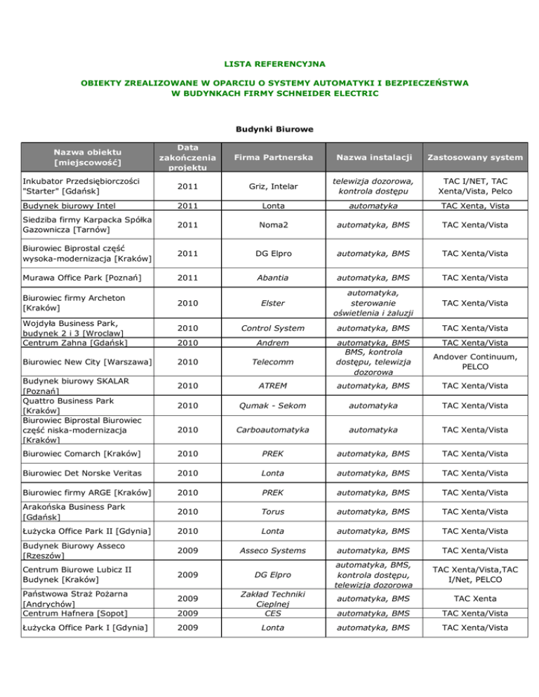 LISTA REFERENCYJNA OBIEKTY ZREALIZOWANE W OPARCIU O SYSTEMY AUTOMATYKI I BEZPIECZE STWA W BUDYNKACH FIRMY SCHNEIDER ELECTRIC Budynki Biurowe Data zako czenia projektu Firma Partnerska Nazwa instalacji Zastosowany system Inkubator Przedsi biorczo ci "Starter" [Gda sk] 2011 Griz, Intelar telewizja dozorowa, kontrola dost pu TAC I/NET, TAC Xenta/Vista, Pelco Budynek biurowy Intel 2011 Lonta automatyka TAC Xenta, Vista Siedziba firmy Karpacka Spó ka Gazownicza [Tarnów] 2011 Noma2 automatyka, BMS TAC Xenta/Vista Biurowiec Biprostal cz wysoka-modernizacja [Kraków] 2011 DG Elpro automatyka, BMS TAC Xenta/Vista Murawa Office Park [Pozna ] 2011 Abantia automatyka, BMS TAC Xenta/Vista Biurowiec firmy Archeton [Kraków] 2010 Elster 2010 Control System automatyka, BMS TAC Xenta/Vista 2010 Andrem TAC Xenta/Vista 2010 Telecomm automatyka, BMS BMS, kontrola dost pu, telewizja dozorowa 2010 ATREM automatyka, BMS TAC Xenta/Vista 2010 Qumak - Sekom automatyka TAC Xenta/Vista 2010 Carboautomatyka automatyka TAC Xenta/Vista Biurowiec Comarch [Kraków] 2010 PREK automatyka, BMS TAC Xenta/Vista Biurowiec Det Norske Veritas 2010 Lonta automatyka, BMS TAC Xenta/Vista Biurowiec firmy ARGE [Kraków] 2010 PREK automatyka, BMS TAC Xenta/Vista Arako ska Business Park [Gda sk] 2010 Torus automatyka, BMS TAC Xenta/Vista 2010 Lonta automatyka, BMS TAC Xenta/Vista Budynek Biurowy Asseco [Rzeszów] 2009 Asseco Systems automatyka, BMS TAC Xenta/Vista Centrum Biurowe Lubicz II Budynek [Kraków] 2009 DG Elpro automatyka, BMS, kontrola dost pu, telewizja dozorowa TAC Xenta/Vista,TAC I/Net, PELCO automatyka, BMS TAC Xenta automatyka, BMS TAC Xenta/Vista automatyka, BMS TAC Xenta/Vista Nazwa obiektu [miejscowo ] Wojdy a Business Park, budynek 2 i 3 [Wroclaw] Centrum Zahna [Gda sk] Biurowiec New City [Warszawa] Budynek biurowy SKALAR [Pozna ] Quattro Business Park [Kraków] Biurowiec Biprostal Biurowiec cz niska-modernizacja [Kraków] ycka Office Park II [Gdynia] Pa stwowa Stra Po arna [Andrychów] Centrum Hafnera [Sopot] ycka Office Park I [Gdynia] 2009 Zak ad Techniki Cieplnej CES 2009 Lonta 2009 automatyka, sterowanie wietlenia i aluzji TAC Xenta/Vista Andover Continuum, PELCO Arko ska Business Park [Gda sk] 2009 Torus automatyka, BMS TAC Xenta/Vista MILLENNIUM TOWER II budynek biurowy [Wroc aw] 2008 Mercury Engineering, PREK automatyka, BMS TAC Xenta/Vista Centrum Biznesowe Ok cie AEROPARK [Warszawa] 2008 Coral automatyka, BMS TAC Xenta/Vista Arko ska Business Park-bud nr 1 i 2 [Gda sk] 2008 Torus automatyka, BMS TAC Xenta/Vista Centrum Haffnera (Budynek Biurowo-Parkingowy) [Sopot] 2008 CES automatyka, BMS TAC Xenta/Vista Rondo Business Park [Kraków] 2008 Asseco Systems automatyka, BMS TAC Xenta/Vista 2008 Lonta automatyka, BMS TAC Xenta/Vista 2008 Proekoterm automatyka, BMS TAC Xenta/Vista 2008 Mercury Engineering Polska automatyka, BMS TAC Xenta/Vista 2007 Mercury Engineering, Control System automatyka, BMS TAC Xenta/Vista 2007 Qumak-Sekom, Digi Control TAC Xenta/Vista, TAC I/Net 2007 G4S automatyka, BMS, kontrola dost pu kontrola dost pu, telewizja dozorowa GTC 'AEROPARK' [Warszawa] 2007 Coral automatyka TAC Xenta/Vista ANDERSIA TOWER budynek wielofunkcyjny [Pozna ] 2007 Qumak-Sekom automatyka, BMS Andover Continuum Siedziba Firmy AXA Warsaw Trade Tower [Warszawa] 2007 Qumak-Sekom automatyka, BMS TAC Xenta/Vista 2005 GTI automatyka,BMS TAC Xenta/Vista 2005 Integrator automatyka,BMS TAC Xenta/Vista Centrum Systemów Komputerowych 'ZETO' [Kielce] 2005 ZETO Kielce kontrola dost pu TAC I/Net Budynek biurowy 'Zau ek Pi kna' [Warszawa] 2005 Control System automatyka, BMS TAC Xenta/Vista Budynek biurowy 'CENTRUM JASNA' [Warszawa] 2005 Invar Integracje Lonta Alarmton automatyka, BMS TAC Xenta/ Vista, TAC I/Net, PELCO 'CROWN POINT Business Center [Warszawa] 2004 Control System automatyka, BMS TAC Xenta/Vista „CROWN TOWER" Business Center [Warszawa] 2004 Control System automatyka, BMS TAC Xenta/Vista Budynek wielofunkcyjny 'Stawki 40' [Warszawa] 2004 Noma2 automatyka, BMS Andover Continuum Budynek biurowo-handlowy 'Daimler-Chrysler' [Warszawa] 2004 Tradex Eco automatyka, BMS TAC Xenta/Vista ycka Office Park, budynek 1 i2 [Gdynia] Park Przemys owy EuroCentrum [Katowice] Wi niowy Business Park [Warszawa] BEMA PLAZA Centrum biurowe [Wroc aw] GTC GLOBIS centrum biurowe [Wroc aw] Siedziba firmy ‘X-Pon Card' [Warszawa] Budynek biurowy ‘TORUS' [Gda sk] Budynek biurowy 'VECTRA' [Gdynia] Andover Continuum Dom Dochodowy Plac Trzech Krzy y [Warszawa] 2004 Interior automatyka, BMS Andover Continuum TP Internet ul. Domaniewska 41 [Warszawa] 2003 ATM kontrola dost pu Andover Continuum Budynek biurowy 'Intraco I' [Warszawa] 2003 ASU automatyka, BMS TAC Xenta/Vista Budynek Biurowy 'Millennium Plaza' [Warszawa] 2003 Decsoft kontrola dost pu, telewizja dozorowa Andover Continuum, PELCO Budynek Biurowy 'Antares' [Warszawa] 2003 Control System automatyka, BMS TAC Xenta/Vista Budynek biurowy 'PROKOM' siedziba firmy [Gdynia] 2003 Prokom Software automatyka TAC Xenta Budynek biurowy PGNiG [Warszawa] 2003 BIATEL INFO Automatyka automatyka, BMS Andover Continuum 'Business Center Bitwy Warszawskiej' [Warszawa] 2002 TAC Mercury Engineering automatyka, BMS TAC Xenta/Vista 2002 AMK automatyka Andover Continuum 2002 Elster Network Services Partner TAC El-kar automatyka TAC Xenta automatyka TAC Xenta automatyka, BMS TAC Xenta/Vista AMK S.A. - Siedziba firmy [Kraków] 'Pro-Serw' [Kraków] ATAL centrum biurowologistyczne [Wroc aw] 'Kraków Business Park' [Zabierzów] TP Internet, ul. Czackiego [Warszawa] TP Internet ul. Jana Paw a II [Warszawa] TP Internet, ul. Prosta [Warszawa] ATM S.A. - Siedziba firmy, [Warszawa] Budynek biurowy Centrali Handlu Zagranicznego 'CENTRUM' [Katowice] Centrum Biurowe 'Euromarket' [Kraków] Centrum Biurowe 'LUBICZ' [Kraków] Budynek biurowy ‘Toyota' [Warszawa] Budynek Biurowy 'Alfa Plaza' [Gdynia] Budynek biurowy 'Sienna 75 Center' [Warszawa] SEKOM S.A.- Siedziba firmy, [Warszawa] 2002 2002 2002 ATM kontrola dost pu Andov
